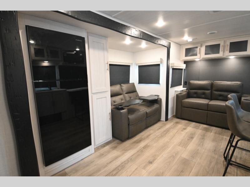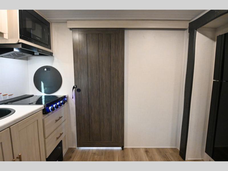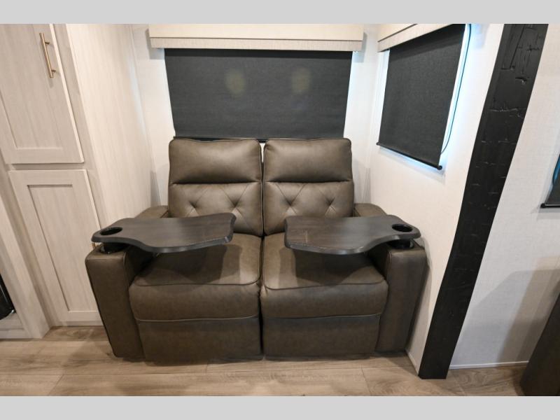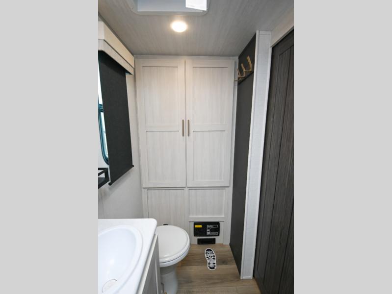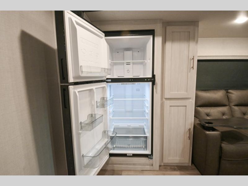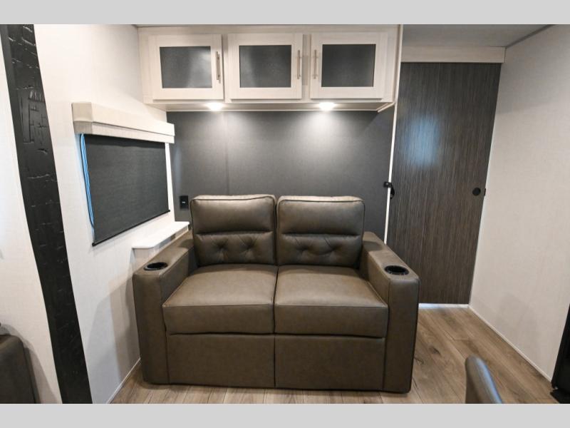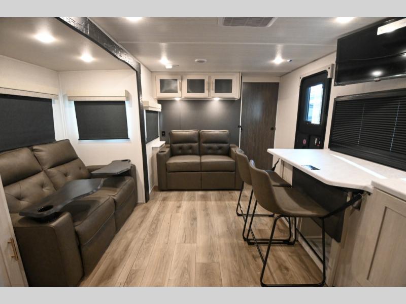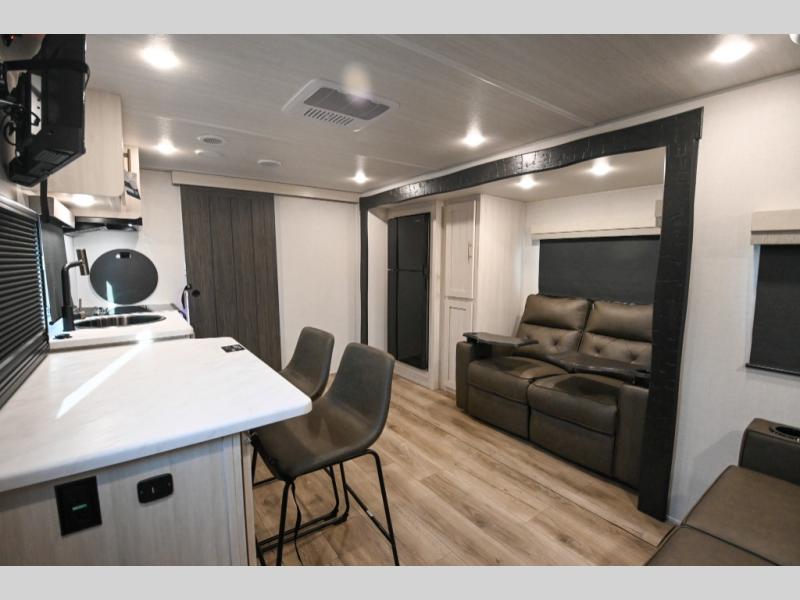 This travel trailer offers a comfortable and convenient layout rear bathroom with a linen closet, a private, well-appointed space for personal care with storage for linens, ensuring comfort on every journey. In the living room/kitchen combined area, you will find theater seating, a tri-fold sofa that offers versatile seating and additional space for guests or relaxation, adaptable to your travel needs, a fridge, a pantry for culinary supplies, an air fryer /microwave, a flip-up window, and overhead cabinets. The front bedroom will be your sanctuary of relaxation after a long day of exploring. The outside kitchen is the cherry on top, since it is ideal for alfresco cooking and dining, perfect for savoring meals amidst scenic surroundings and enjoying the outdoors with loved ones!