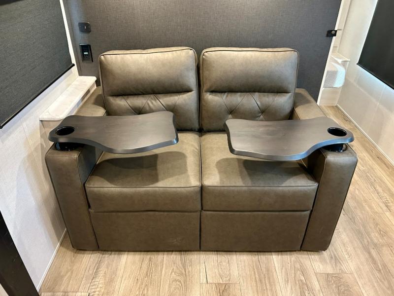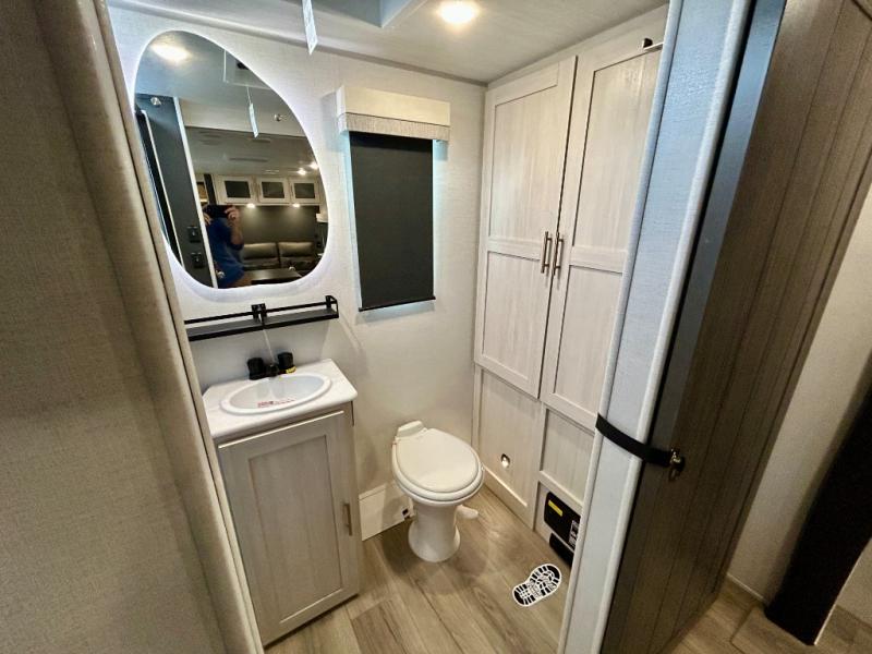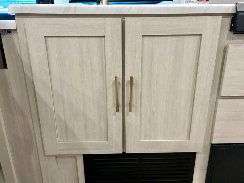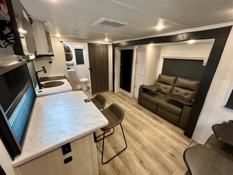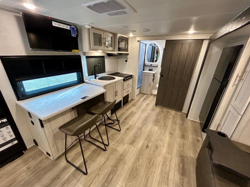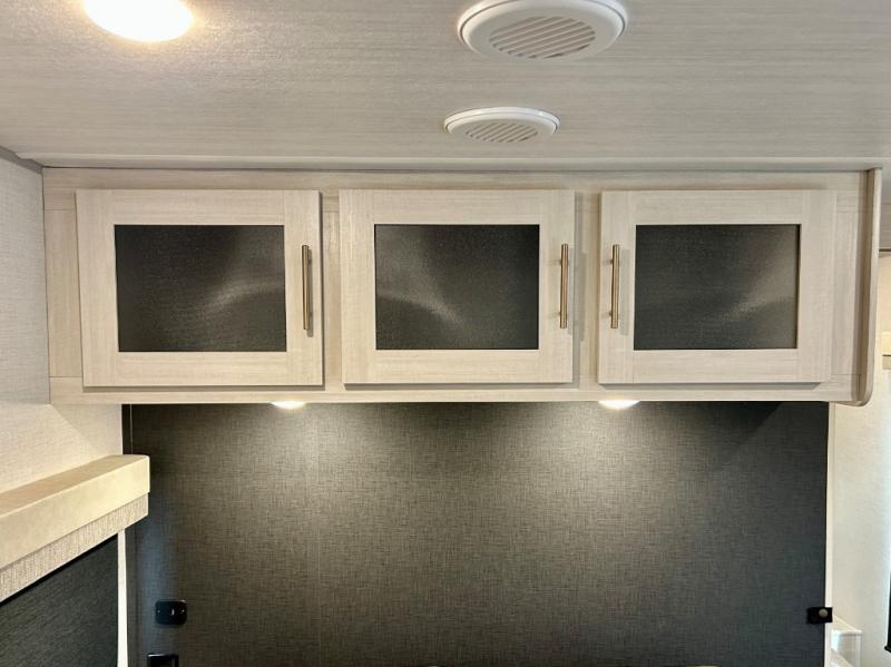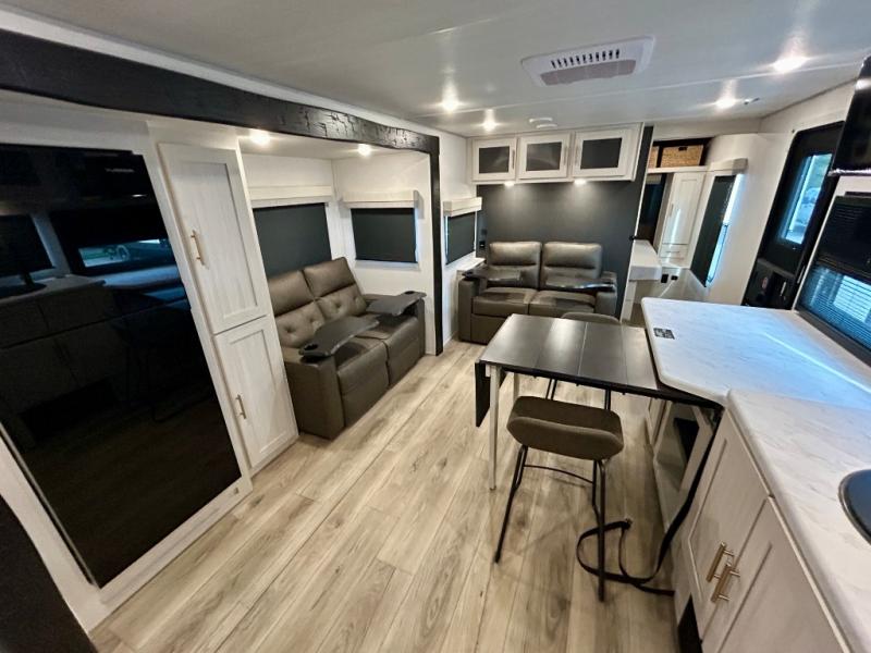 This travel trailer offers a comfortable and convenient layout rear bathroom with a linen closet, a private, well-appointed space for personal care with storage for linens, ensuring comfort on every journey. In the living room/kitchen combined area, you will find theater seating, a tri-fold sofa that offers versatile seating and additional space for guests or relaxation, adaptable to your travel needs, a fridge, a pantry for culinary supplies, an air fryer /microwave, a flip-up window, and overhead cabinets. The front bedroom will be your sanctuary of relaxation after a long day of exploring. The outside kitchen is the cherry on top, since it is ideal for alfresco cooking and dining, perfect for savoring meals amidst scenic surroundings and enjoying the outdoors with loved ones!