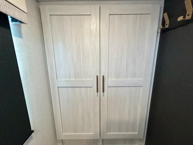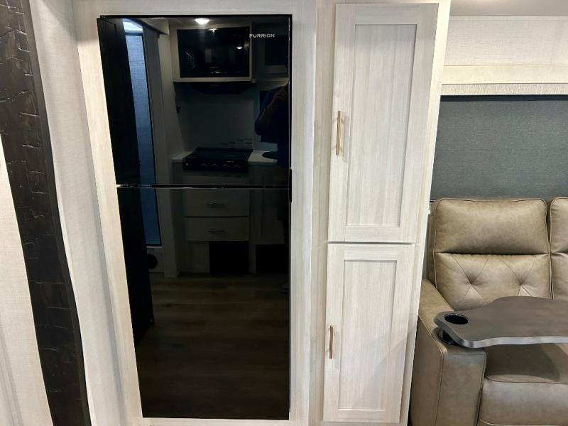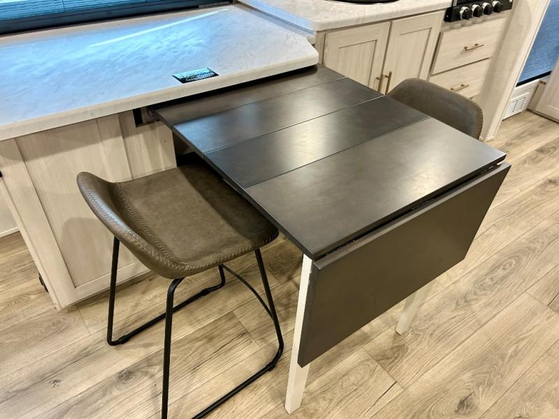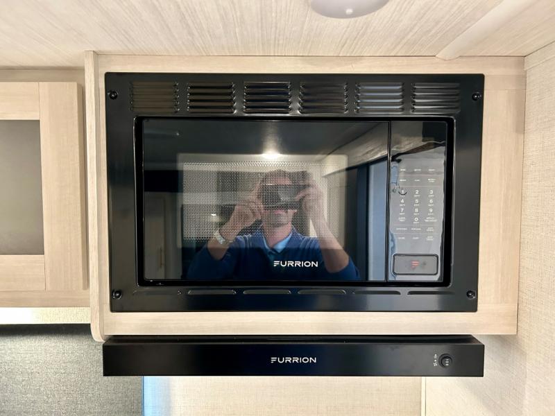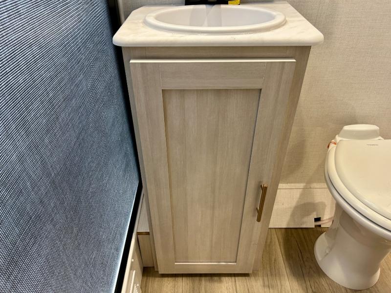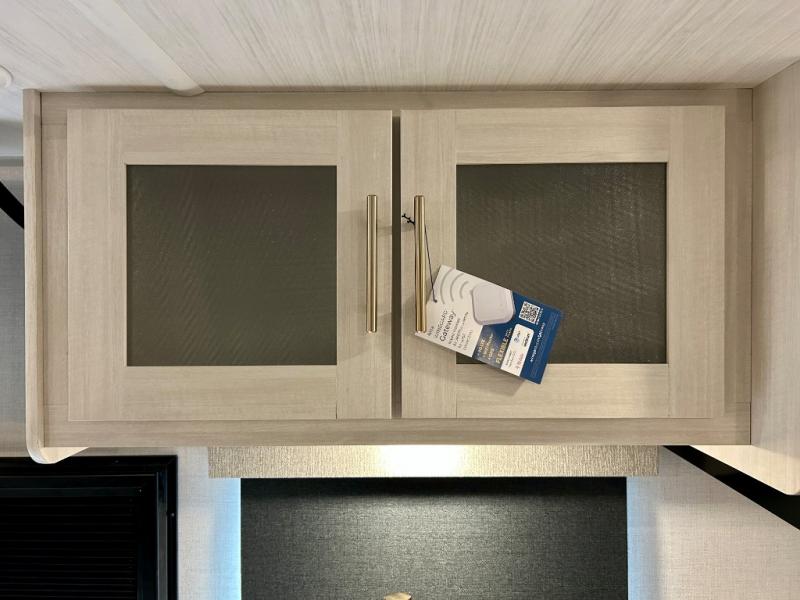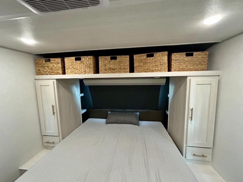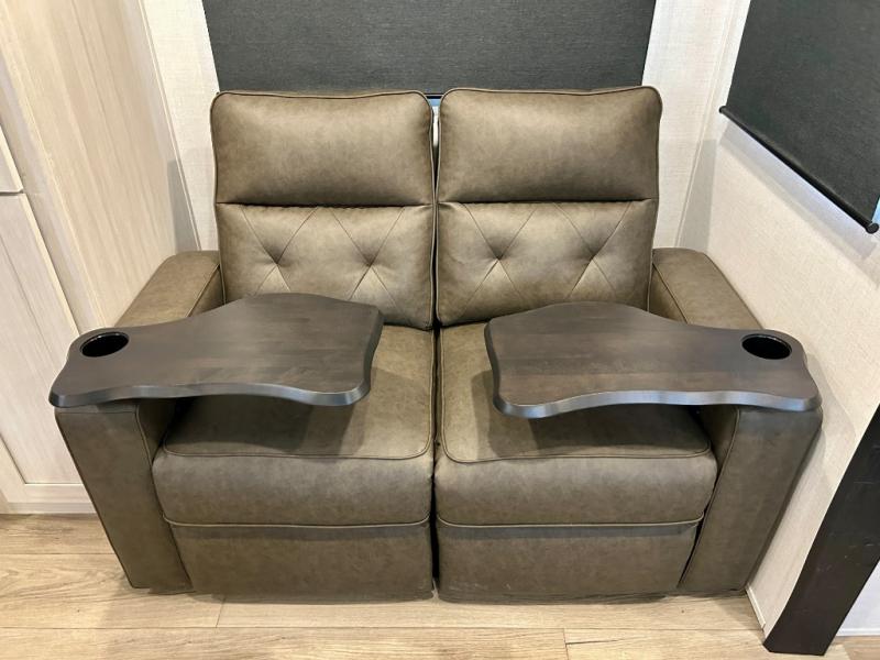 This travel trailer offers a comfortable and convenient layout rear bathroom with a linen closet, a private, well-appointed space for personal care with storage for linens, ensuring comfort on every journey. In the living room/kitchen combined area, you will find theater seating, a tri-fold sofa that offers versatile seating and additional space for guests or relaxation, adaptable to your travel needs, a fridge, a pantry for culinary supplies, an air fryer /microwave, a flip-up window, and overhead cabinets. The front bedroom will be your sanctuary of relaxation after a long day of exploring. The outside kitchen is the cherry on top, since it is ideal for alfresco cooking and dining, perfect for savoring meals amidst scenic surroundings and enjoying the outdoors with loved ones!