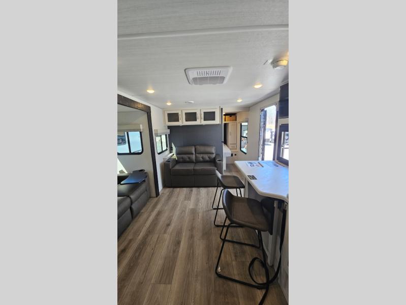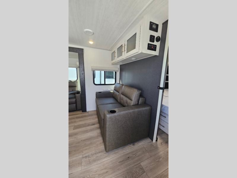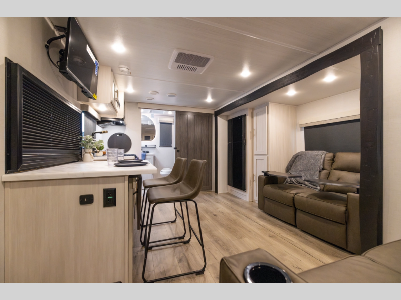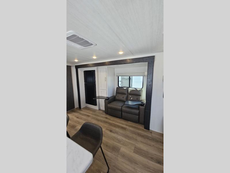 This travel trailer offers a comfortable and convenient layout rear bathroom with a linen closet, a private, well-appointed space for personal care with storage for linens, ensuring comfort on every journey. In the living room/kitchen combined area, you will find theater seating, a tri-fold sofa that offers versatile seating and additional space for guests or relaxation, adaptable to your travel needs, a fridge, a pantry for culinary supplies, an air fryer /microwave, a flip-up window, and overhead cabinets. The front bedroom will be your sanctuary of relaxation after a long day of exploring. The outside kitchen is the cherry on top, since it is ideal for alfresco cooking and dining, perfect for savoring meals amidst scenic surroundings and enjoying the outdoors with loved ones!