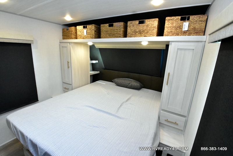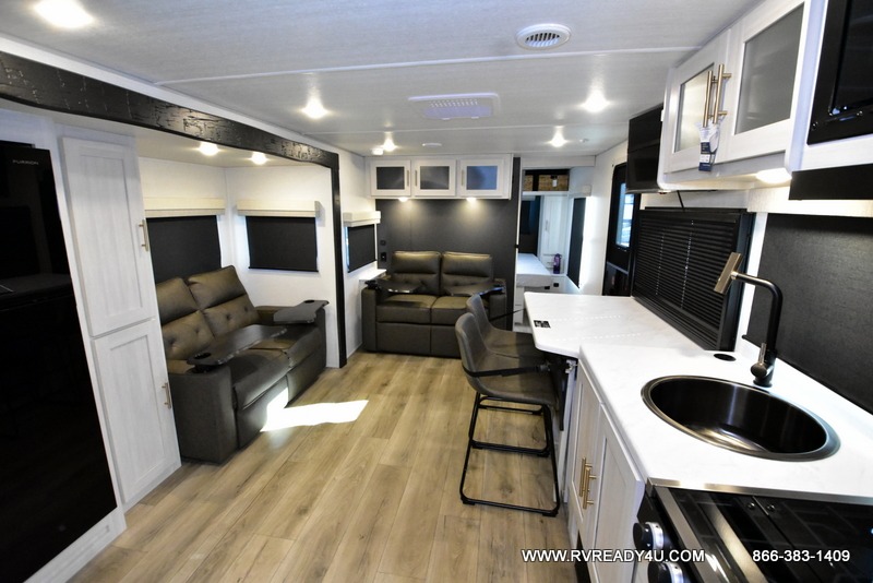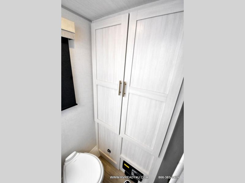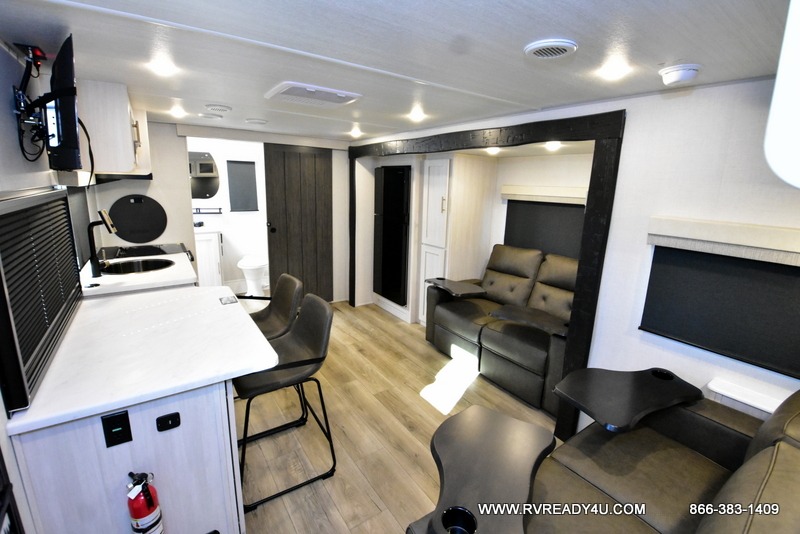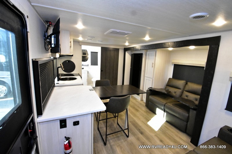 This travel trailer offers a comfortable and convenient layout rear bathroom with a linen closet, a private, well-appointed space for personal care with storage for linens, ensuring comfort on every journey. In the living room/kitchen combined area, you will find theater seating, a tri-fold sofa that offers versatile seating and additional space for guests or relaxation, adaptable to your travel needs, a fridge, a pantry for culinary supplies, an air fryer /microwave, a flip-up window, and overhead cabinets. The front bedroom will be your sanctuary of relaxation after a long day of exploring. The outside kitchen is the cherry on top, since it is ideal for alfresco cooking and dining, perfect for savoring meals amidst scenic surroundings and enjoying the outdoors with loved ones!