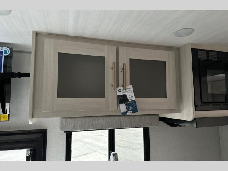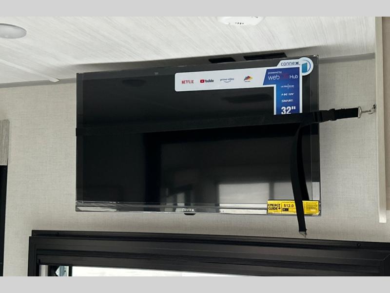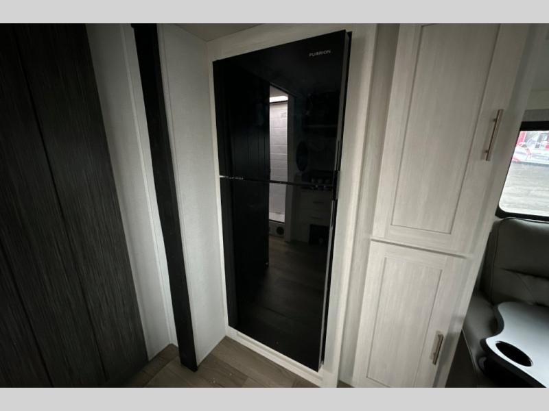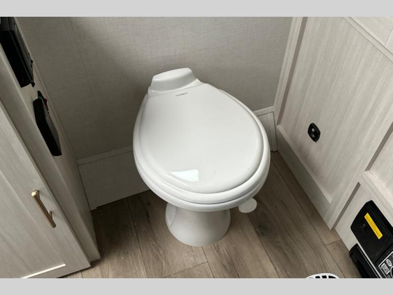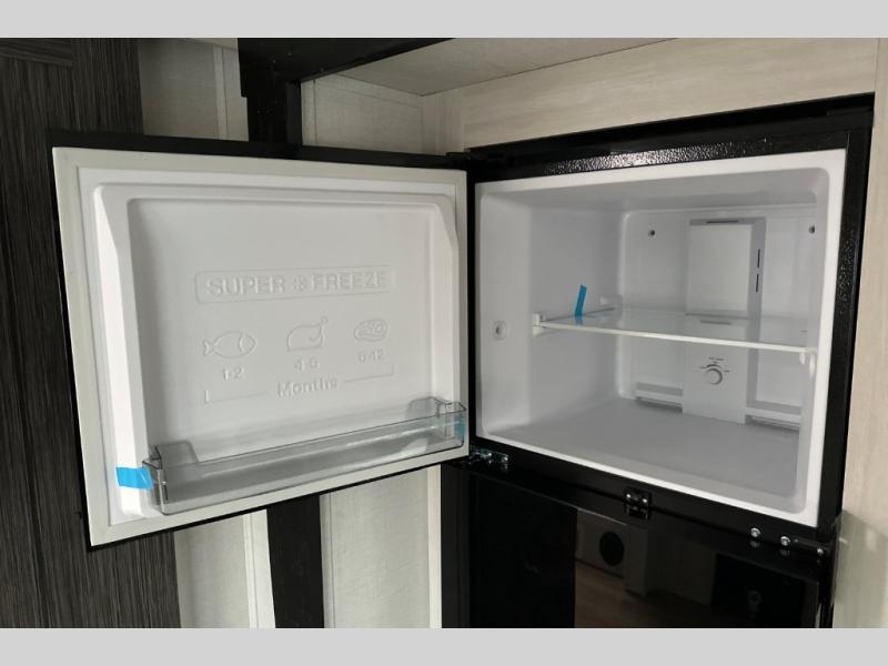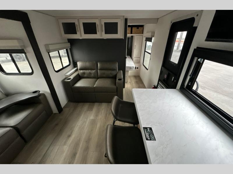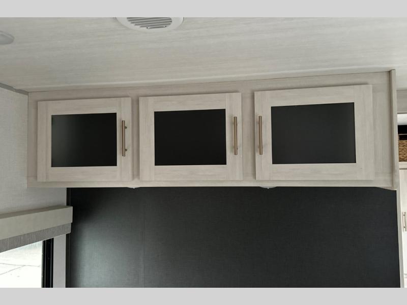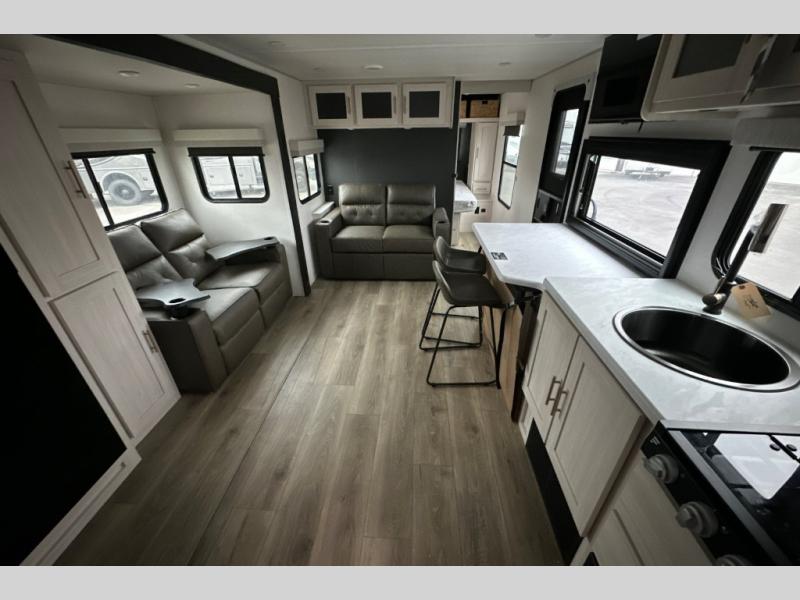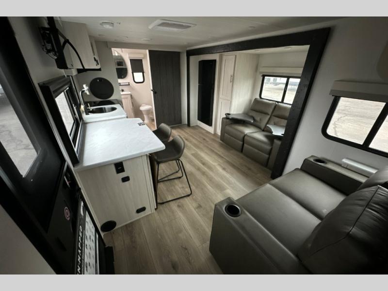 This travel trailer offers a comfortable and convenient layout rear bathroom with a linen closet, a private, well-appointed space for personal care with storage for linens, ensuring comfort on every journey. In the living room/kitchen combined area, you will find theater seating, a tri-fold sofa that offers versatile seating and additional space for guests or relaxation, adaptable to your travel needs, a fridge, a pantry for culinary supplies, an air fryer /microwave, a flip-up window, and overhead cabinets. The front bedroom will be your sanctuary of relaxation after a long day of exploring. The outside kitchen is the cherry on top, since it is ideal for alfresco cooking and dining, perfect for savoring meals amidst scenic surroundings and enjoying the outdoors with loved ones!