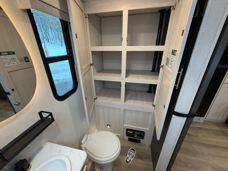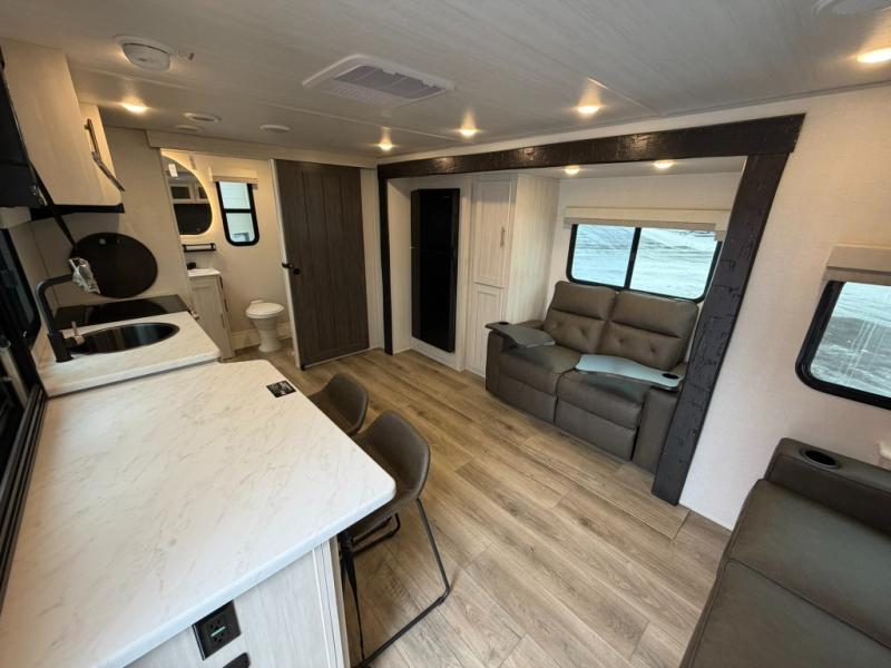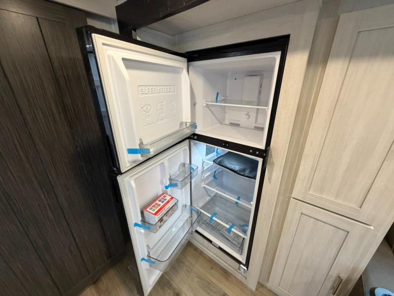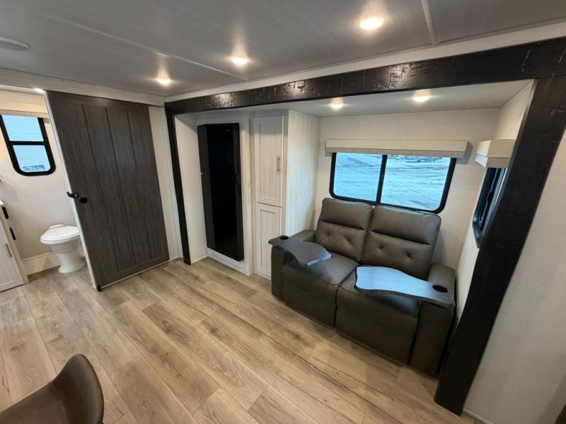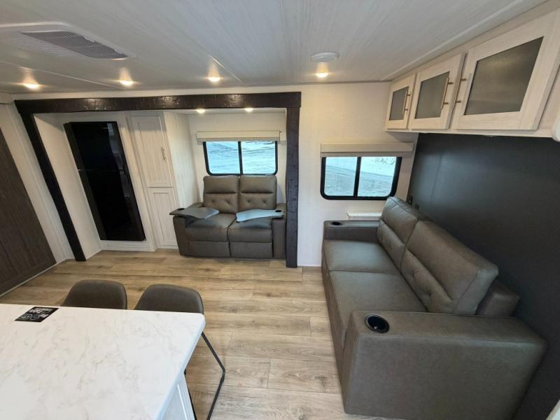 This travel trailer offers a comfortable and convenient layout rear bathroom with a linen closet, a private, well-appointed space for personal care with storage for linens, ensuring comfort on every journey. In the living room/kitchen combined area, you will find theater seating, a tri-fold sofa that offers versatile seating and additional space for guests or relaxation, adaptable to your travel needs, a fridge, a pantry for culinary supplies, an air fryer /microwave, a flip-up window, and overhead cabinets. The front bedroom will be your sanctuary of relaxation after a long day of exploring. The outside kitchen is the cherry on top, since it is ideal for alfresco cooking and dining, perfect for savoring meals amidst scenic surroundings and enjoying the outdoors with loved ones!