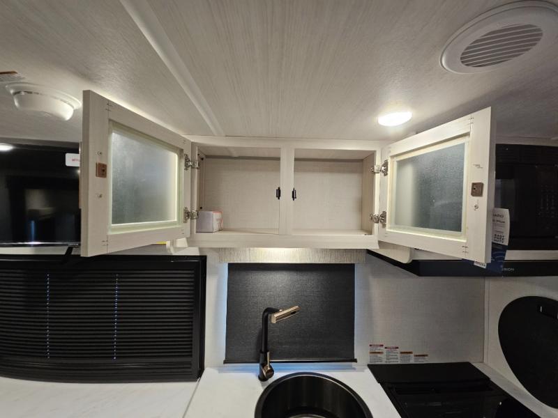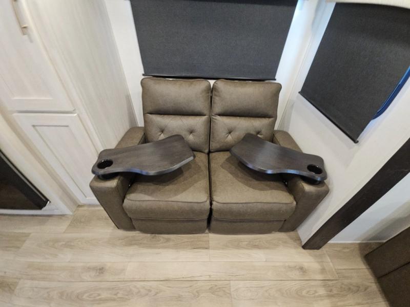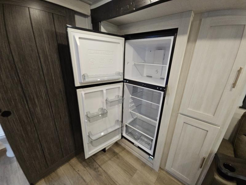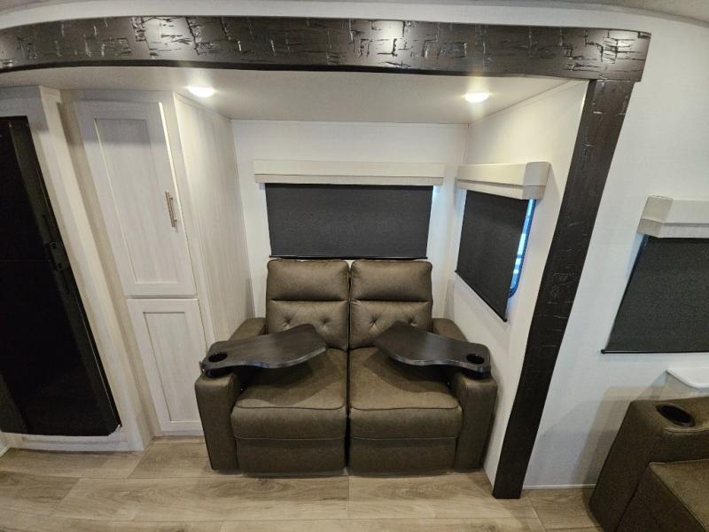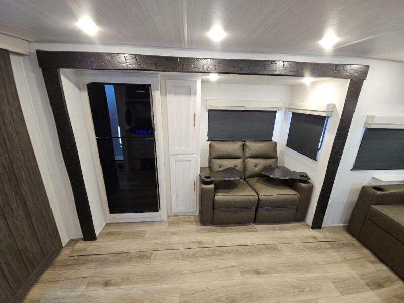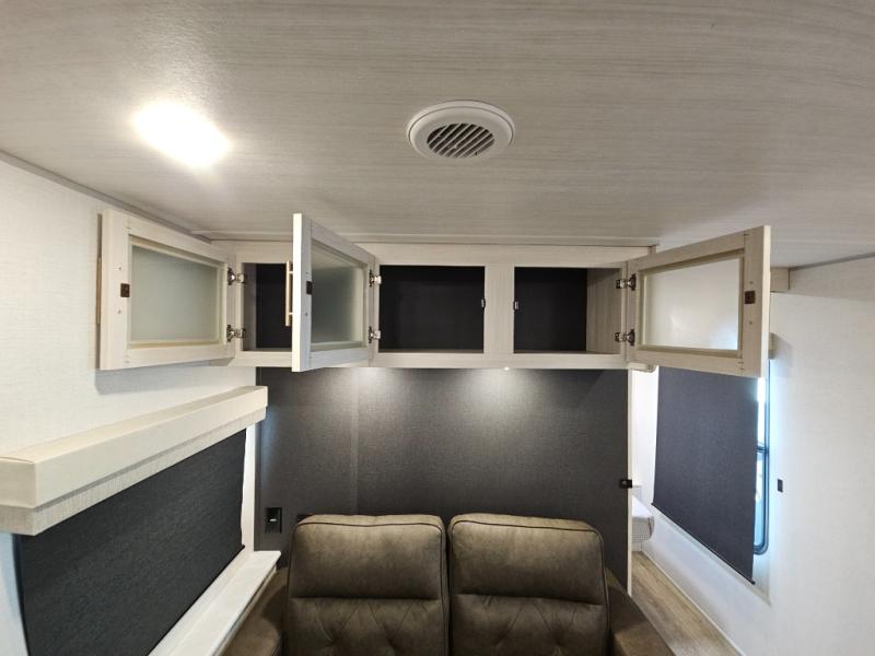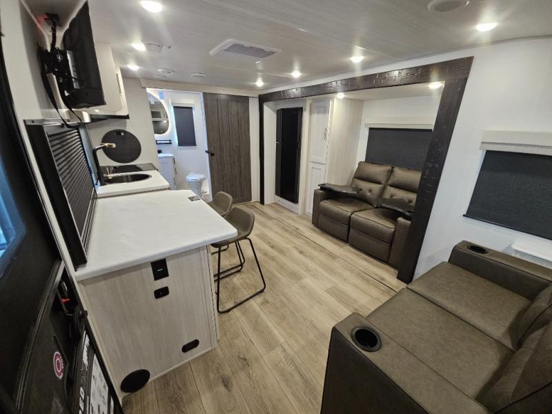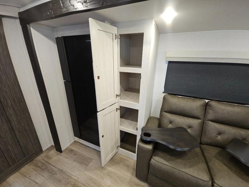 This travel trailer offers a comfortable and convenient layout rear bathroom with a linen closet, a private, well-appointed space for personal care with storage for linens, ensuring comfort on every journey. In the living room/kitchen combined area, you will find theater seating, a tri-fold sofa that offers versatile seating and additional space for guests or relaxation, adaptable to your travel needs, a fridge, a pantry for culinary supplies, an air fryer /microwave, a flip-up window, and overhead cabinets. The front bedroom will be your sanctuary of relaxation after a long day of exploring. The outside kitchen is the cherry on top, since it is ideal for alfresco cooking and dining, perfect for savoring meals amidst scenic surroundings and enjoying the outdoors with loved ones!