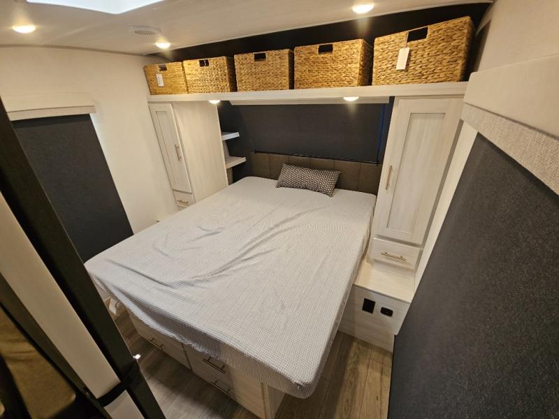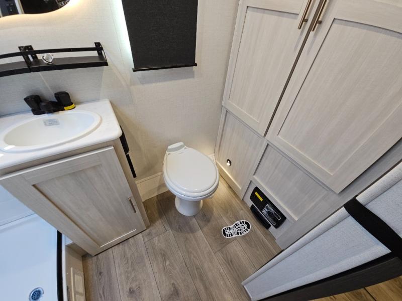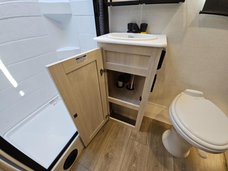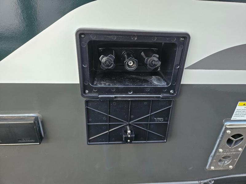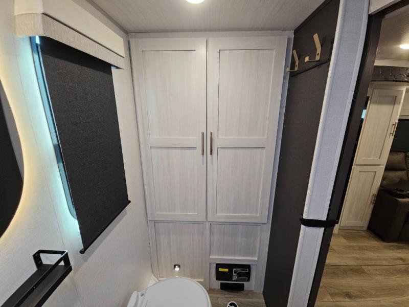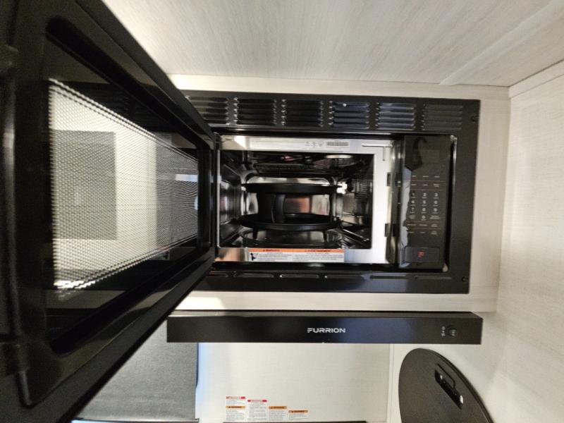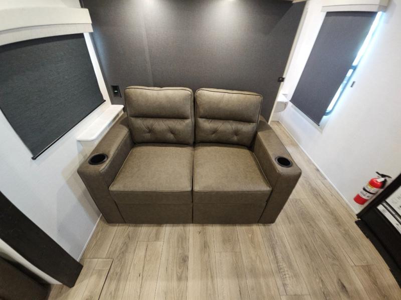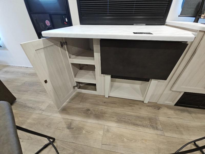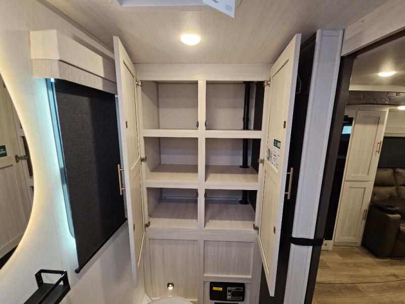 This travel trailer offers a comfortable and convenient layout rear bathroom with a linen closet, a private, well-appointed space for personal care with storage for linens, ensuring comfort on every journey. In the living room/kitchen combined area, you will find theater seating, a tri-fold sofa that offers versatile seating and additional space for guests or relaxation, adaptable to your travel needs, a fridge, a pantry for culinary supplies, an air fryer /microwave, a flip-up window, and overhead cabinets. The front bedroom will be your sanctuary of relaxation after a long day of exploring. The outside kitchen is the cherry on top, since it is ideal for alfresco cooking and dining, perfect for savoring meals amidst scenic surroundings and enjoying the outdoors with loved ones!