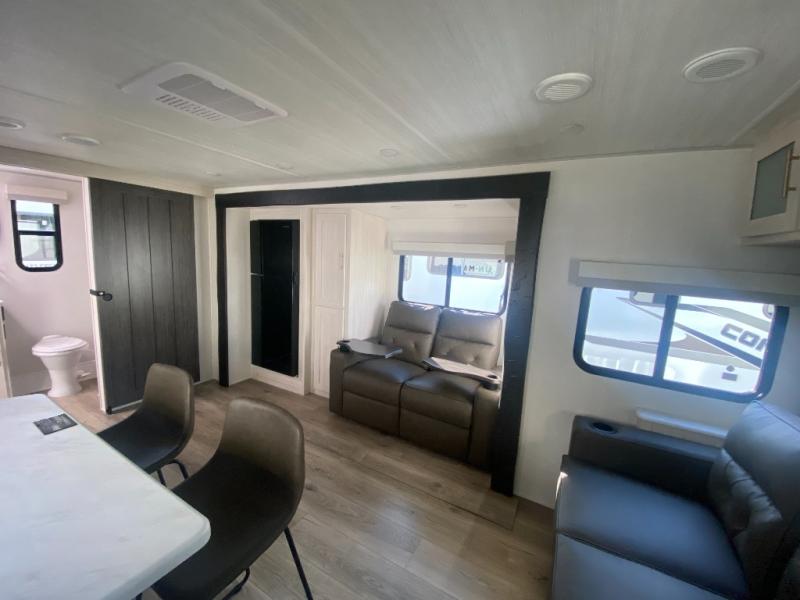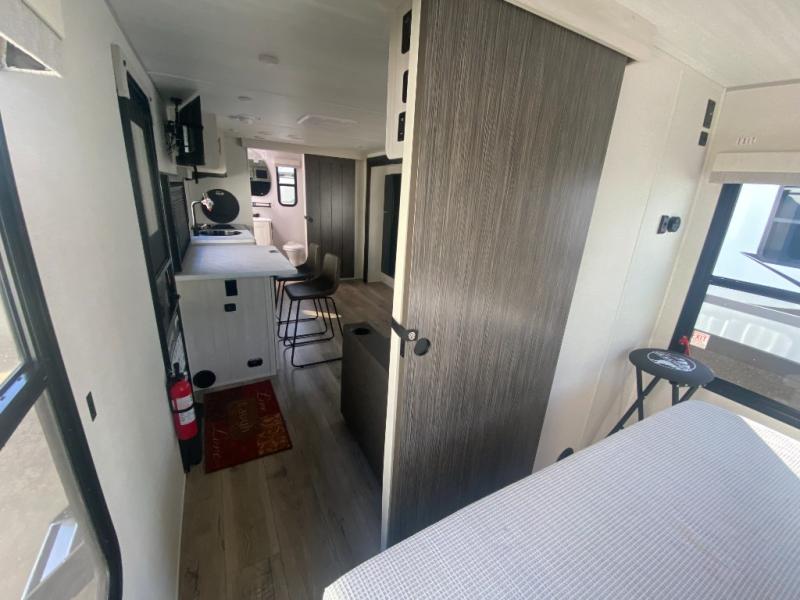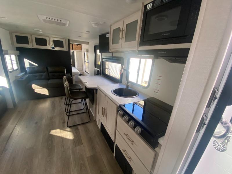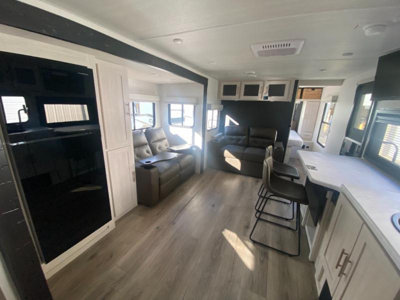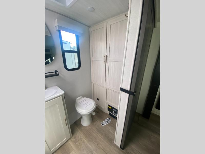 This travel trailer offers a comfortable and convenient layout rear bathroom with a linen closet, a private, well-appointed space for personal care with storage for linens, ensuring comfort on every journey. In the living room/kitchen combined area, you will find theater seating, a tri-fold sofa that offers versatile seating and additional space for guests or relaxation, adaptable to your travel needs, a fridge, a pantry for culinary supplies, an air fryer /microwave, a flip-up window, and overhead cabinets. The front bedroom will be your sanctuary of relaxation after a long day of exploring. The outside kitchen is the cherry on top, since it is ideal for alfresco cooking and dining, perfect for savoring meals amidst scenic surroundings and enjoying the outdoors with loved ones!