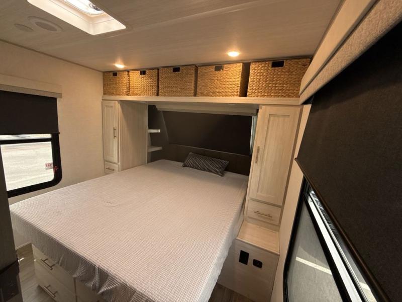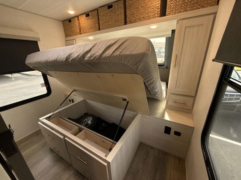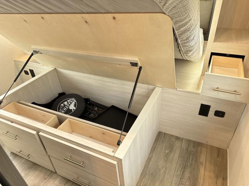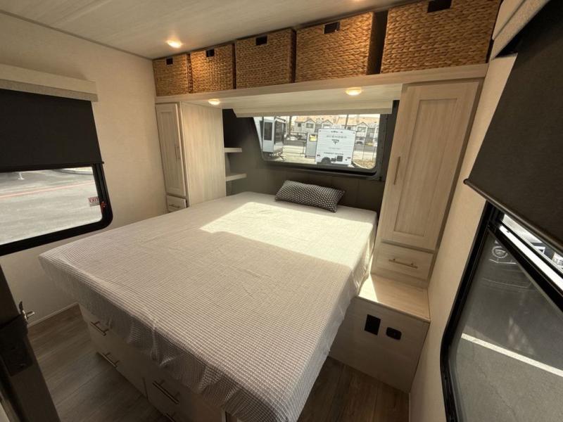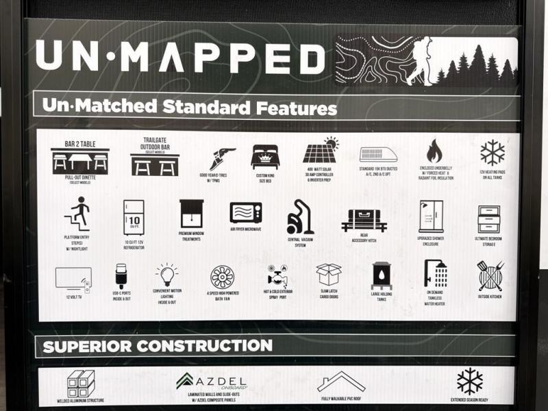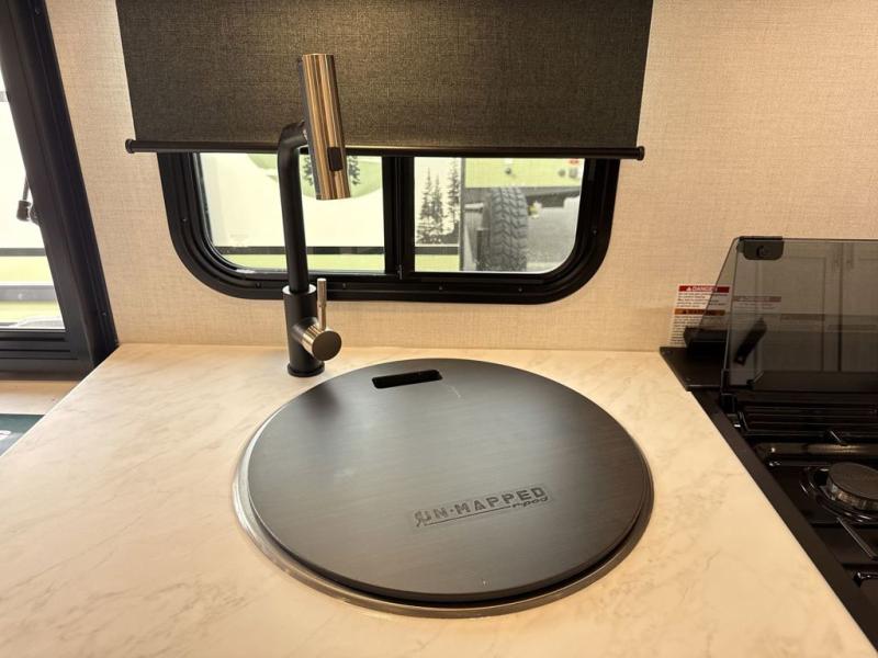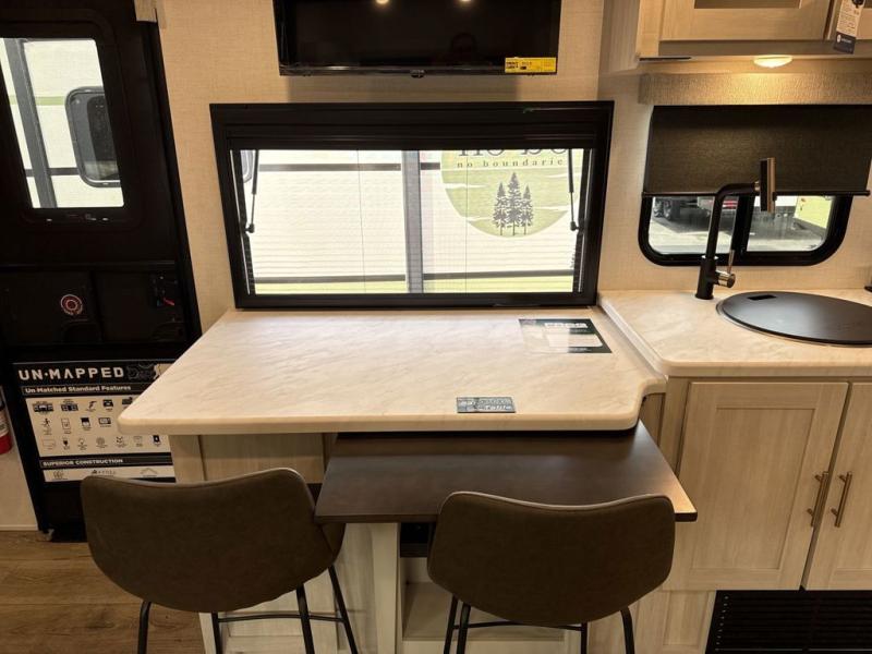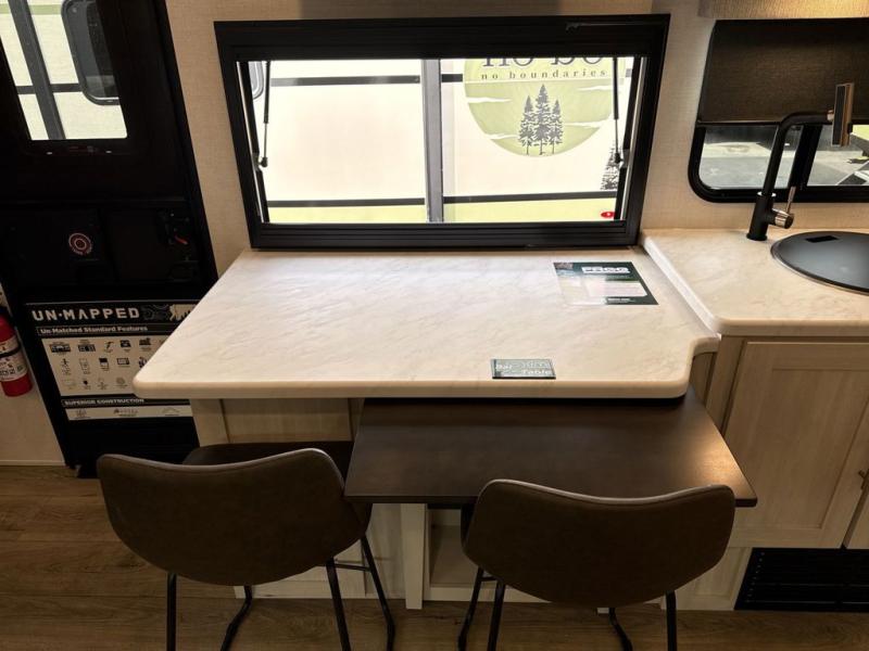The Forest River Un-Mapped travel trailers deliver an unparalleled travel experience thanks to their incredible features, starting with the aluminum-framed floor with block foam insulation that ensures exceptional structural integrity and thermal efficiency, along with the sealed underbelly with forced heat & radiant foil barrier that provides superior insulation and heat management, and the power tongue jack facilitates easy maneuvering and stabilization of the trailer. Plus, the 30 Amp charge controller with solar inverter prep is ready for integration with solar power systems, catering to eco-conscious travelers seeking off-grid capabilities. Inside, you will find seamless Surf-X kitchen countertops that offer a sleek, durable surface and are easy to maintain for busy travelers. Further, the blackout roller shades will add privacy and light control for restful nights and cozy daytime retreats.