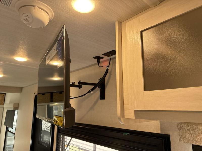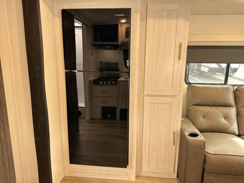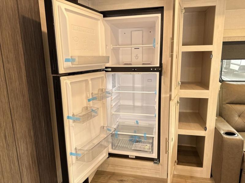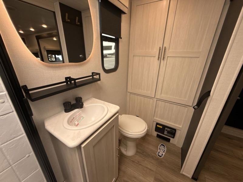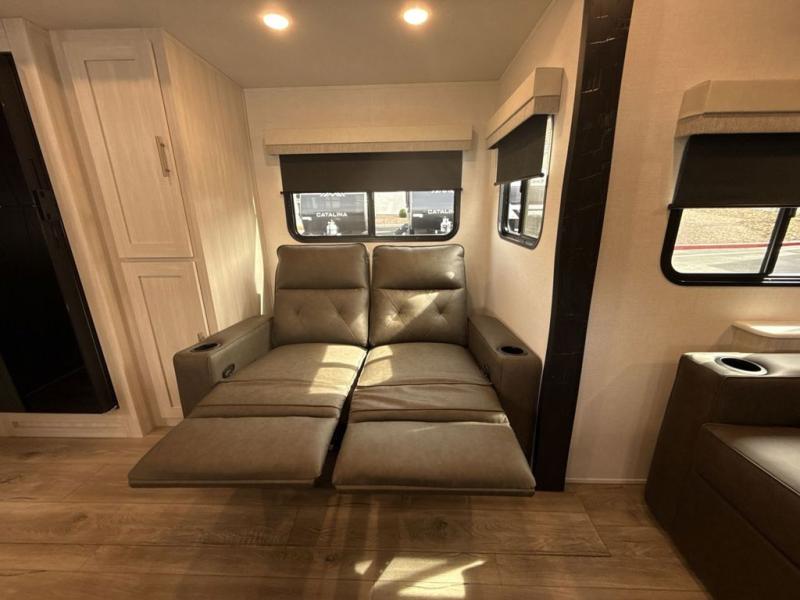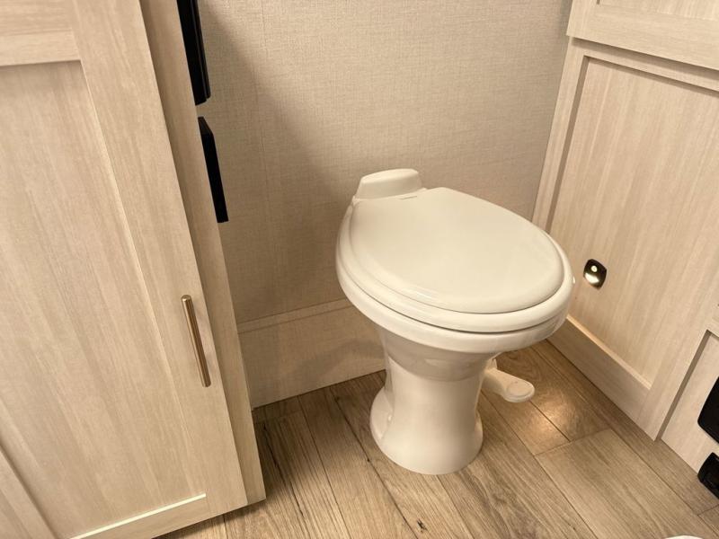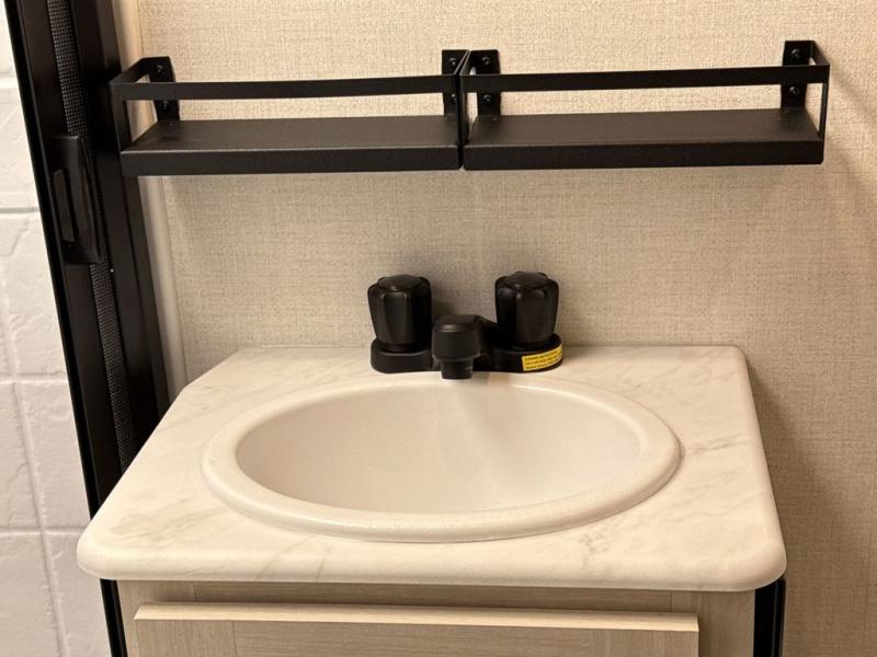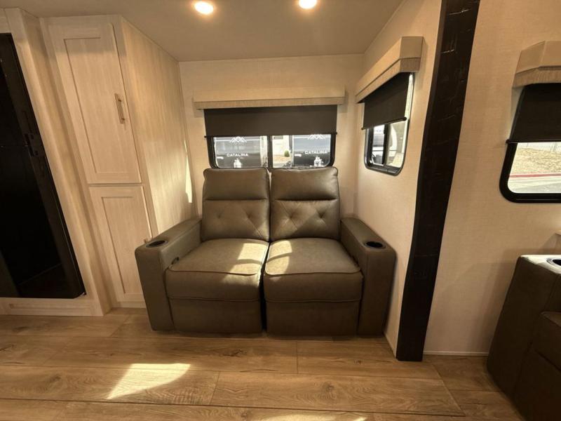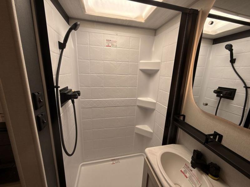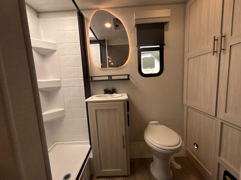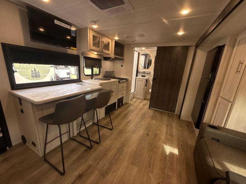 This travel trailer offers a comfortable and convenient layout rear bathroom with a linen closet, a private, well-appointed space for personal care with storage for linens, ensuring comfort on every journey. In the living room/kitchen combined area, you will find theater seating, a tri-fold sofa that offers versatile seating and additional space for guests or relaxation, adaptable to your travel needs, a fridge, a pantry for culinary supplies, an air fryer /microwave, a flip-up window, and overhead cabinets. The front bedroom will be your sanctuary of relaxation after a long day of exploring. The outside kitchen is the cherry on top, since it is ideal for alfresco cooking and dining, perfect for savoring meals amidst scenic surroundings and enjoying the outdoors with loved ones!