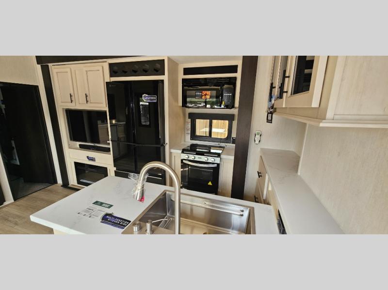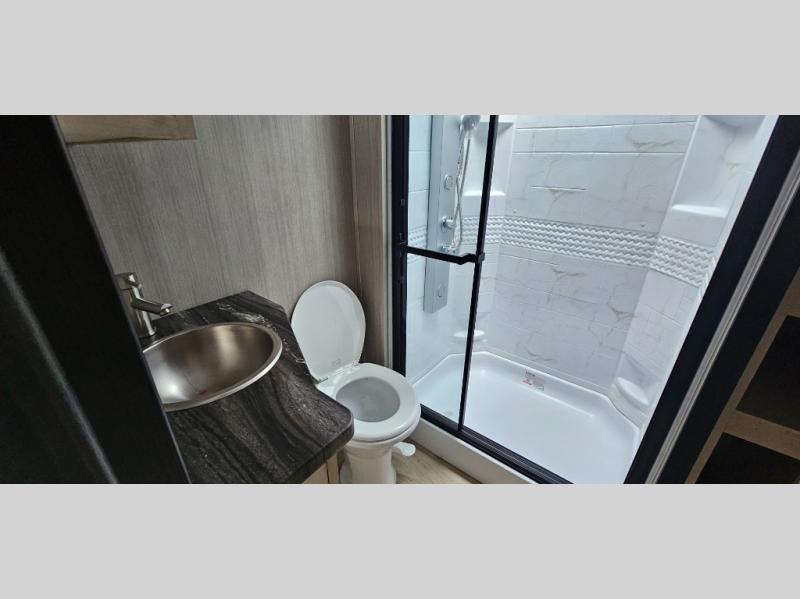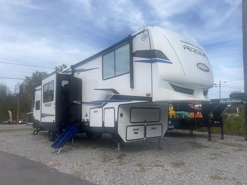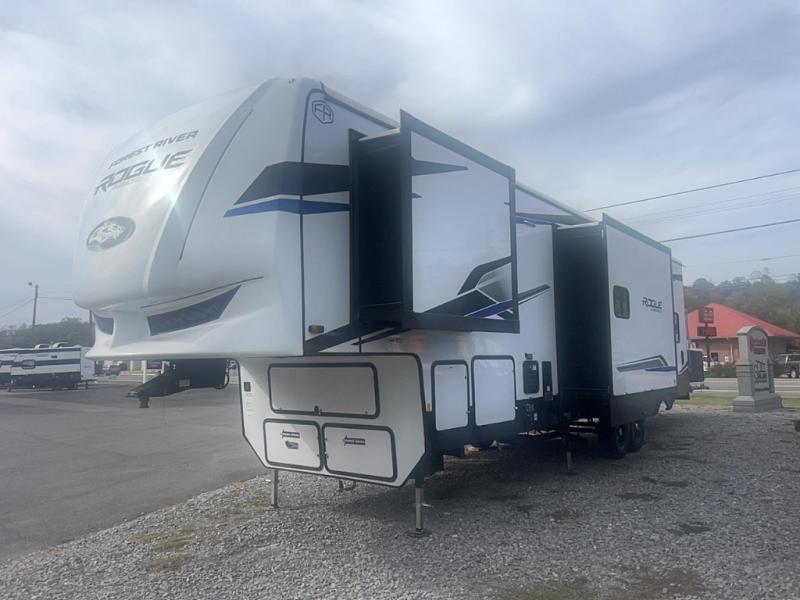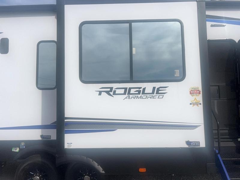 Every one of these Forest River Vengeance Rogue Armored fifth wheel toy haulers come with the features you want most at an affordable price tag! The DuraPoxy gas/oil resistant floor has 5,000 lb. tie downs to ensure your toys will arrive safely without damaging the flooring, plus the 3,000 lb. rated ramp door makes it easy to load them. Two 15,000 BTU A/Cs are "Super H Ducted" to keep you cool even on the hottest summer days, and the heated enclosed holding tanks help protect against the elements. Each model also includes a 6-point leveling system, dual LED cargo lights, solar reflective windows, and a tire pressure monitoring system. Inside, you'll enjoy the solid surface countertops, glass shower door, zebra shades in the living room, and stainless-steel multi-purpose sink to name a few comforts!