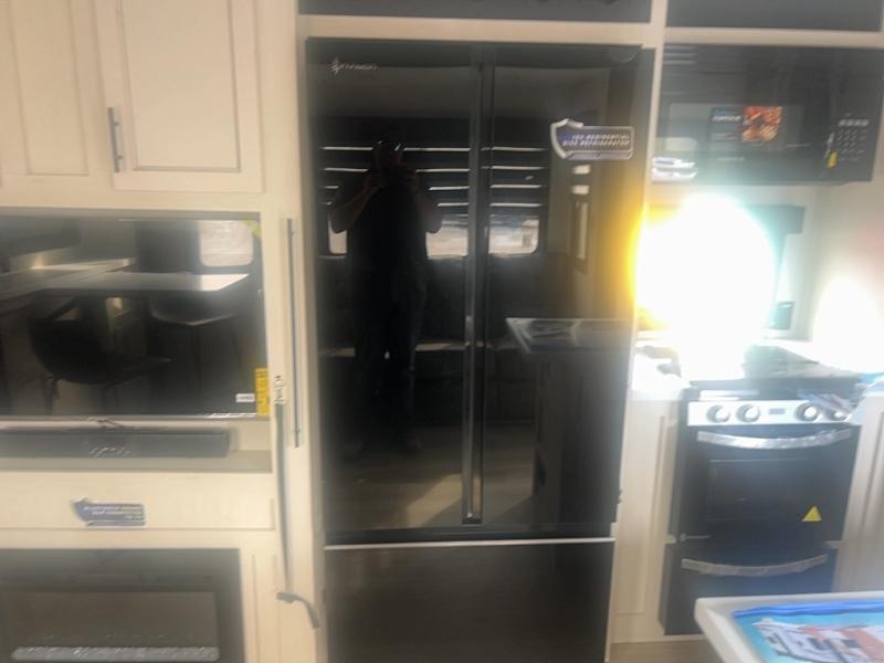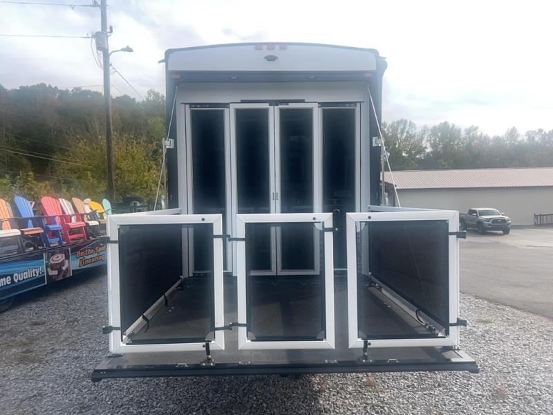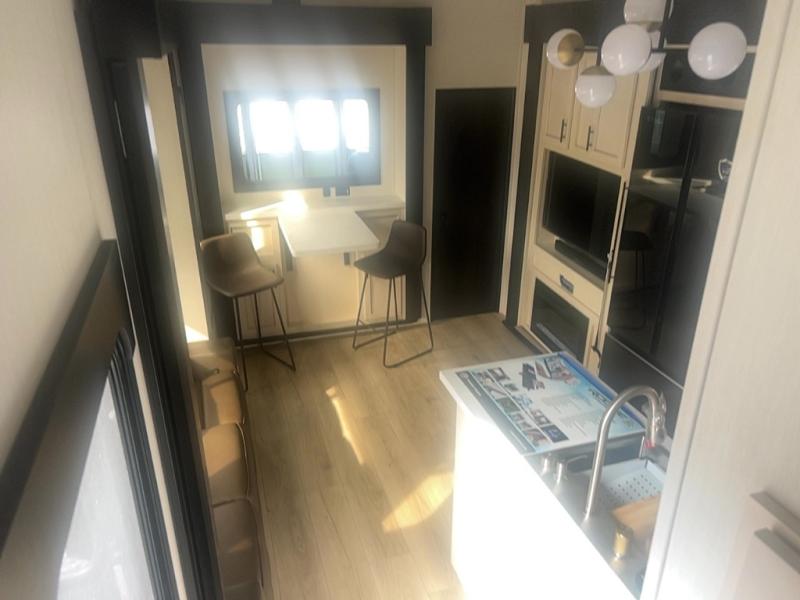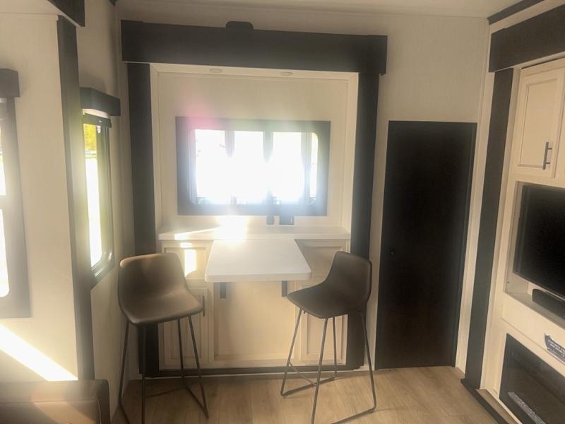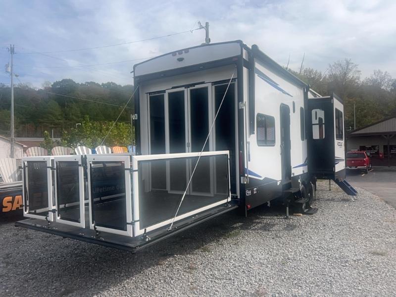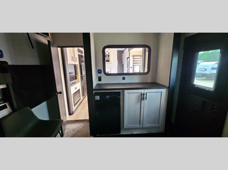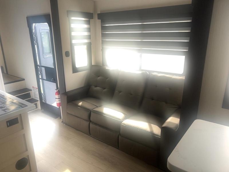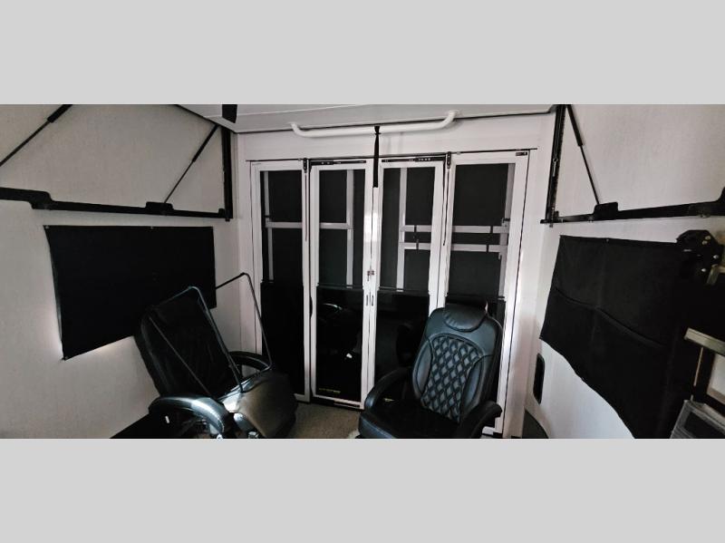 This toy hauler with an 11' separate garage is sure to meet your needs! After you've unloaded your toys, you can relax on the Euro recliners or set up the drop-down queen bed for guests if it's getting late. There is also a window in the garage that opens to the main living area to keep everyone connected, and the flip-up table on the other side of the window provides a place to dine at. A counter peninsula will give the chef of your group more space to prep meals, and the dual opposing slides in this space make it more open. You'll also enjoy the sofa with recliners across from the entertainment center with a fireplace. A full bath with a spacious shower is perfect for cleaning up after a day of trail riding, and the front private bedroom with a queen bed slide is sure to have you feeling right at home!