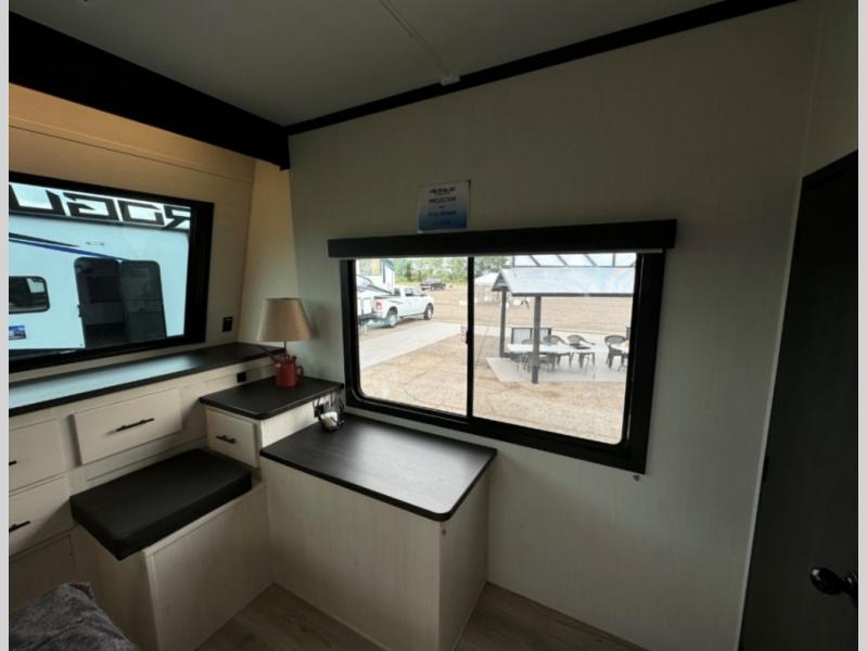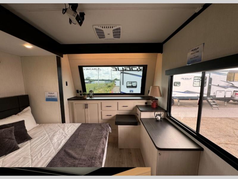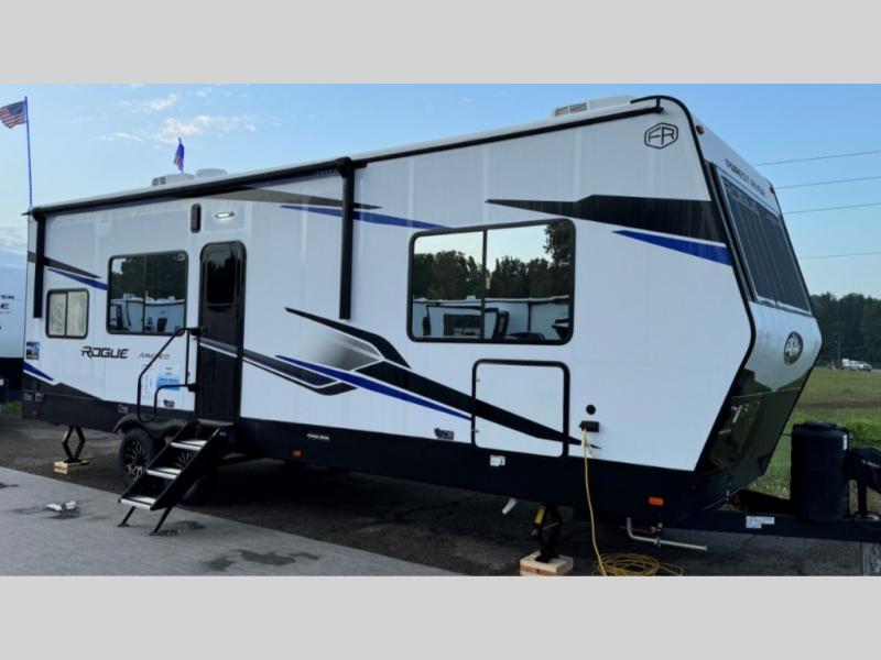 Every one of these Forest River Vengeance Rogue Armored travel trailer toy haulers come with the features you want most at an affordable price tag! The DuraPoxy gas/oil resistant floor has 5,000 lb. tie downs to ensure your toys will arrive safely without damaging the flooring, plus the 3,000 lb. rated ramp door makes it easy to load them. A 15,000 BTU A/C will keep you cool even on the hottest summer days, and an Armored underbelly helps keep your unit's vitals protected. The Rogue Ready package comes a fuel station with a pump, a ramp door patio system, a TST tire pressure monitoring system, and many more stand-out features. And don't overlook the Rogue Premium Package with an 8' weatherproof ramp door, an exterior TV hookup for the option to add a television, blue accent wheels, and solar reflective safety glass windows to name a few conveniences.
