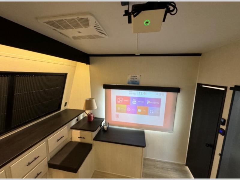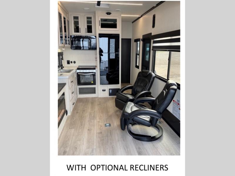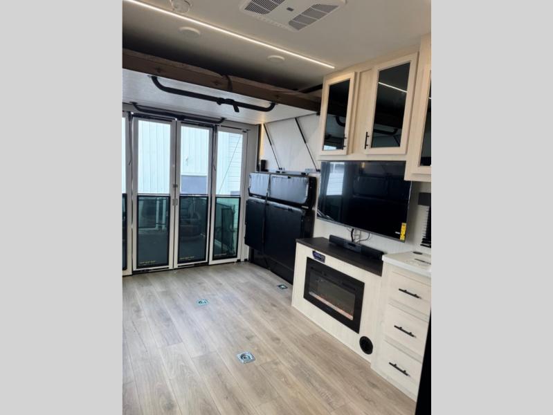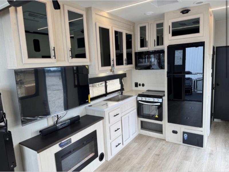Head for the trails with this toy hauler in tow! Once your toys are unloaded from the 14' 1" garage, you can relax on the dual flip-up sofas with a queen bed above. There are also dual lounge chairs across from the entertainment center with a cozy fireplace and a hidden pantry behind for movies, games and more! The chef of your crew can make meals inside on the three burner cooktop, or head outdoors to utilize the outside kitchen. When you're ready to call it a night, retreat to the front private bedroom for a great night's rest on the trailer king bed slide out. There is also a large dresser here to keep your things organized.