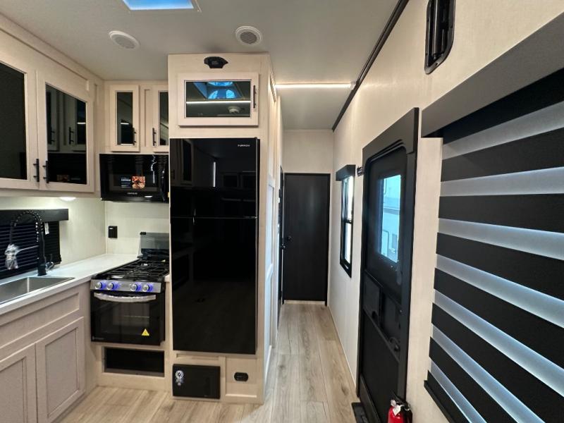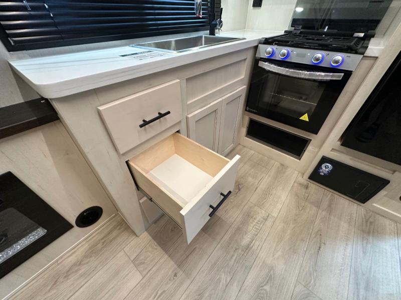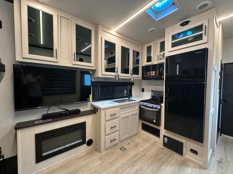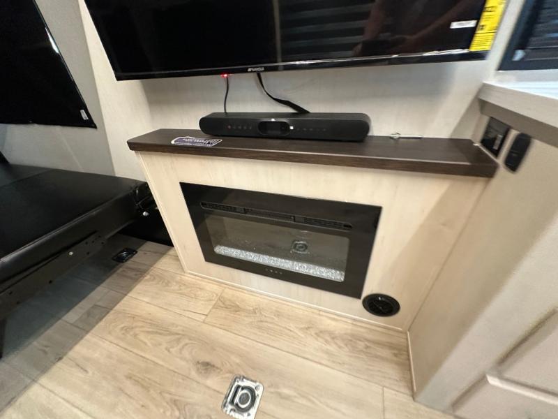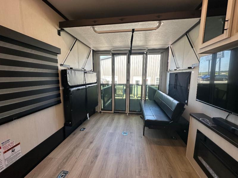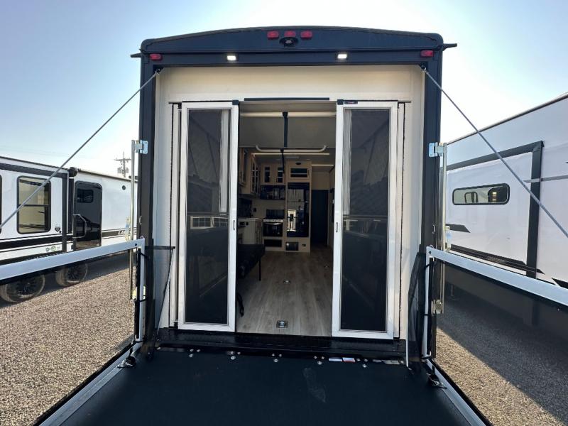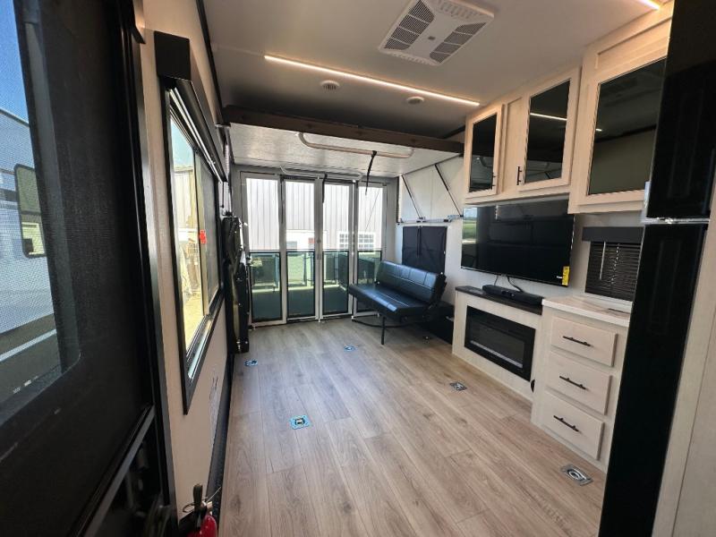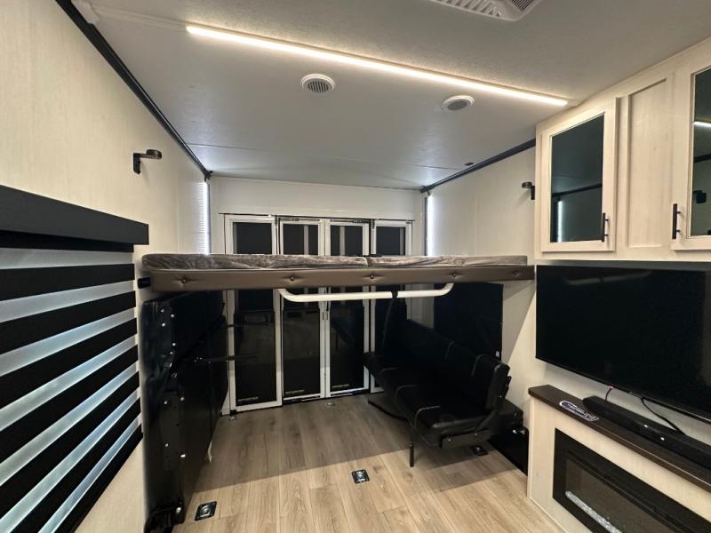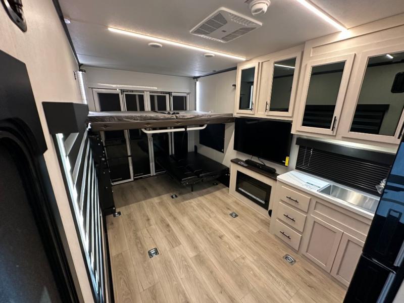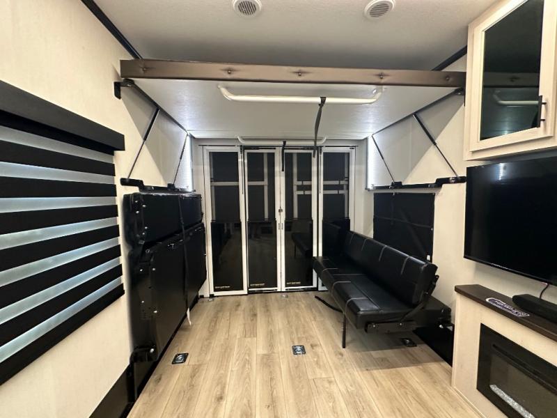 Head for the trails with this toy hauler in tow! Once your toys are unloaded from the 14' 1" garage, you can relax on the dual flip-up sofas with a queen bed above. There are also dual lounge chairs across from the entertainment center with a cozy fireplace and a hidden pantry behind for movies, games and more! The chef of your crew can make meals inside on the three burner cooktop, or head outdoors to utilize the outside kitchen. When you're ready to call it a night, retreat to the front private bedroom for a great night's rest on the trailer king bed slide out. There is also a large dresser here to keep your things organized.