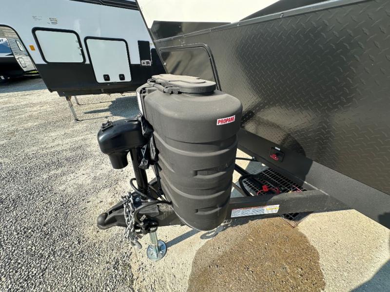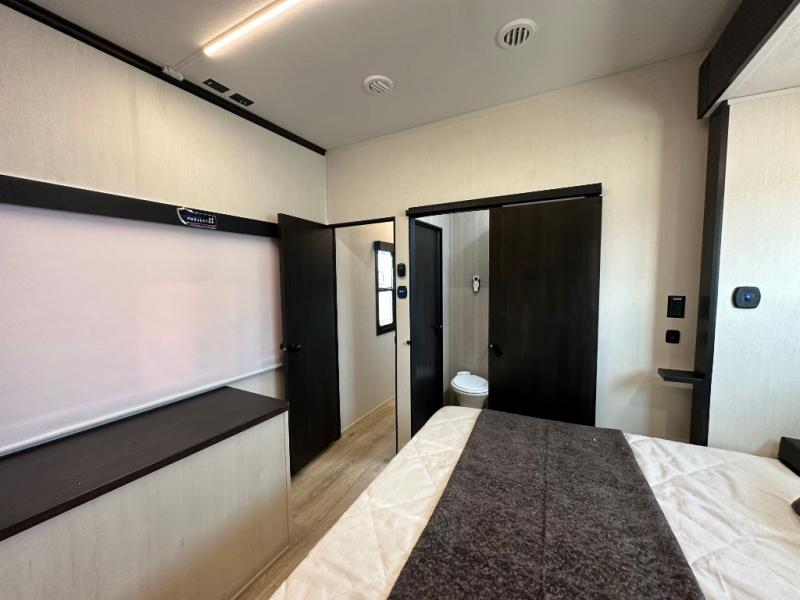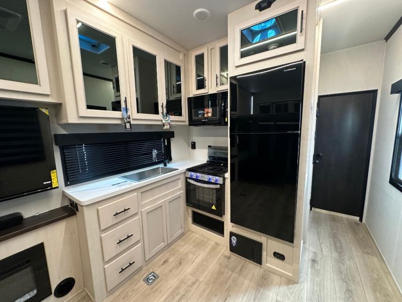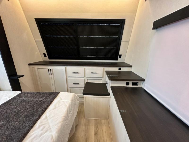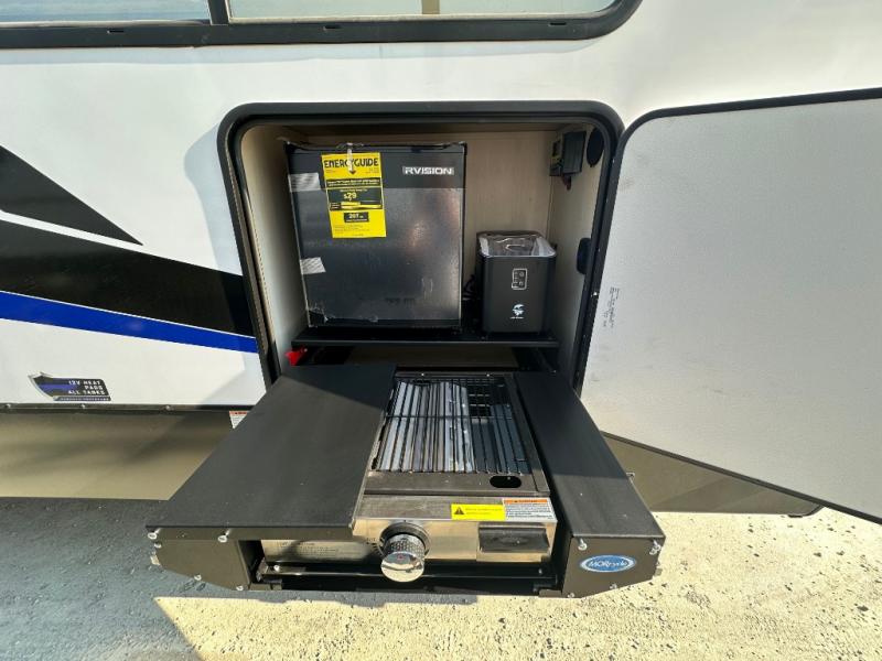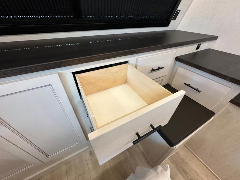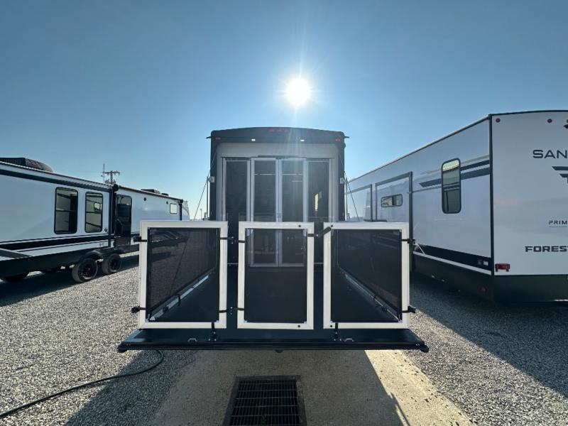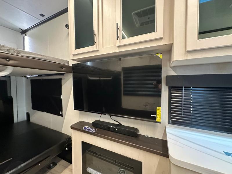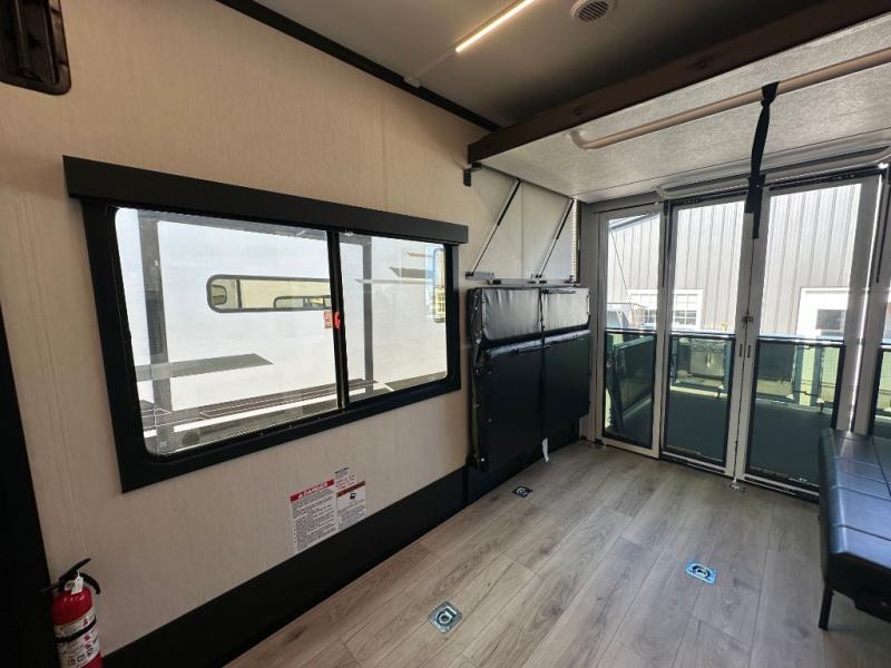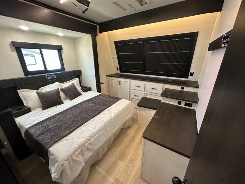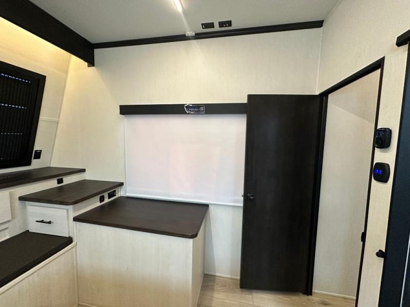 Head for the trails with this toy hauler in tow! Once your toys are unloaded from the 14' 1" garage, you can relax on the dual flip-up sofas with a queen bed above. There are also dual lounge chairs across from the entertainment center with a cozy fireplace and a hidden pantry behind for movies, games and more! The chef of your crew can make meals inside on the three burner cooktop, or head outdoors to utilize the outside kitchen. When you're ready to call it a night, retreat to the front private bedroom for a great night's rest on the trailer king bed slide out. There is also a large dresser here to keep your things organized.