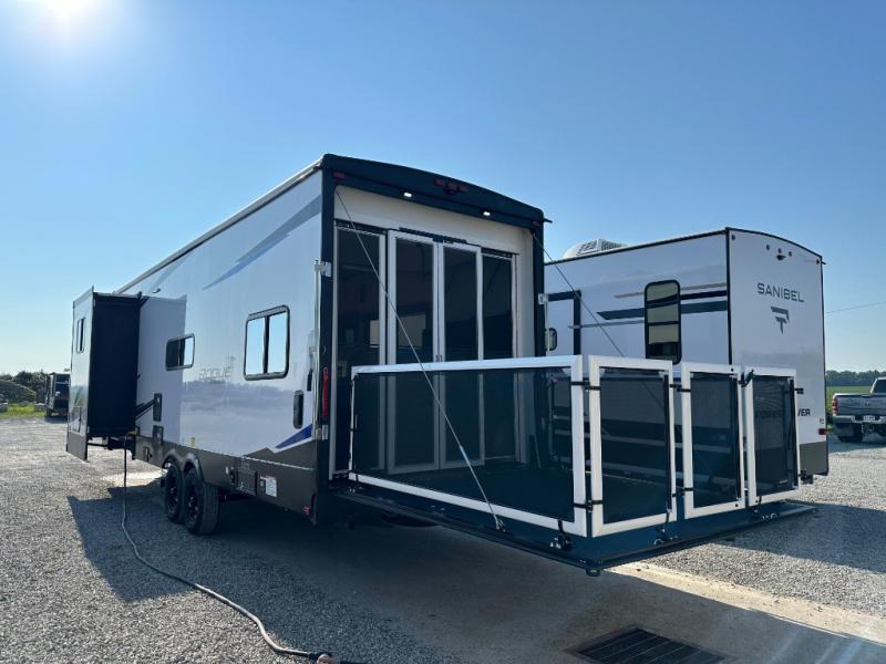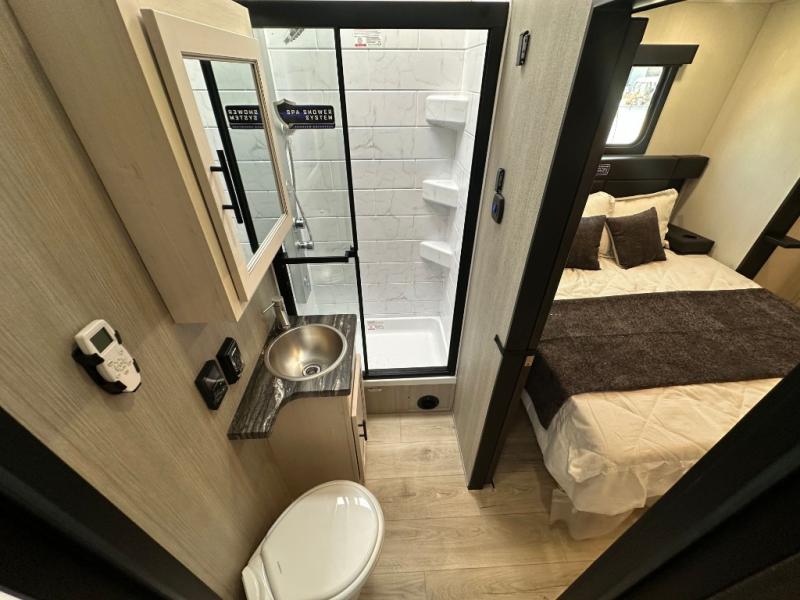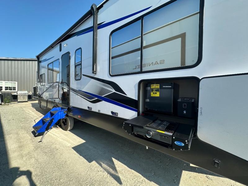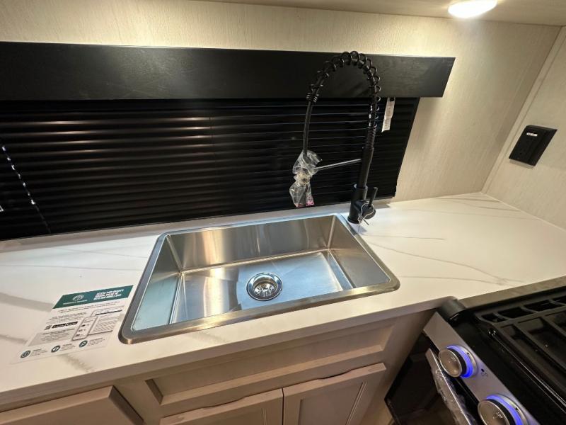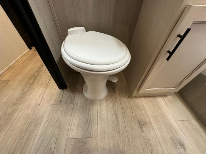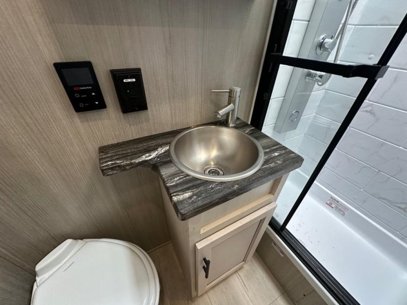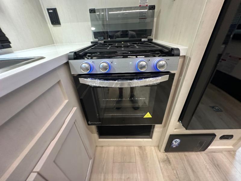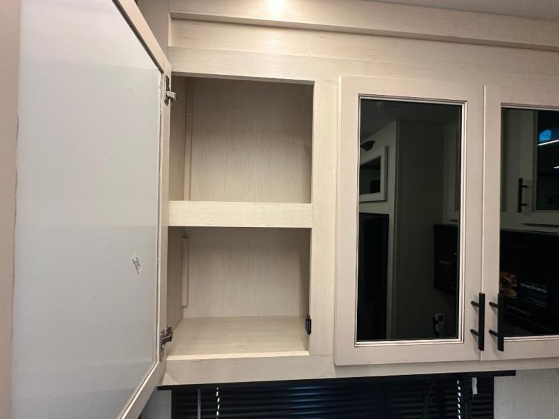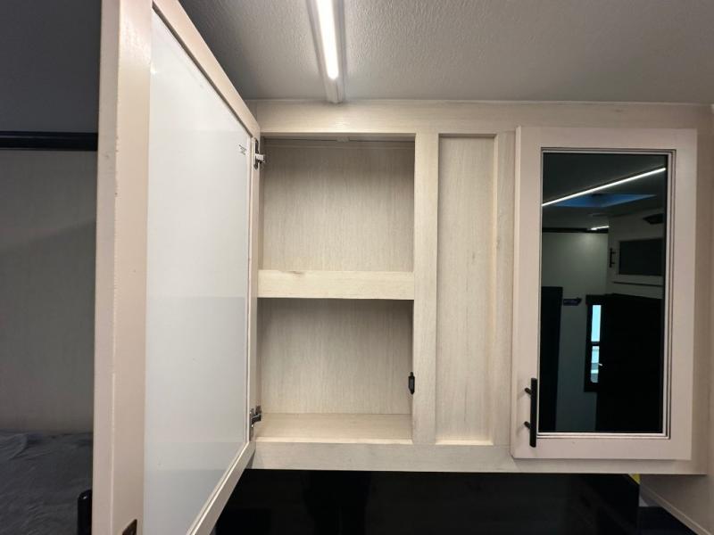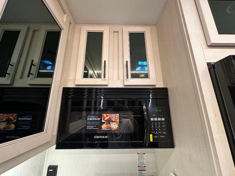 Head for the trails with this toy hauler in tow! Once your toys are unloaded from the 14' 1" garage, you can relax on the dual flip-up sofas with a queen bed above. There are also dual lounge chairs across from the entertainment center with a cozy fireplace and a hidden pantry behind for movies, games and more! The chef of your crew can make meals inside on the three burner cooktop, or head outdoors to utilize the outside kitchen. When you're ready to call it a night, retreat to the front private bedroom for a great night's rest on the trailer king bed slide out. There is also a large dresser here to keep your things organized.