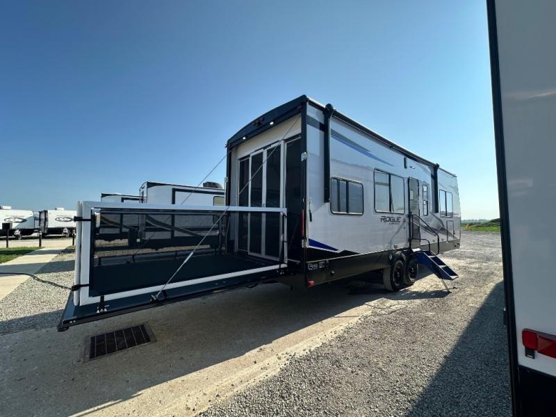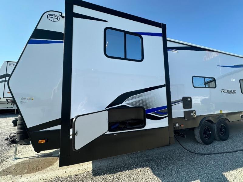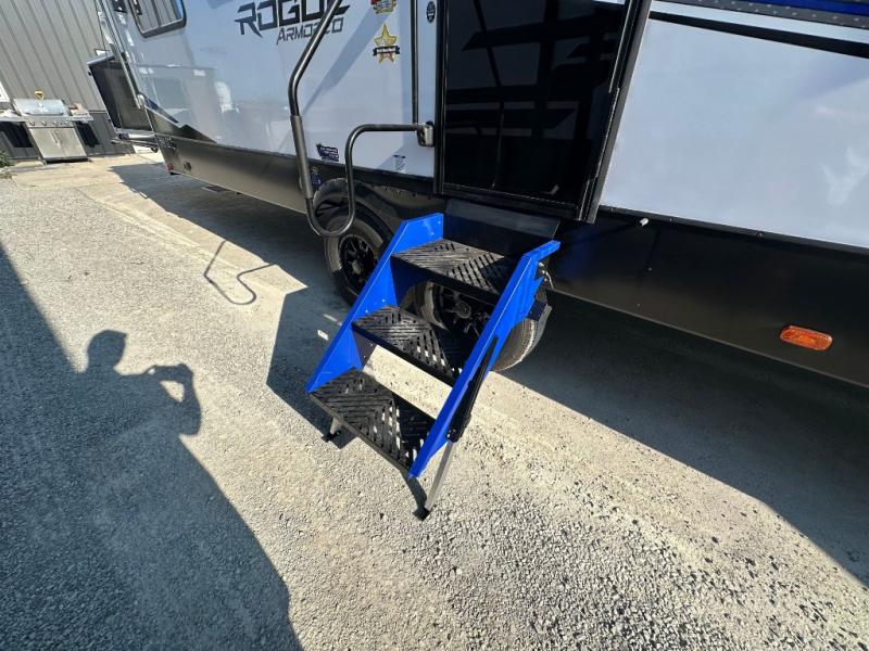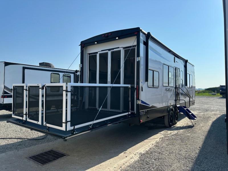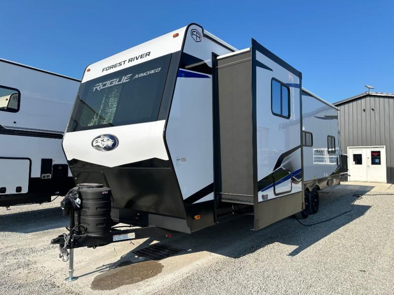 Every one of these Forest River Vengeance Rogue Armored travel trailer toy haulers come with the features you want most at an affordable price tag! The DuraPoxy gas/oil resistant floor has 5,000 lb. tie downs to ensure your toys will arrive safely without damaging the flooring, plus the 3,000 lb. rated ramp door makes it easy to load them. A 15,000 BTU A/C will keep you cool even on the hottest summer days, and an Armored underbelly helps keep your unit's vitals protected. The Rogue Ready package comes a fuel station with a pump, a ramp door patio system, a TST tire pressure monitoring system, and many more stand-out features. And don't overlook the Rogue Premium Package with an 8' weatherproof ramp door, an exterior TV hookup for the option to add a television, blue accent wheels, and solar reflective safety glass windows to name a few conveniences.
