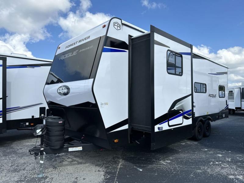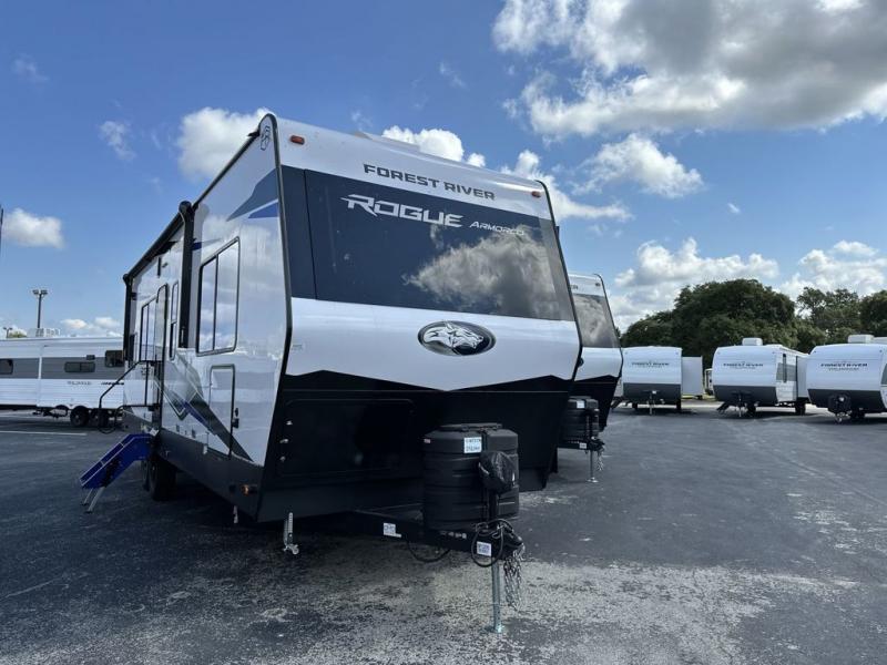 Every one of these Forest River Vengeance Rogue Armored travel trailer toy haulers come with the features you want most at an affordable price tag! The DuraPoxy gas/oil resistant floor has 5,000 lb. tie downs to ensure your toys will arrive safely without damaging the flooring, plus the 3,000 lb. rated ramp door makes it easy to load them. A 15,000 BTU A/C will keep you cool even on the hottest summer days, and an Armored underbelly helps keep your unit's vitals protected. The Rogue Ready package comes a fuel station with a pump, a ramp door patio system, a TST tire pressure monitoring system, and many more stand-out features. And don't overlook the Rogue Premium Package with an 8' weatherproof ramp door, an exterior TV hookup for the option to add a television, blue accent wheels, and solar reflective safety glass windows to name a few conveniences.