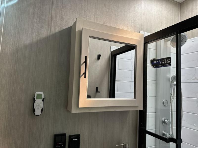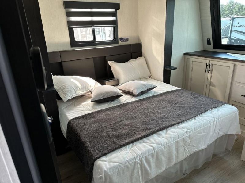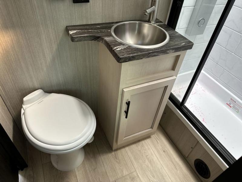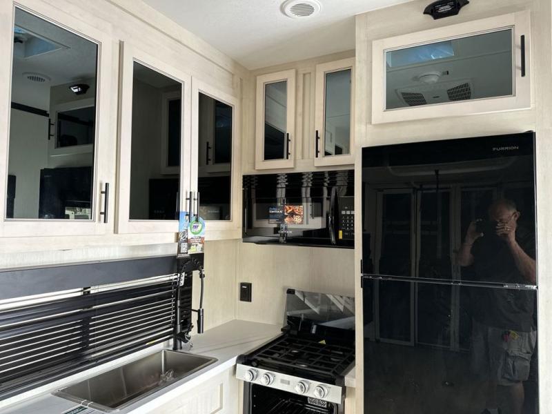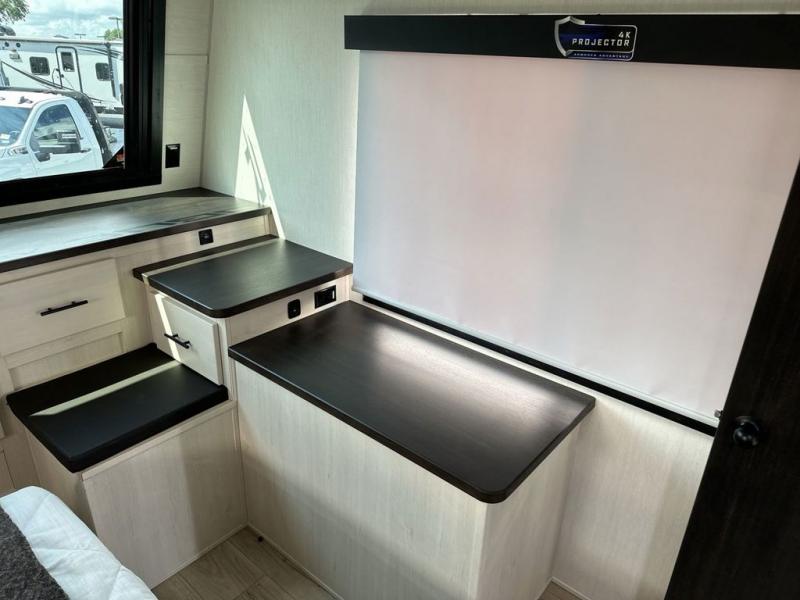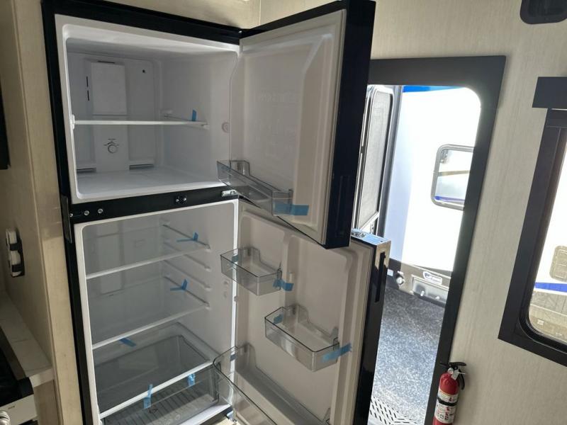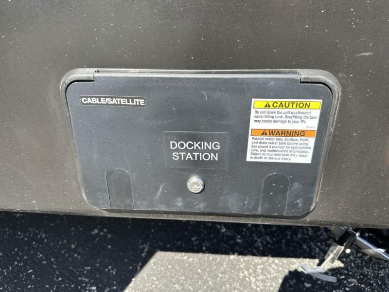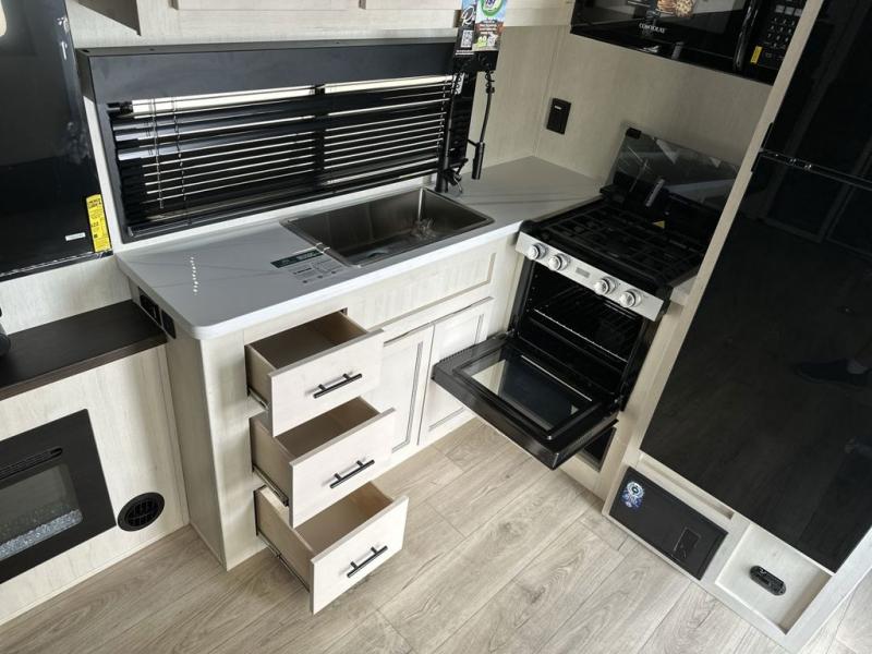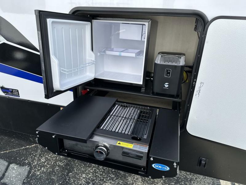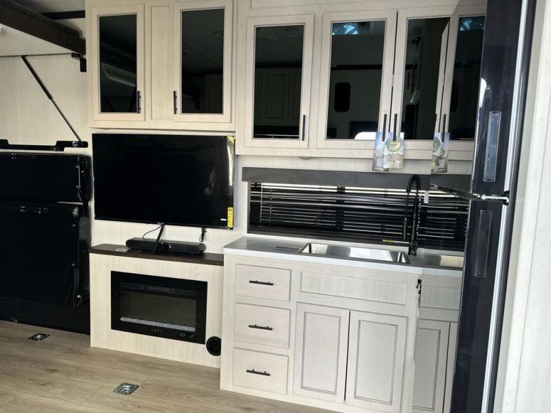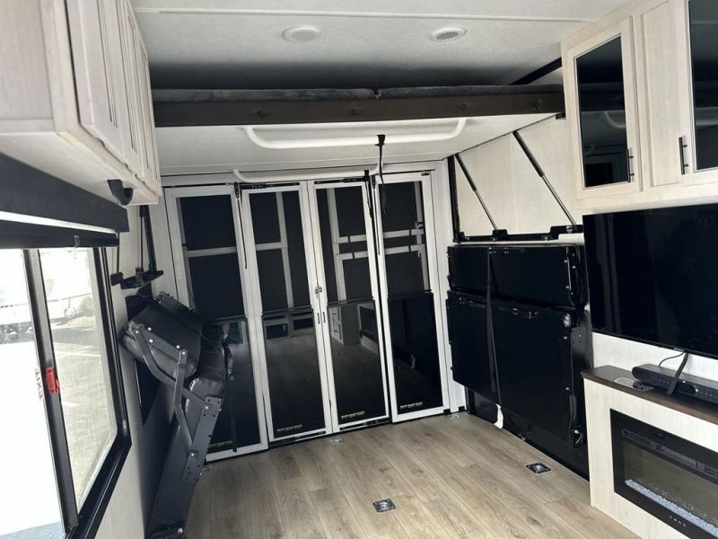 Head for the trails with this toy hauler in tow! Once your toys are unloaded from the 14' 1" garage, you can relax on the dual flip-up sofas with a queen bed above. There are also dual lounge chairs across from the entertainment center with a cozy fireplace and a hidden pantry behind for movies, games and more! The chef of your crew can make meals inside on the three burner cooktop, or head outdoors to utilize the outside kitchen. When you're ready to call it a night, retreat to the front private bedroom for a great night's rest on the trailer king bed slide out. There is also a large dresser here to keep your things organized.