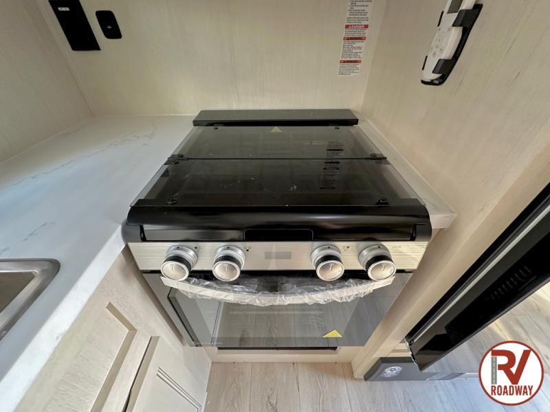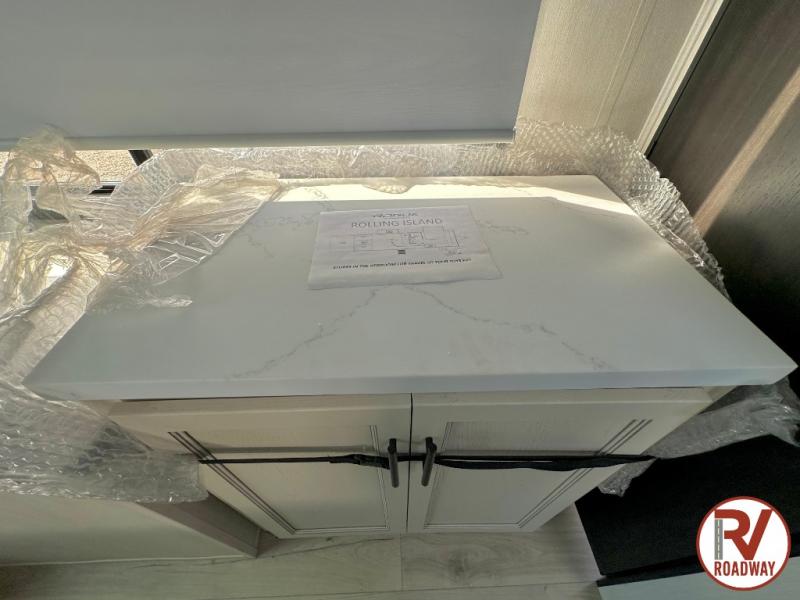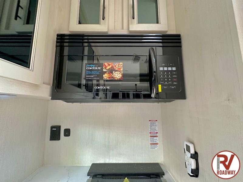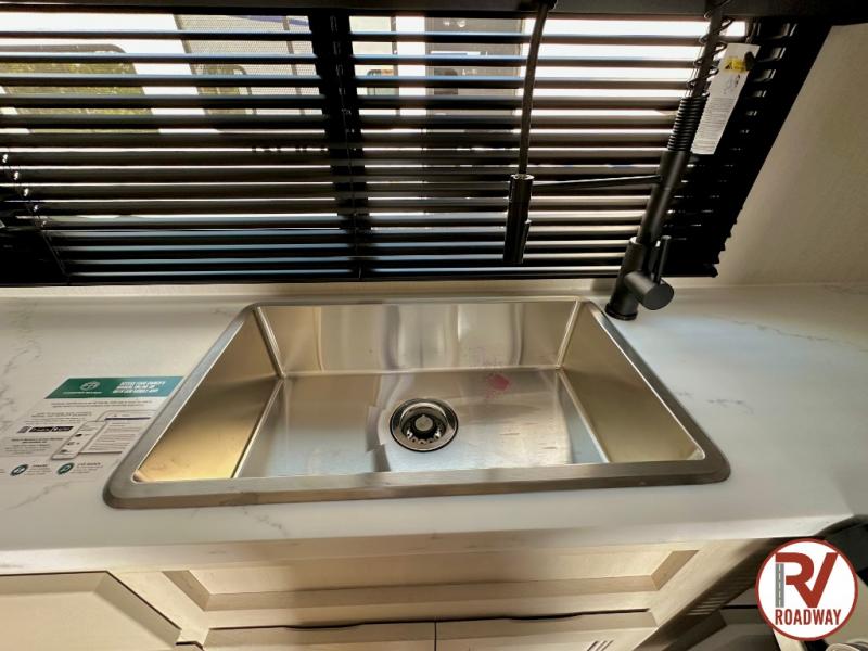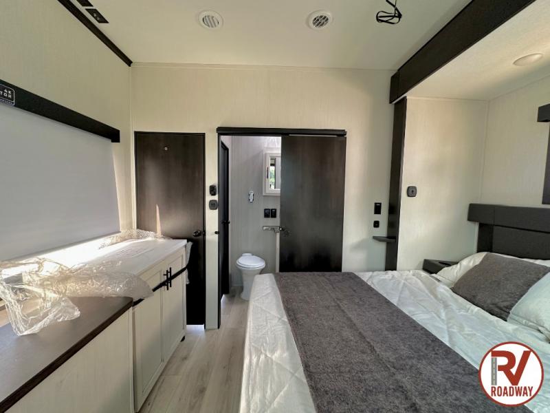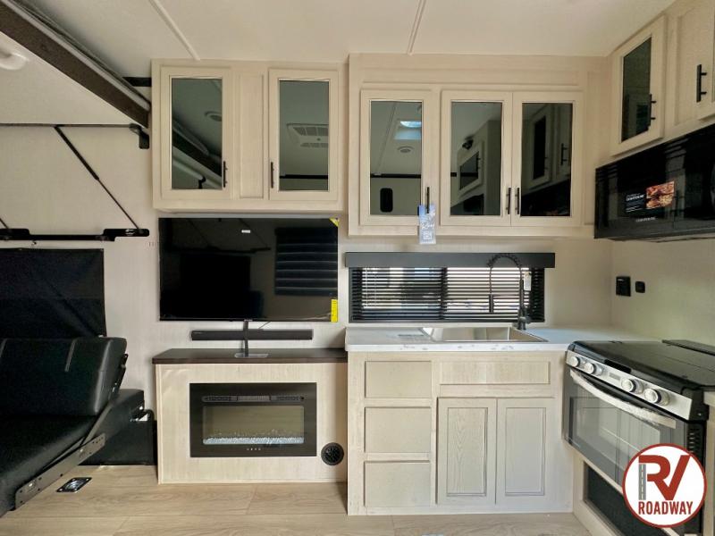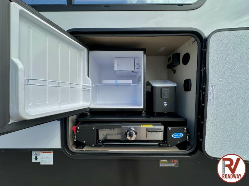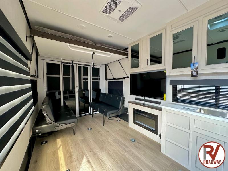 Head for the trails with this toy hauler in tow! Once your toys are unloaded from the 14' 1" garage, you can relax on the dual flip-up sofas with a queen bed above. There are also optional dual lounge chairs across from the entertainment center with a cozy fireplace! The chef of your crew can make meals inside on the three-burner cooktop, or head outdoors to utilize the outside kitchen. When you're ready to call it a night, retreat to the front private bedroom for a great night's rest on the trailer king bed slide out. There is also a large dresser here to keep your things organized.
