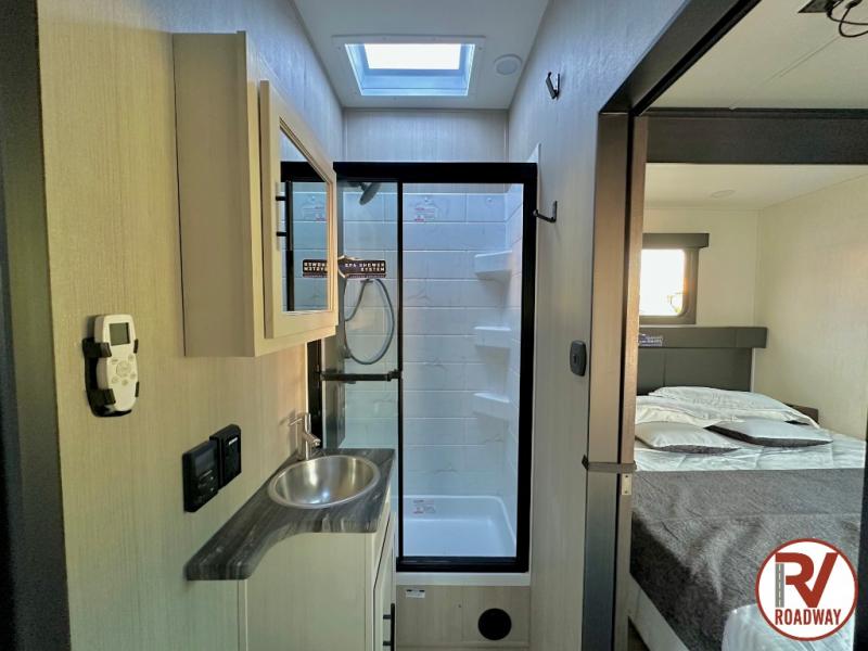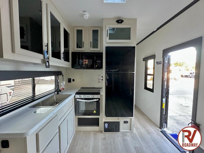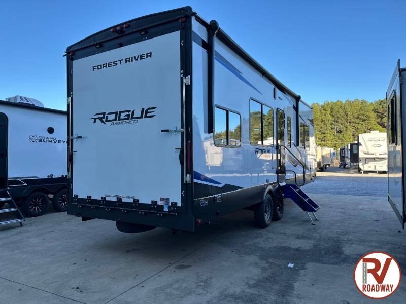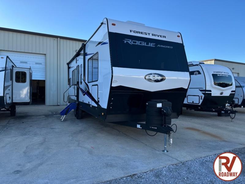 Every one of these Forest River Vengeance Rogue Armored travel trailer toy haulers come with the features you want most at an affordable price tag! The DuraPoxy gas/oil resistant floor has 5,000 lb. tie downs to ensure your toys will arrive safely without damaging the flooring, plus the 3,000 lb. rated ramp door makes it easy to load them. A 15,000 BTU A/C will keep you cool even on the hottest summer days, and there are heated enclosed holding tanks with 12V heat pads on every tank for added protection. Each model includes a fuel station with a digital readout, a ramp door patio system, a tire pressure monitoring system, and many more stand-out features. Inside, you'll find zebra shades in the living room, multiple USB charging stations, a multi-functional kitchen sink, glass shower doors, and many more comforts!