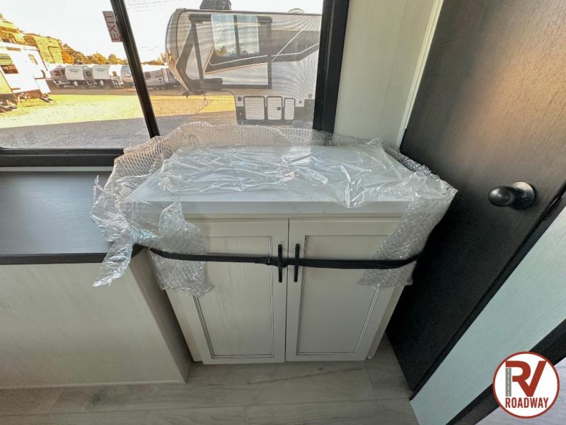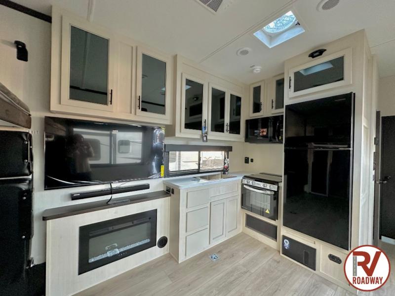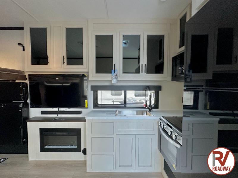Head for the trails with this toy hauler in tow! Once your toys are unloaded from the 14' 1" garage, you can relax on the dual flip-up sofas with a queen bed above. There are also optional dual lounge chairs across from the entertainment center with a cozy fireplace! The chef of your crew can make meals inside on the three-burner cooktop, or head outdoors to utilize the outside kitchen. When you're ready to call it a night, retreat to the front private bedroom for a great night's rest on the trailer king bed slide out. There is also a large dresser here to keep your things organized.