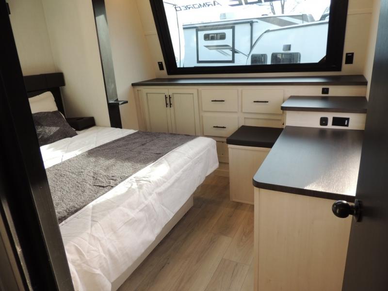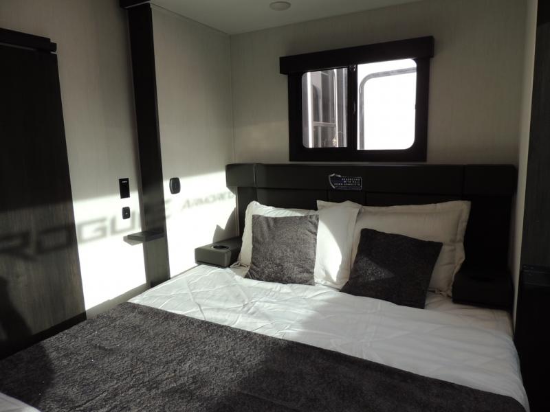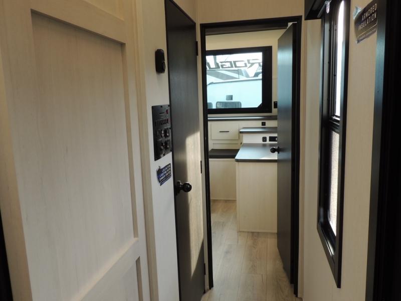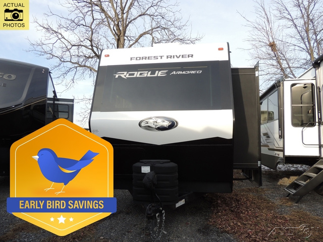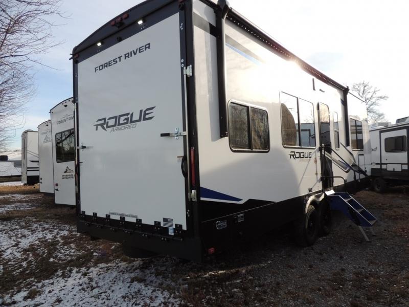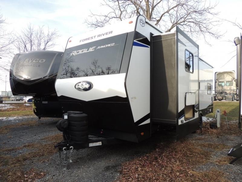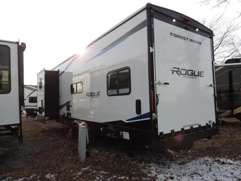 Every one of these Forest River Vengeance Rogue Armored travel trailer toy haulers come with the features you want most at an affordable price tag! The DuraPoxy gas/oil resistant floor has 5,000 lb. tie downs to ensure your toys will arrive safely without damaging the flooring, plus the 3,000 lb. rated ramp door makes it easy to load them. A 15,000 BTU A/C will keep you cool even on the hottest summer days, and there are heated enclosed holding tanks with 12V heat pads on every tank for added protection. Each model includes a fuel station with a digital readout, a ramp door patio system, a tire pressure monitoring system, and many more stand-out features. Inside, you'll find zebra shades in the living room, multiple USB charging stations, a multi-functional kitchen sink, glass shower doors, and many more comforts!
