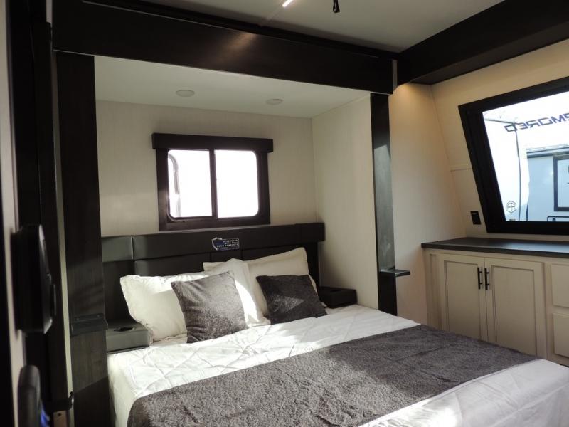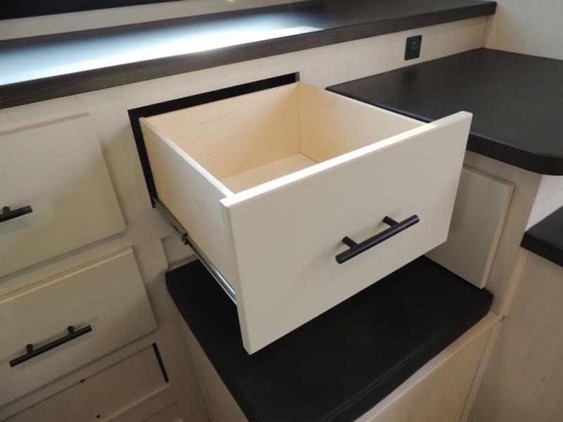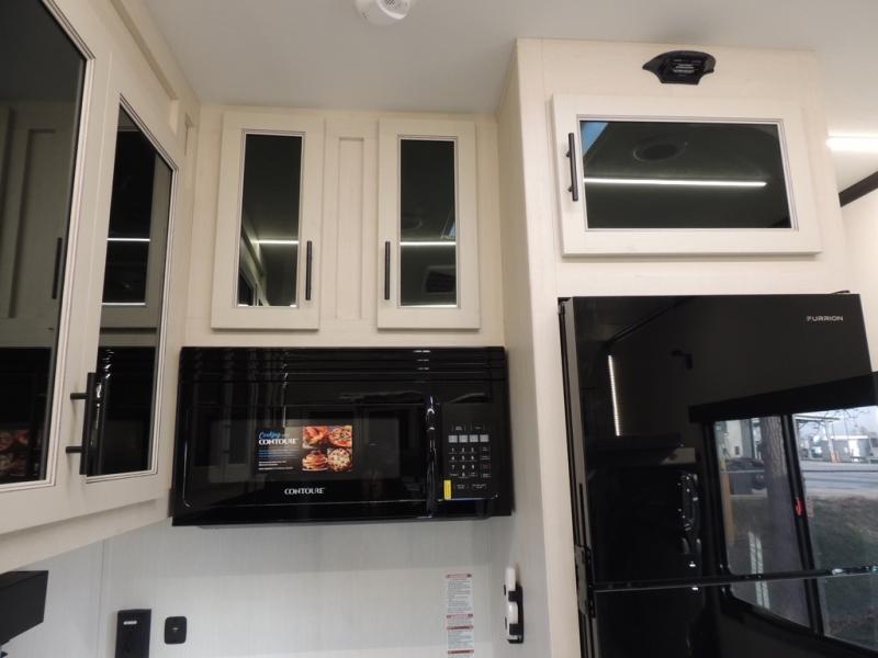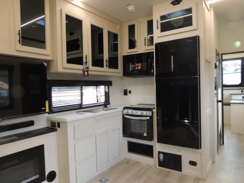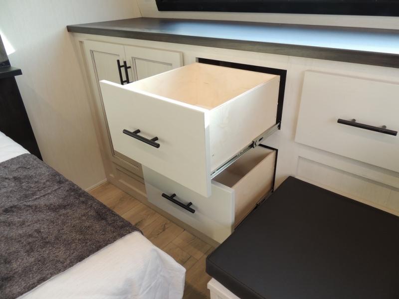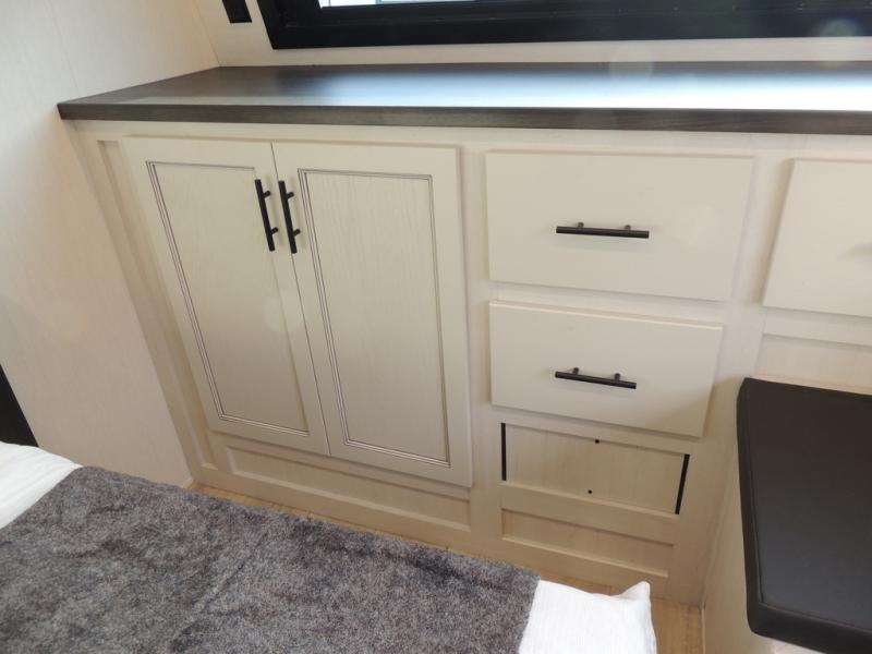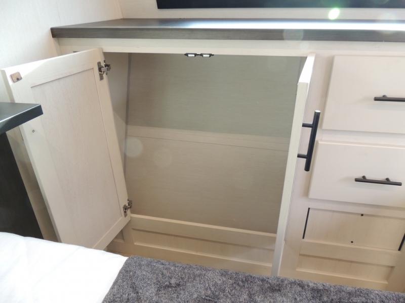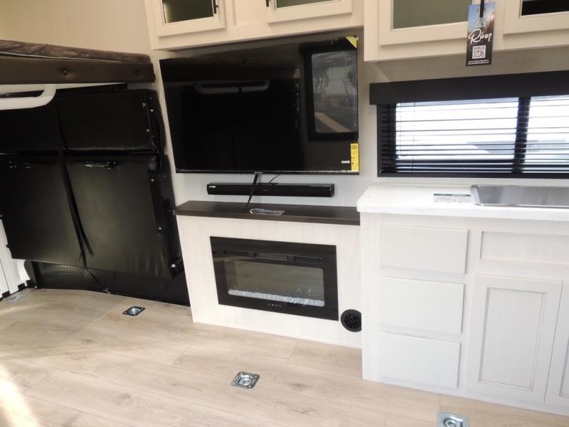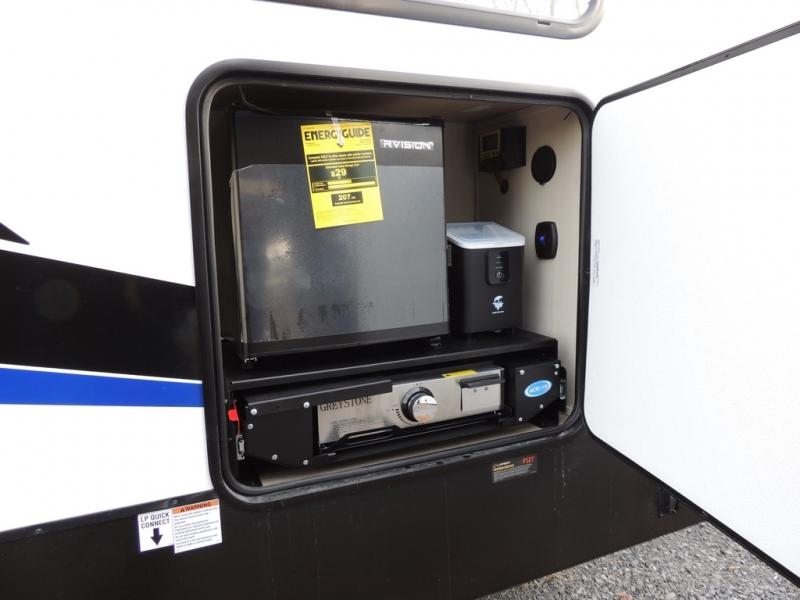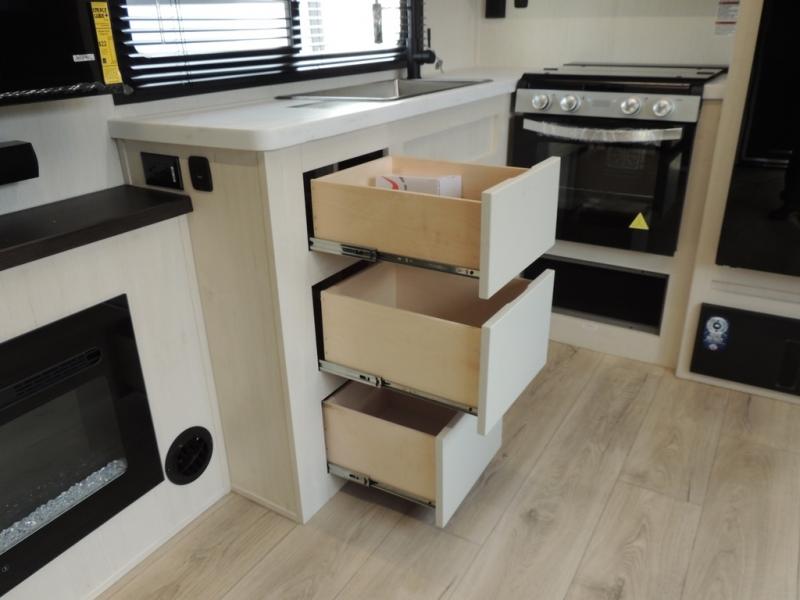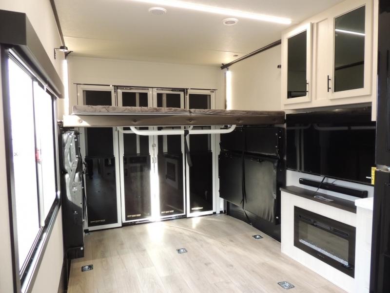 Head for the trails with this toy hauler in tow! Once your toys are unloaded from the 14' 1" garage, you can relax on the dual flip-up sofas with a queen bed above. There are also optional dual lounge chairs across from the entertainment center with a cozy fireplace! The chef of your crew can make meals inside on the three-burner cooktop, or head outdoors to utilize the outside kitchen. When you're ready to call it a night, retreat to the front private bedroom for a great night's rest on the trailer king bed slide out. There is also a large dresser here to keep your things organized.