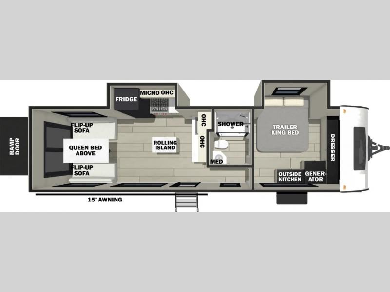 This double slide out toy hauler is ready for adventure when you are! Once your toys are unloaded using the ramp door, you can set up the flip-up sofas or set up the drop-down queen bed for guests to sleep on. You'll enjoy the front private bedroom all to yourselves that includes a king bed slide and a large dresser to keep your things organized. A three burner range and 30" microwave will let you make meals each day, and the 10.7 cu. ft. 12V refrigerator will keep your food stored away.