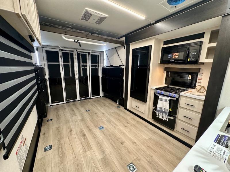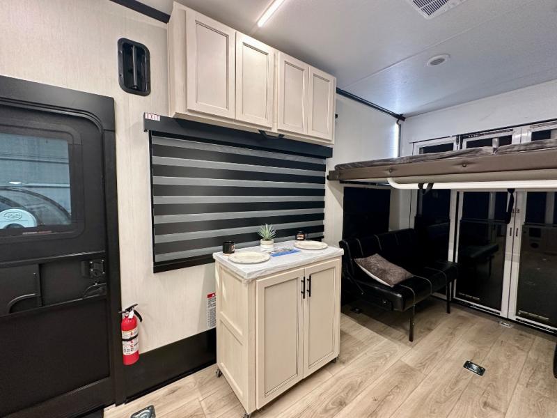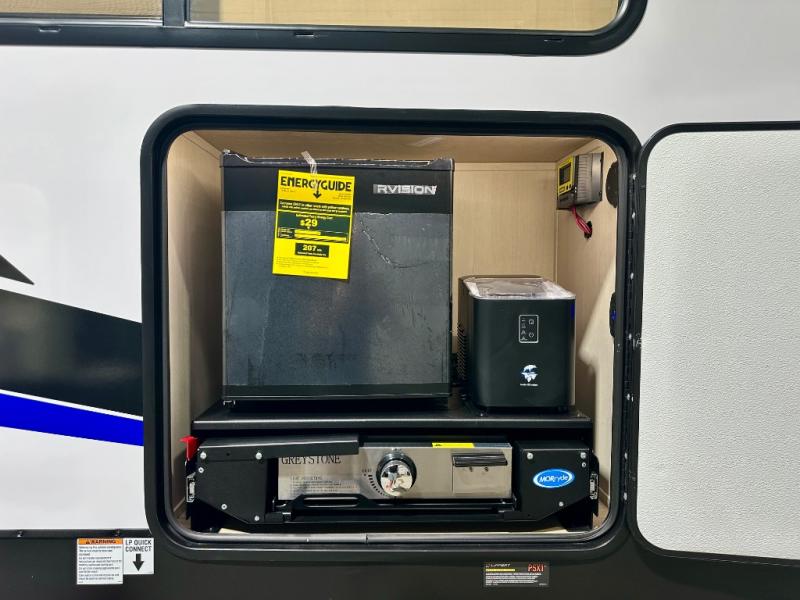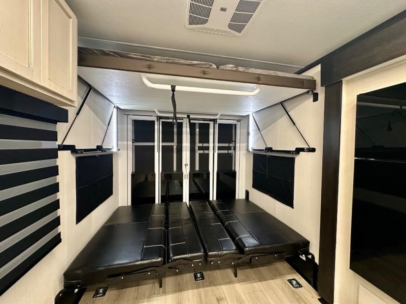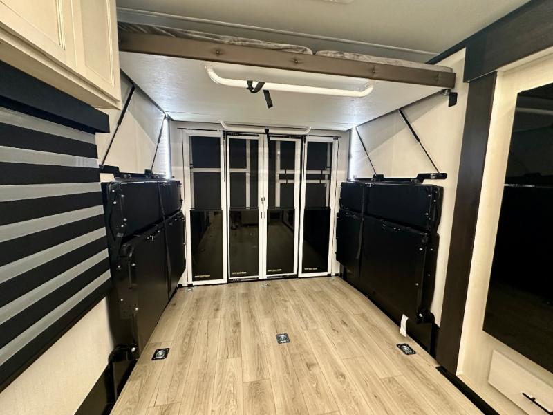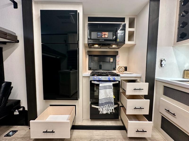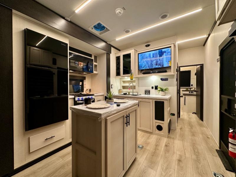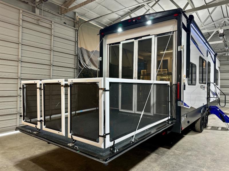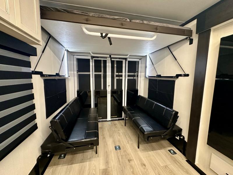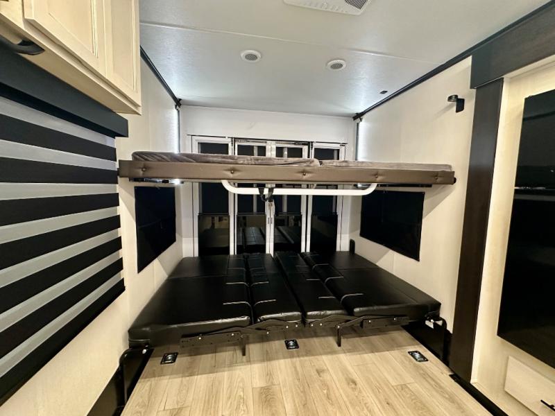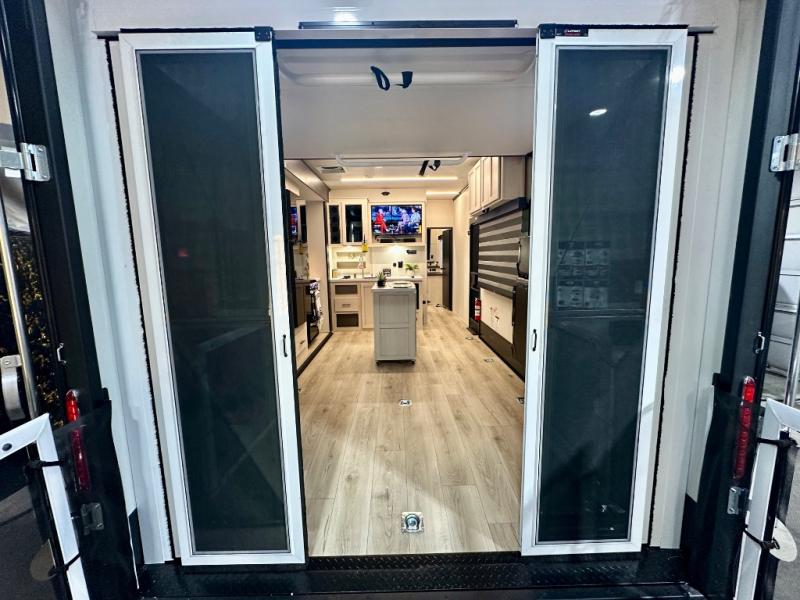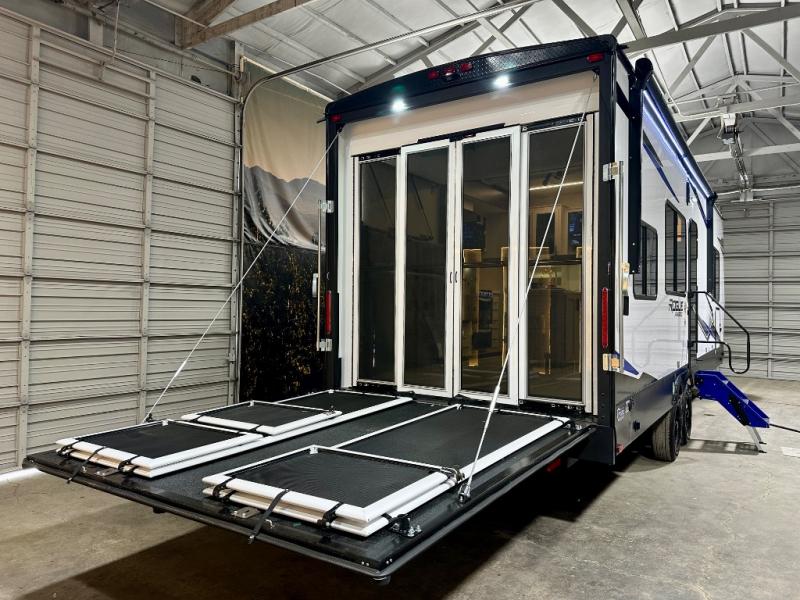 This double slide out toy hauler is ready for adventure when you are! Once your toys are unloaded using the ramp door, you can set up the flip-up sofas or set up the drop-down queen bed for guests to sleep on. You'll enjoy the front private bedroom all to yourselves that includes a king bed slide and a large dresser to keep your things organized. A three burner range and 30" microwave will let you make meals each day, and the 10.7 cu. ft. 12V refrigerator will keep your food stored away.