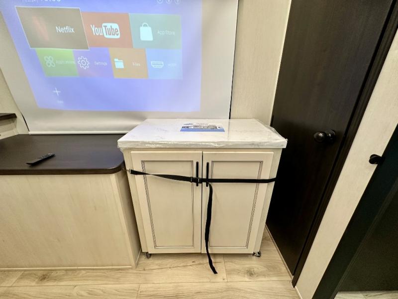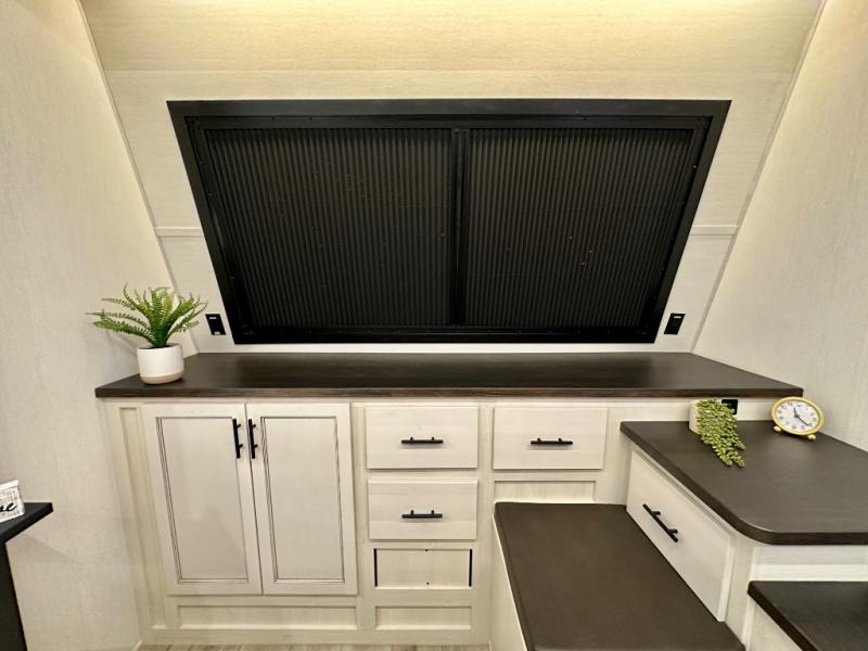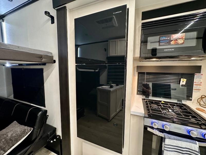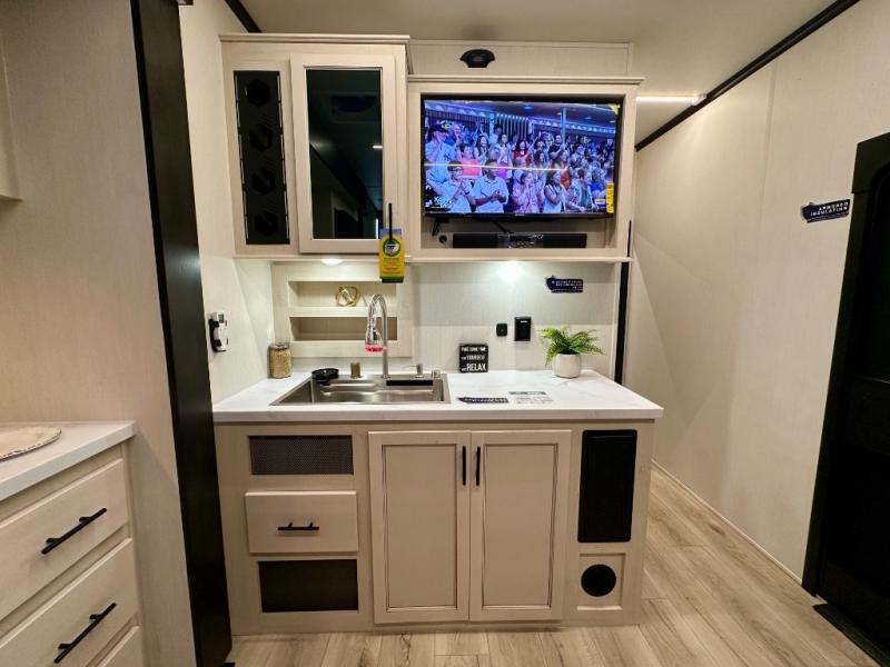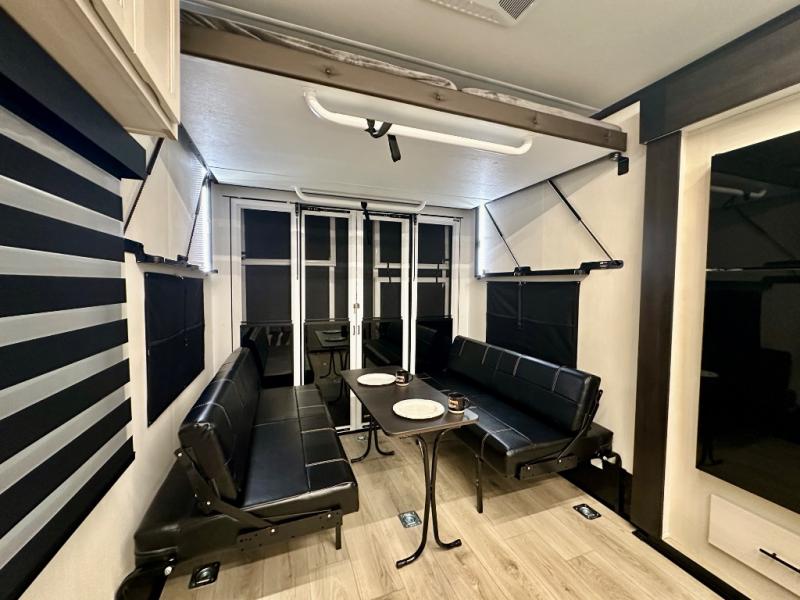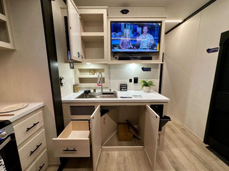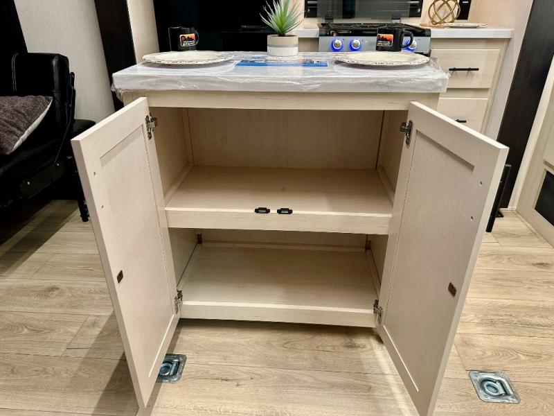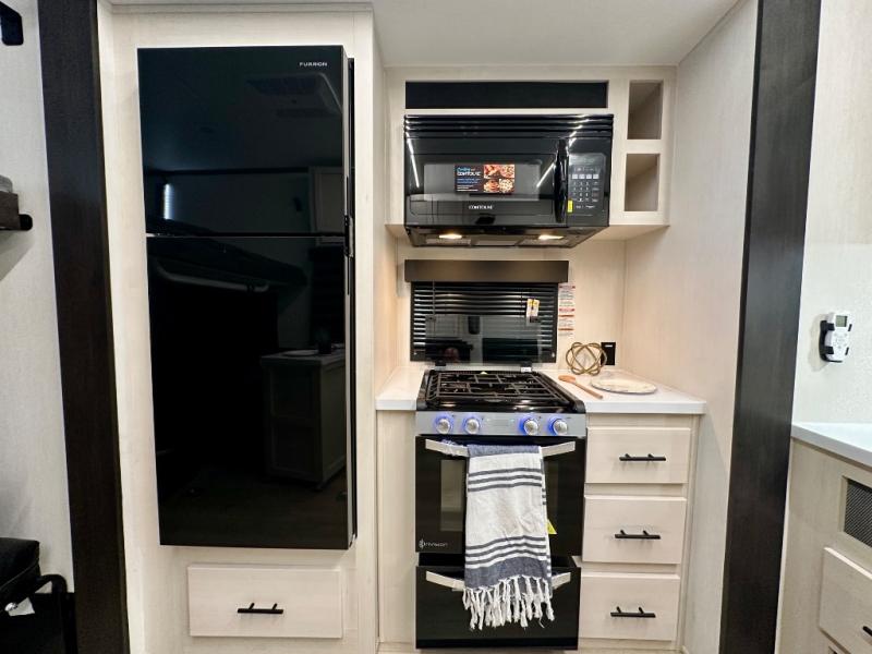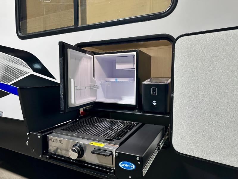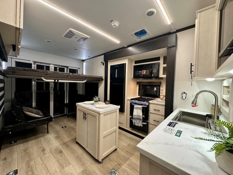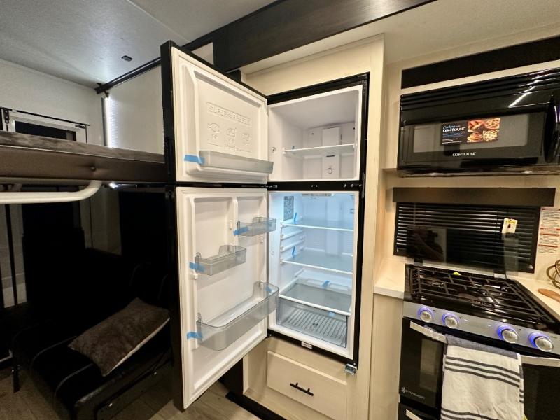 This double slide out toy hauler is ready for adventure when you are! Once your toys are unloaded using the ramp door, you can set up the flip-up sofas or set up the drop-down queen bed for guests to sleep on. You'll enjoy the front private bedroom all to yourselves that includes a king bed slide and a large dresser to keep your things organized. A three burner range and 30" microwave will let you make meals each day, and the 10.7 cu. ft. 12V refrigerator will keep your food stored away.