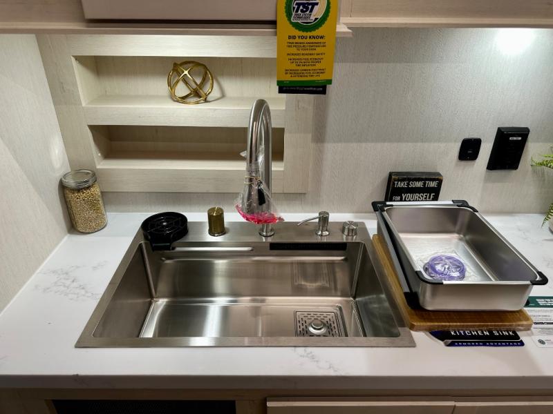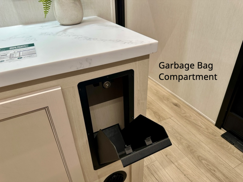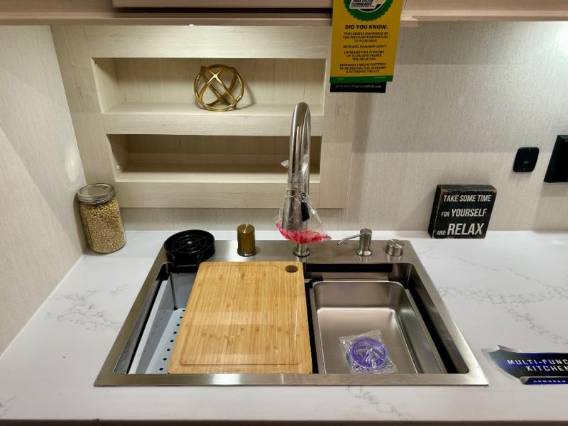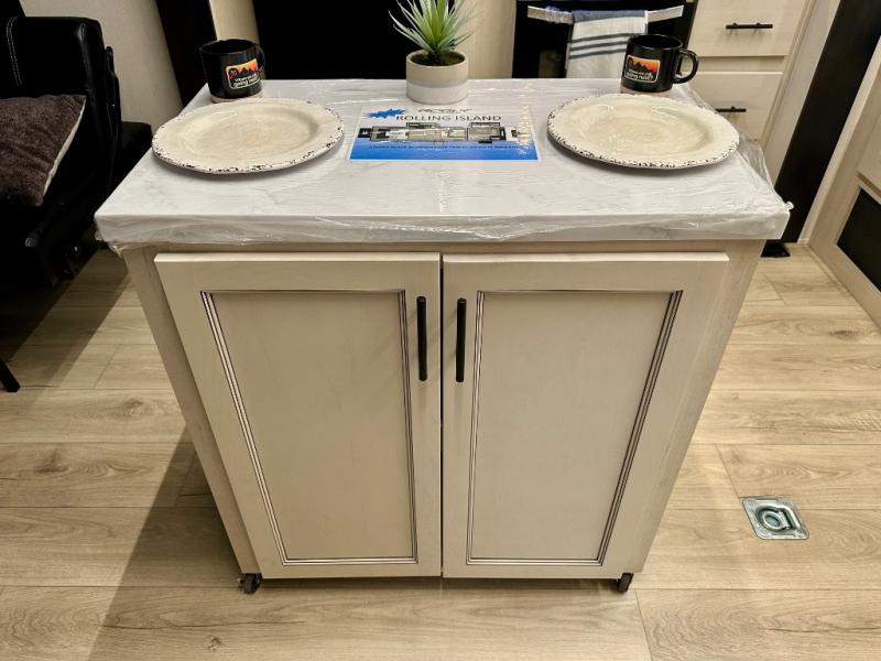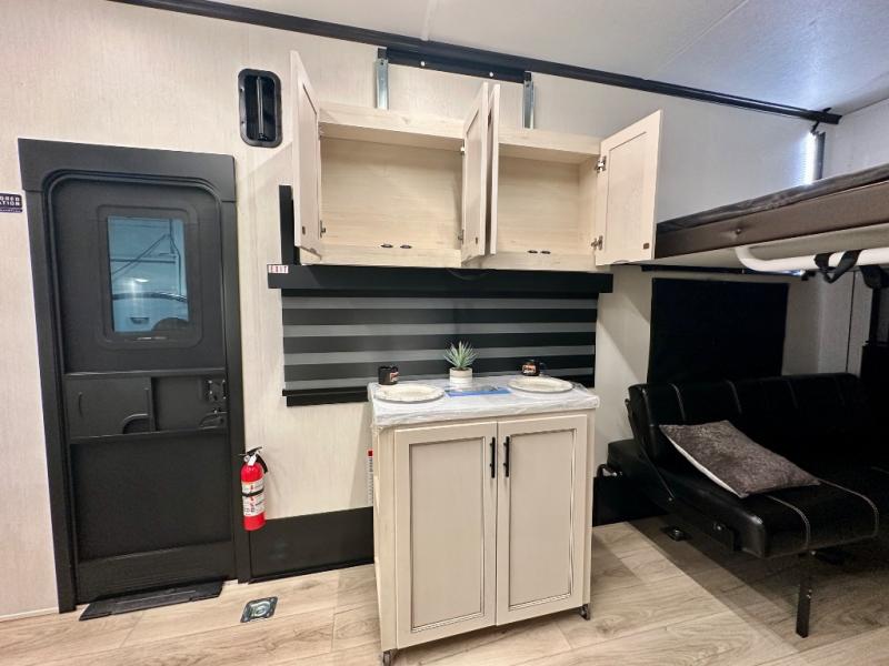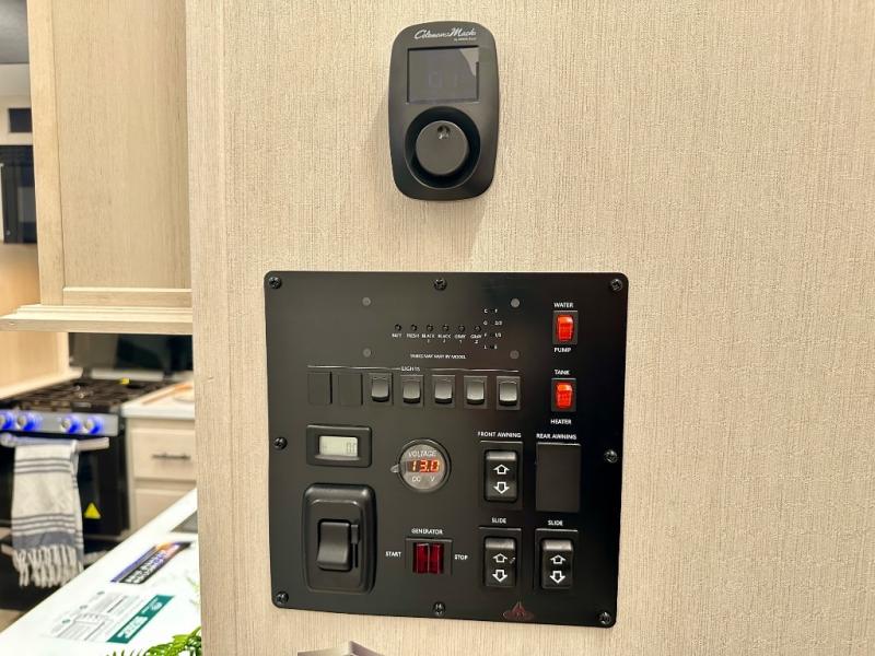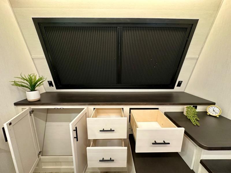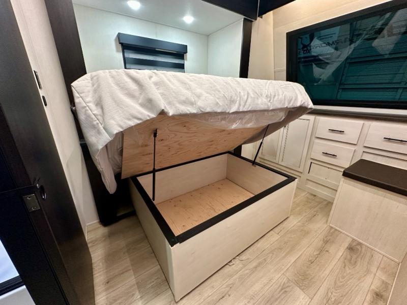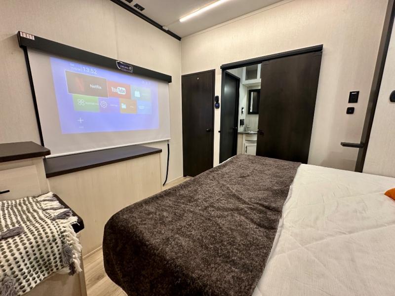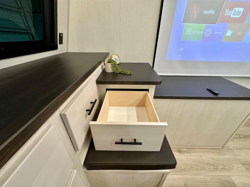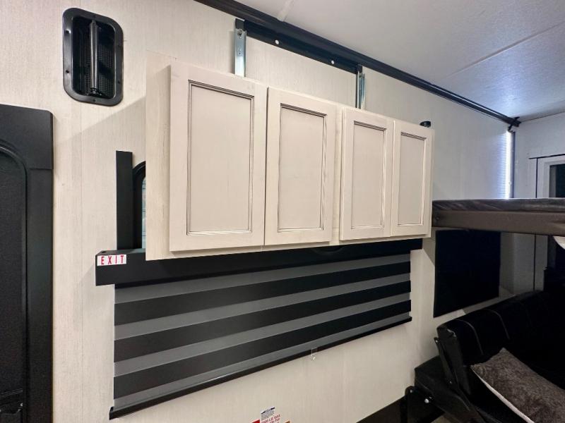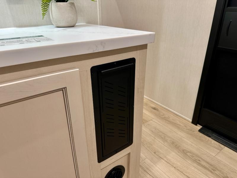 This double slide out toy hauler is ready for adventure when you are! Once your toys are unloaded using the ramp door, you can set up the flip-up sofas or set up the drop-down queen bed for guests to sleep on. You'll enjoy the front private bedroom all to yourselves that includes a king bed slide and a large dresser to keep your things organized. A three burner range and 30" microwave will let you make meals each day, and the 10.7 cu. ft. 12V refrigerator will keep your food stored away.