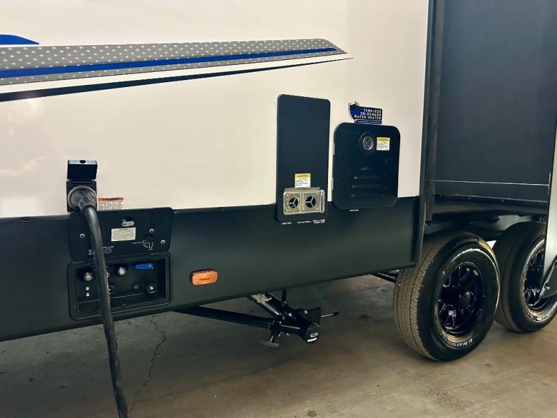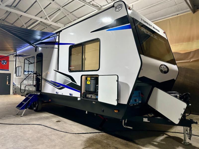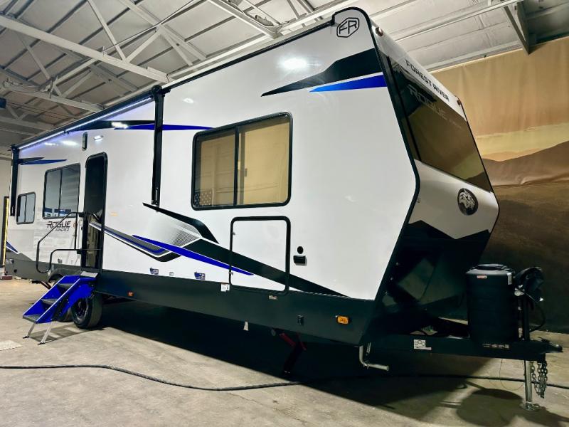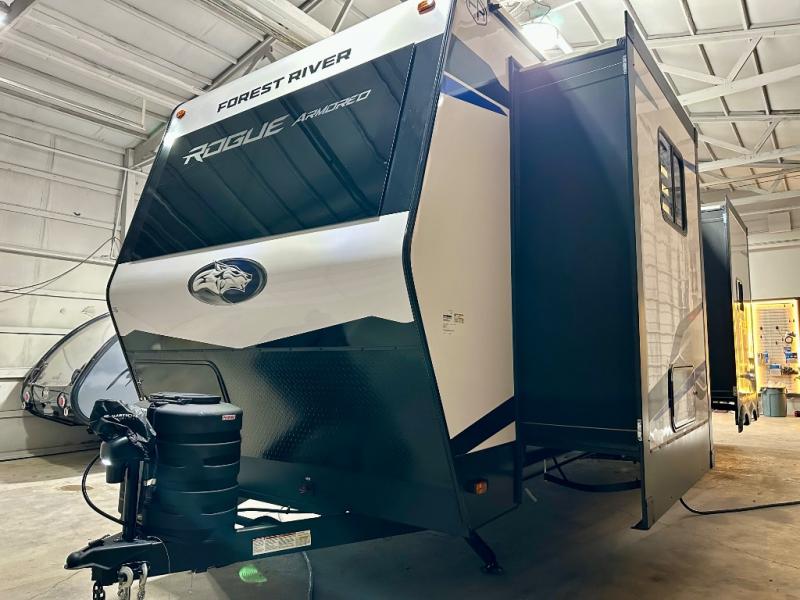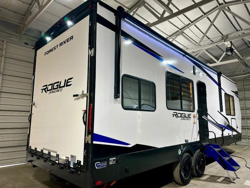 Every one of these Forest River Vengeance Rogue Armored travel trailer toy haulers come with the features you want most at an affordable price tag! The DuraPoxy gas/oil resistant floor has 5,000 lb. tie downs to ensure your toys will arrive safely without damaging the flooring, plus the 3,000 lb. rated ramp door makes it easy to load them. A 15,000 BTU A/C will keep you cool even on the hottest summer days, and an Armored underbelly helps keep your unit's vitals protected. The Rogue Ready package comes a fuel station with a pump, a ramp door patio system, a TST tire pressure monitoring system, and many more stand-out features. And don't overlook the Rogue Premium Package with an 8' weatherproof ramp door, an exterior TV hookup for the option to add a television, blue accent wheels, and solar reflective safety glass windows to name a few conveniences.