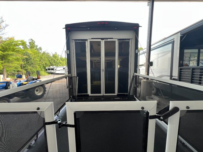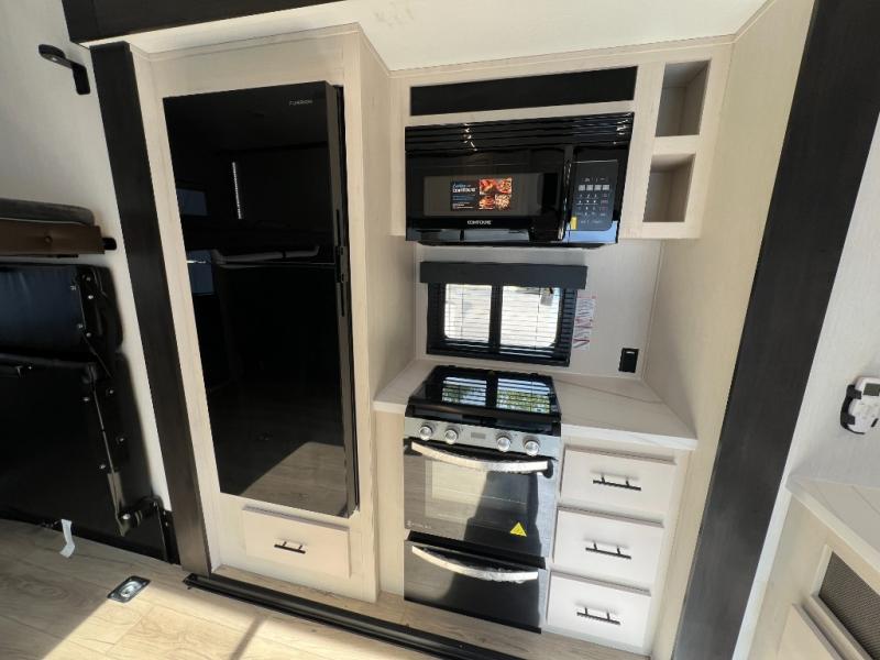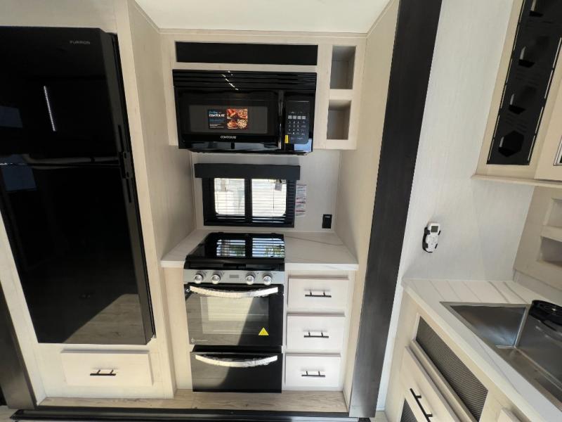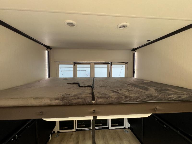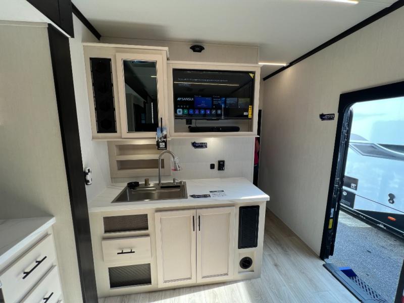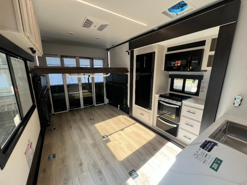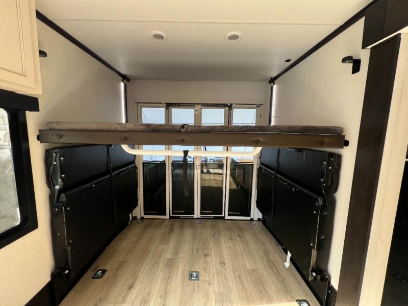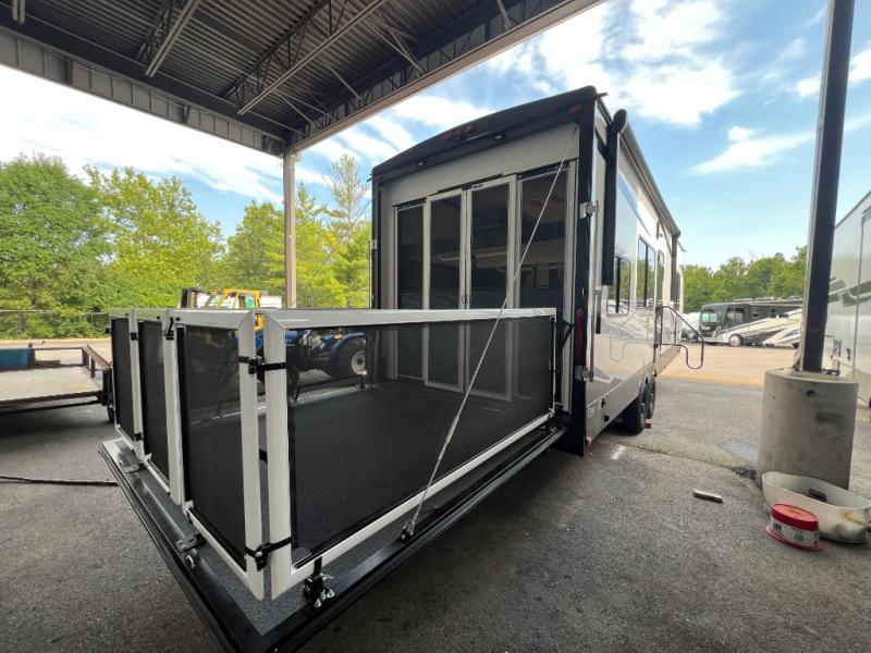 This double slide out toy hauler is ready for adventure when you are! Once your toys are unloaded using the ramp door, you can set up the flip-up sofas or set up the drop-down queen bed for guests to sleep on. You'll enjoy the front private bedroom all to yourselves that includes a king bed slide and a large dresser to keep your things organized. A three burner range and 30" microwave will let you make meals each day, and the 10.7 cu. ft. 12V refrigerator will keep your food stored away.