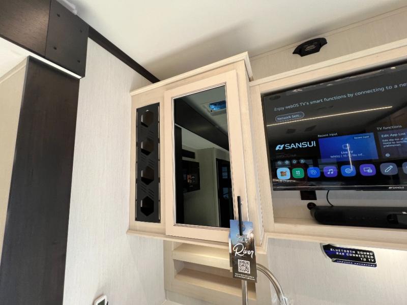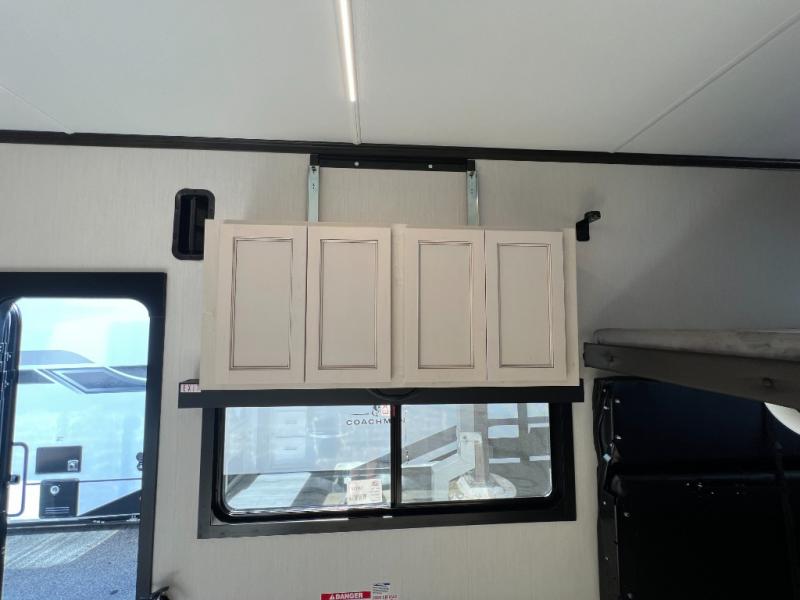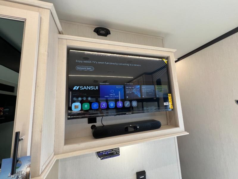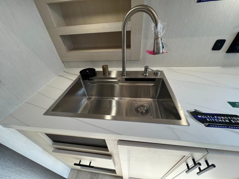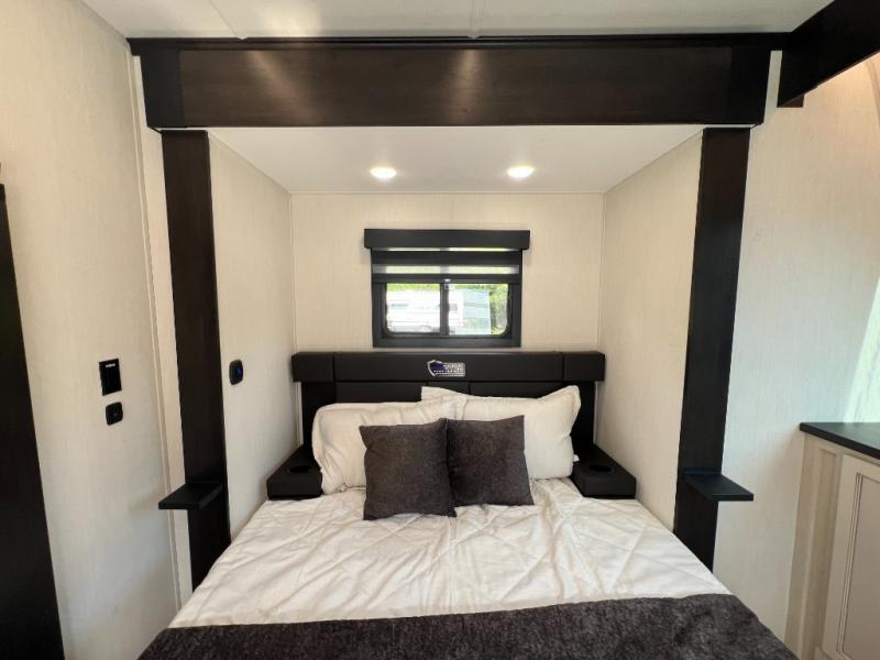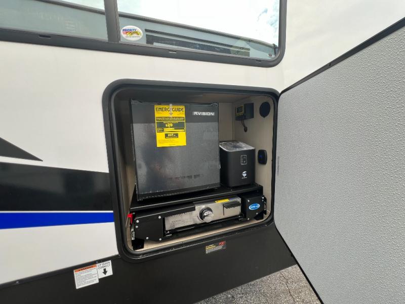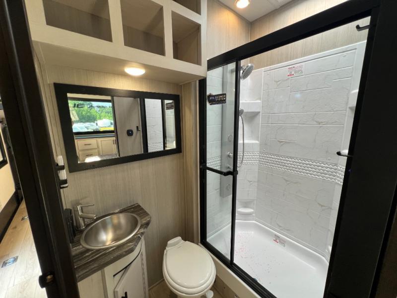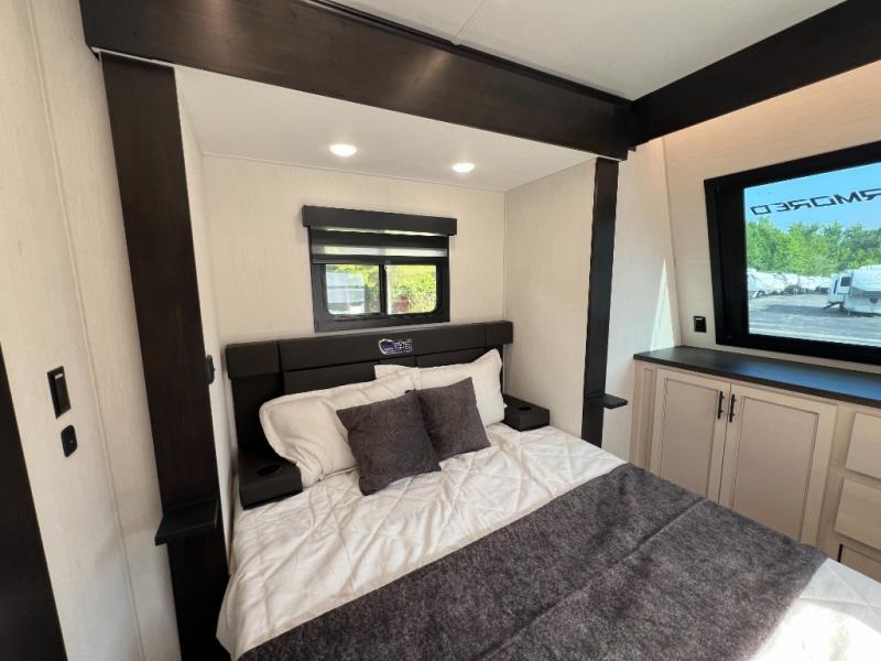 This double slide out toy hauler is ready for adventure when you are! Once your toys are unloaded using the ramp door, you can set up the flip-up sofas or set up the drop-down queen bed for guests to sleep on. You'll enjoy the front private bedroom all to yourselves that includes a king bed slide and a large dresser to keep your things organized. A three burner range and 30" microwave will let you make meals each day, and the 10.7 cu. ft. 12V refrigerator will keep your food stored away.