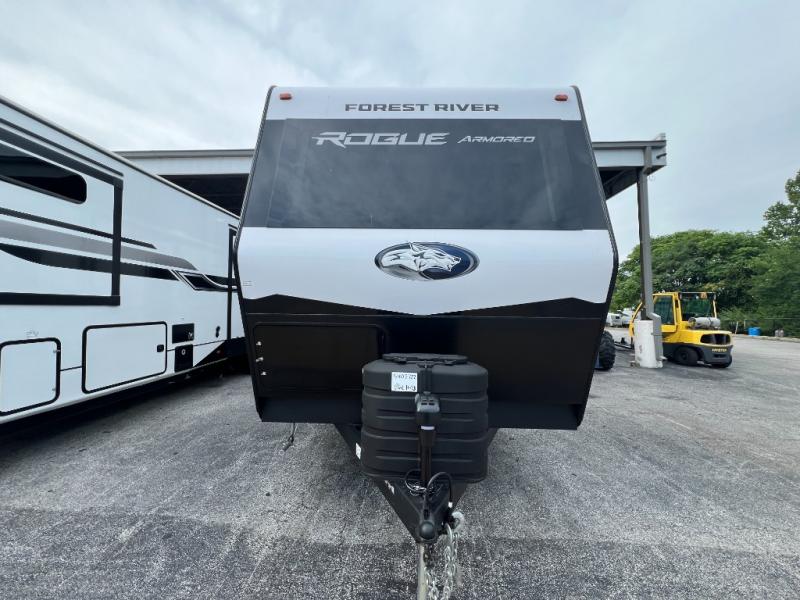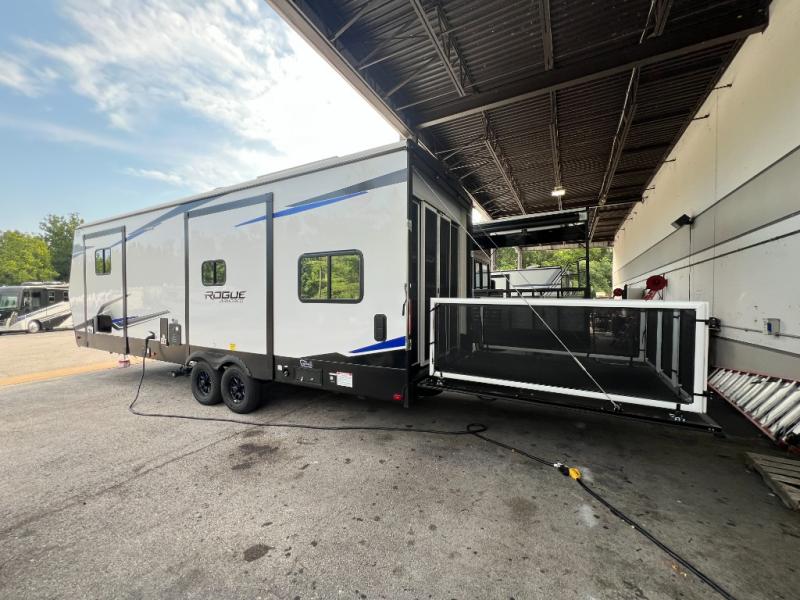 Every one of these Forest River Vengeance Rogue Armored travel trailer toy haulers come with the features you want most at an affordable price tag! The DuraPoxy gas/oil resistant floor has 5,000 lb. tie downs to ensure your toys will arrive safely without damaging the flooring, plus the 3,000 lb. rated ramp door makes it easy to load them. A 15,000 BTU A/C will keep you cool even on the hottest summer days, and an Armored underbelly helps keep your unit's vitals protected. The Rogue Ready package comes a fuel station with a pump, a ramp door patio system, a TST tire pressure monitoring system, and many more stand-out features. And don't overlook the Rogue Premium Package with an 8' weatherproof ramp door, an exterior TV hookup for the option to add a television, blue accent wheels, and solar reflective safety glass windows to name a few conveniences.