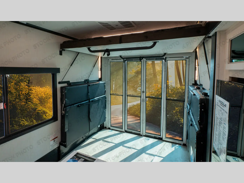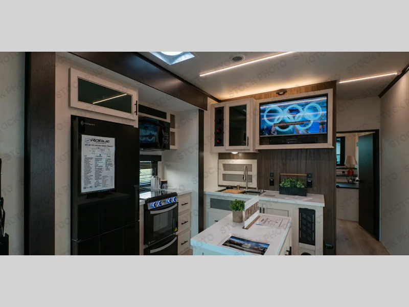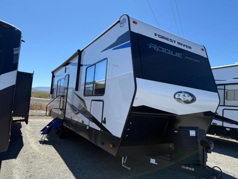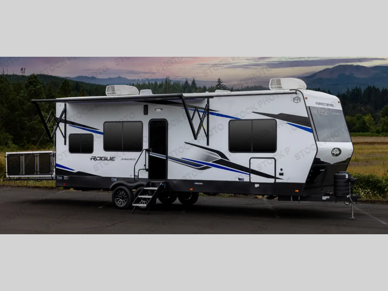 Every one of these Forest River Vengeance Rogue Armored travel trailer toy haulers come with the features you want most at an affordable price tag! The DuraPoxy gas/oil resistant floor has 5,000 lb. tie downs to ensure your toys will arrive safely without damaging the flooring, plus the 3,000 lb. rated ramp door makes it easy to load them. A 15,000 BTU A/C will keep you cool even on the hottest summer days, and an Armored underbelly helps keep your unit's vitals protected. The Rogue Ready package comes a fuel station with a pump, a ramp door patio system, a TST tire pressure monitoring system, and many more stand-out features. And don't overlook the Rogue Premium Package with an 8' weatherproof ramp door, an exterior TV hookup for the option to add a television, blue accent wheels, and solar reflective safety glass windows to name a few conveniences.