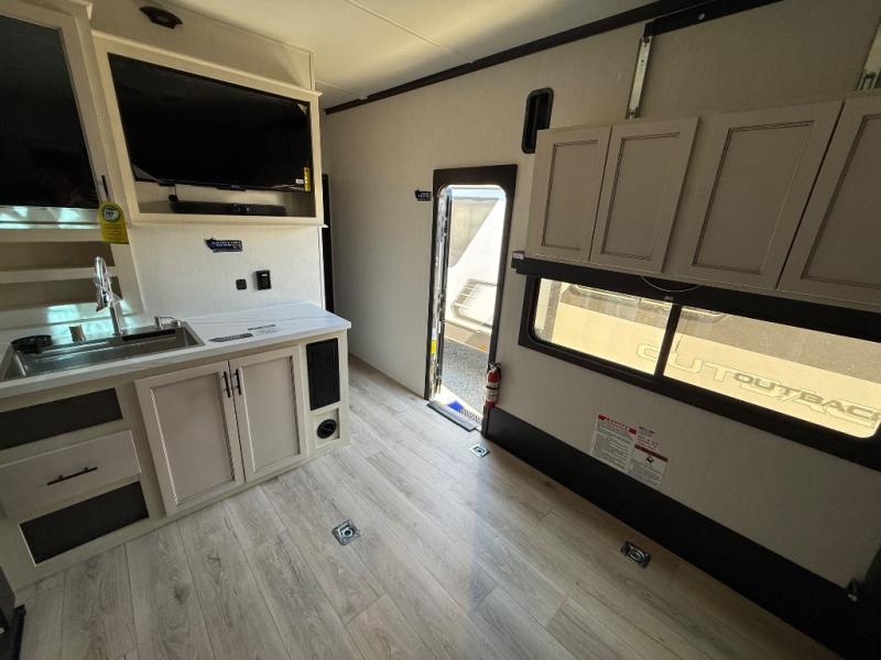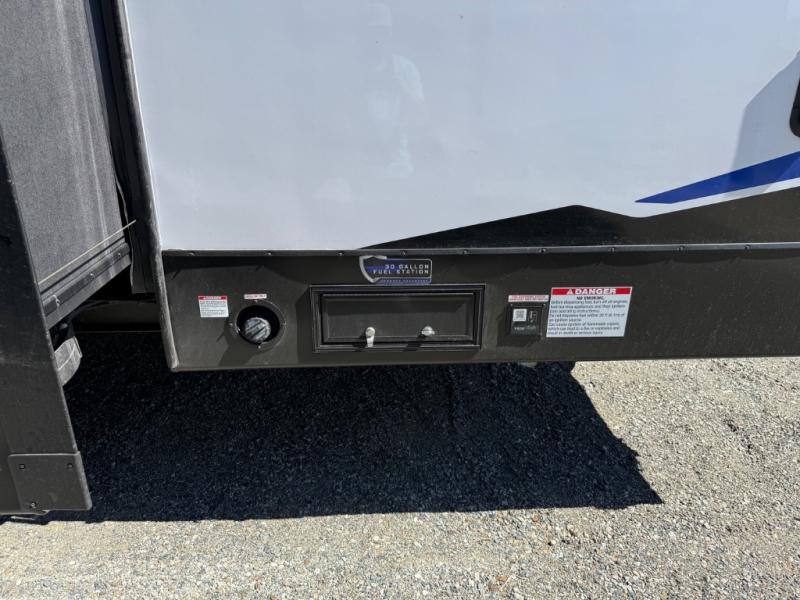 This double slide out toy hauler is ready for adventure when you are! Once your toys are unloaded using the ramp door, you can set up the flip-up sofas or set up the drop-down queen bed for guests to sleep on. You'll enjoy the front private bedroom all to yourselves that includes a king bed slide and a large dresser to keep your things organized. A three burner range and 30" microwave will let you make meals each day, and the 10.7 cu. ft. 12V refrigerator will keep your food stored away.
