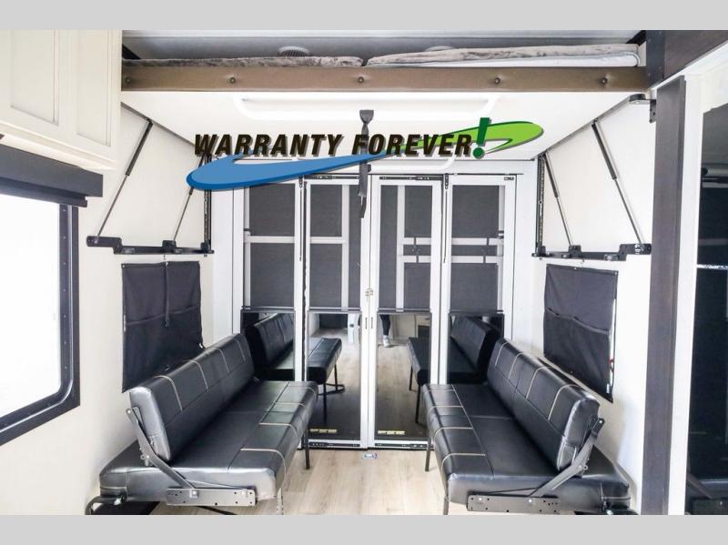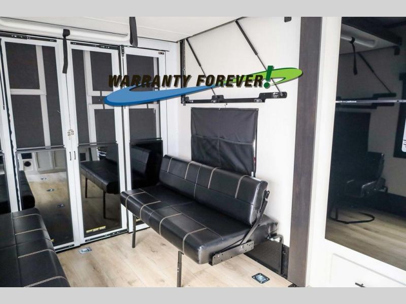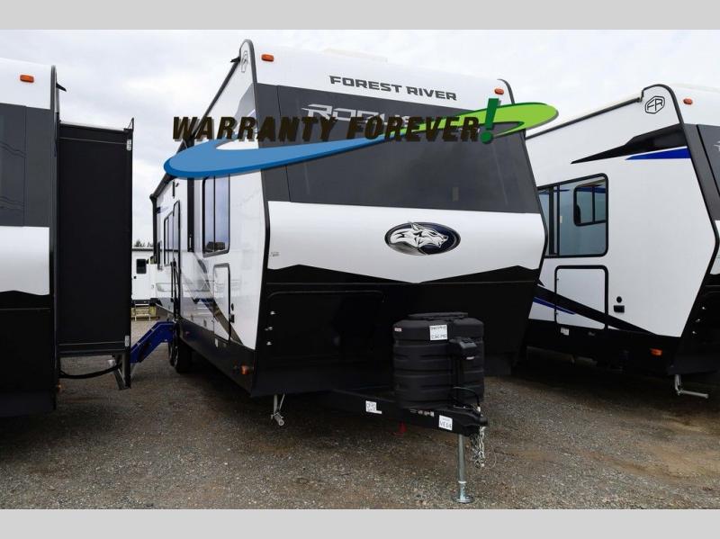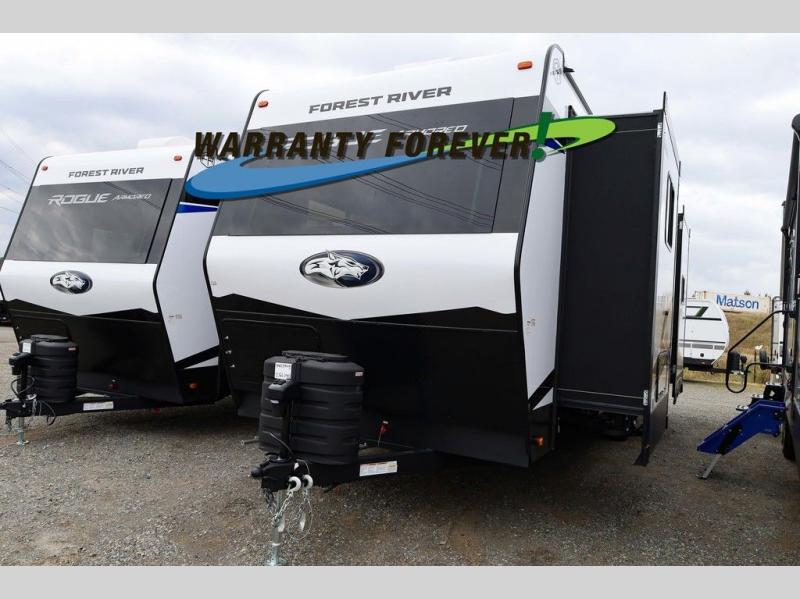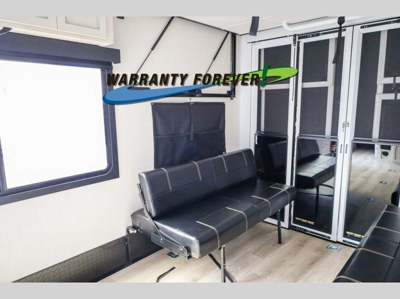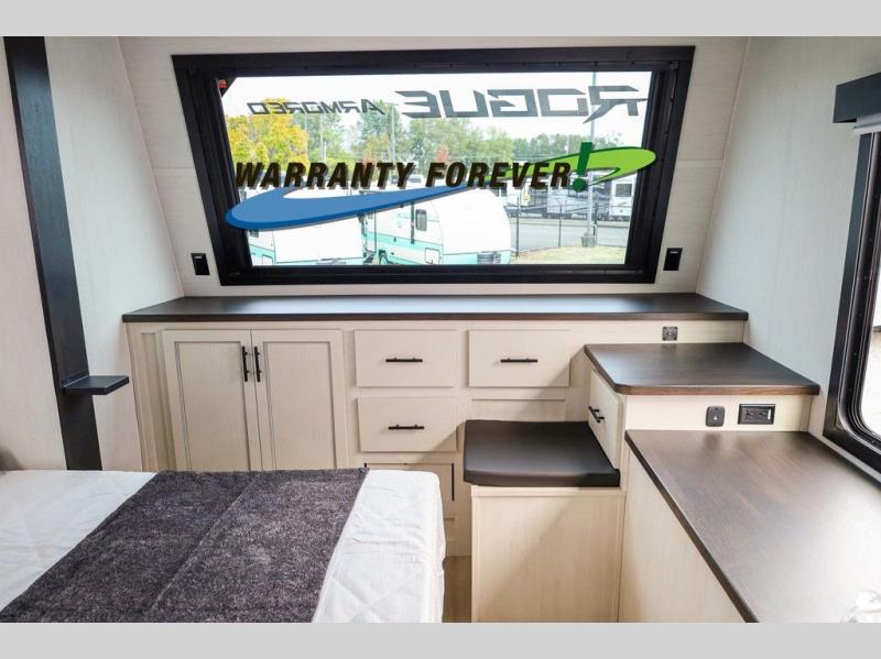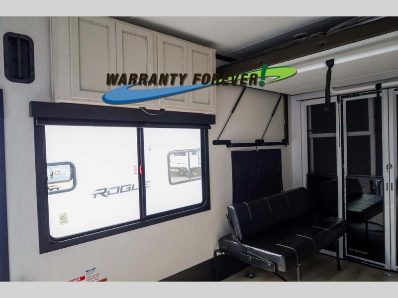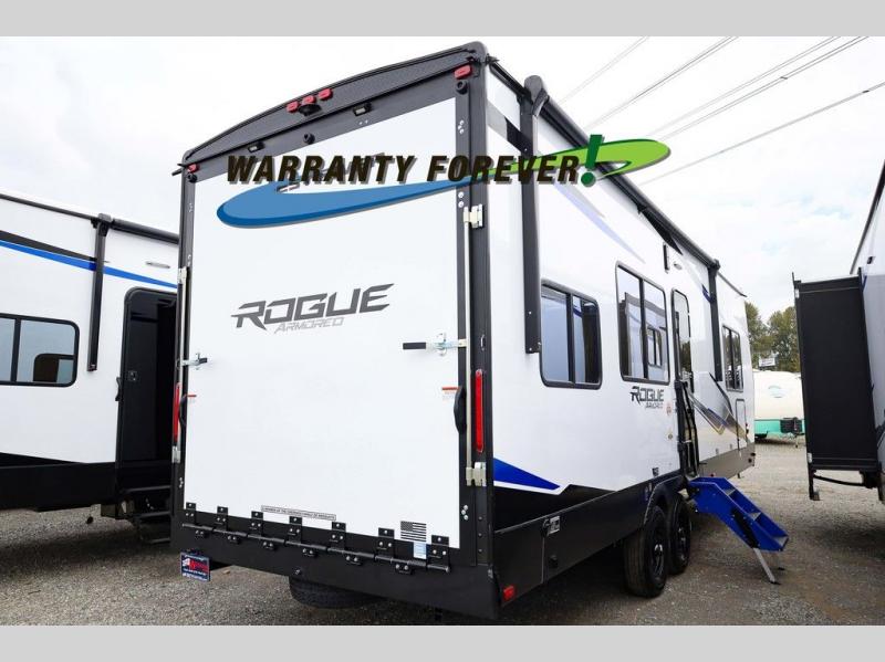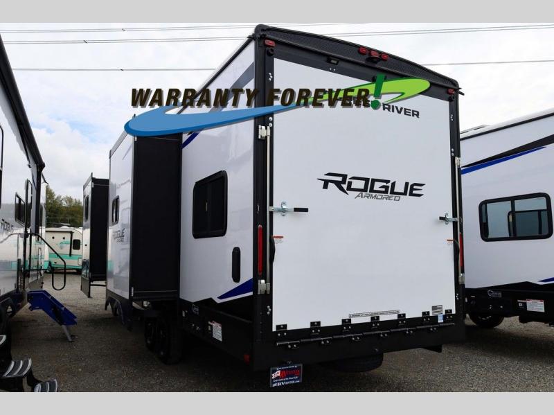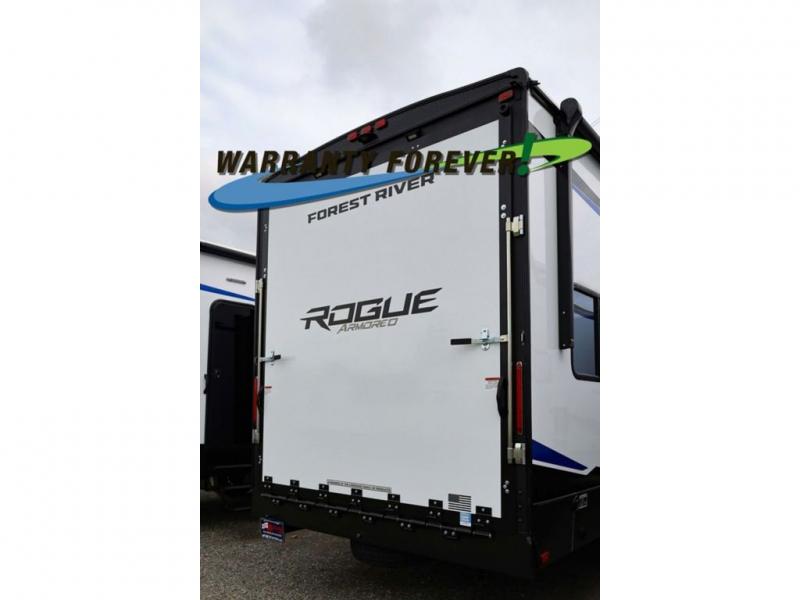 Every one of these Forest River Vengeance Rogue Armored travel trailer toy haulers come with the features you want most at an affordable price tag! The DuraPoxy gas/oil resistant floor has 5,000 lb. tie downs to ensure your toys will arrive safely without damaging the flooring, plus the 3,000 lb. rated ramp door makes it easy to load them. A 15,000 BTU A/C will keep you cool even on the hottest summer days, and there are heated enclosed holding tanks with 12V heat pads on every tank for added protection. Each model includes a fuel station with a digital readout, a ramp door patio system, a tire pressure monitoring system, and many more stand-out features. Inside, you'll find zebra shades in the living room, multiple USB charging stations, a multi-functional kitchen sink, glass shower doors, and many more comforts!