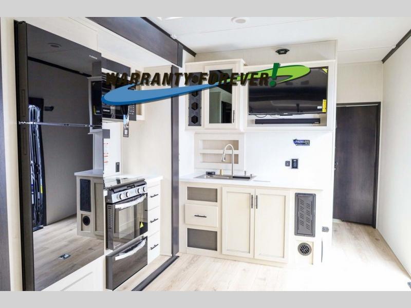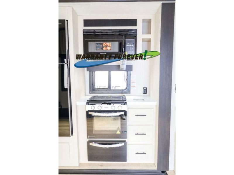 This double slide out toy hauler is ready for adventure when you are! Once your toys are unloaded using the ramp door, you can set up the flip-up sofas or set up the drop-down queen bed for guests to sleep on. You'll enjoy the front private bedroom all to yourselves that includes a king bed slide and a large dresser to keep your things organized. A three-burner range and 30" microwave will let you make meals each day, and the 10.7 cu. ft. 12V refrigerator will keep your food stored away.