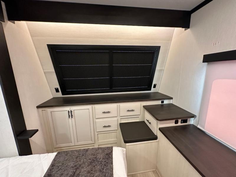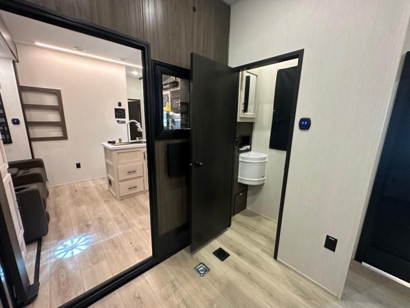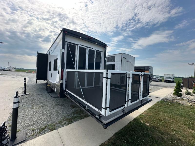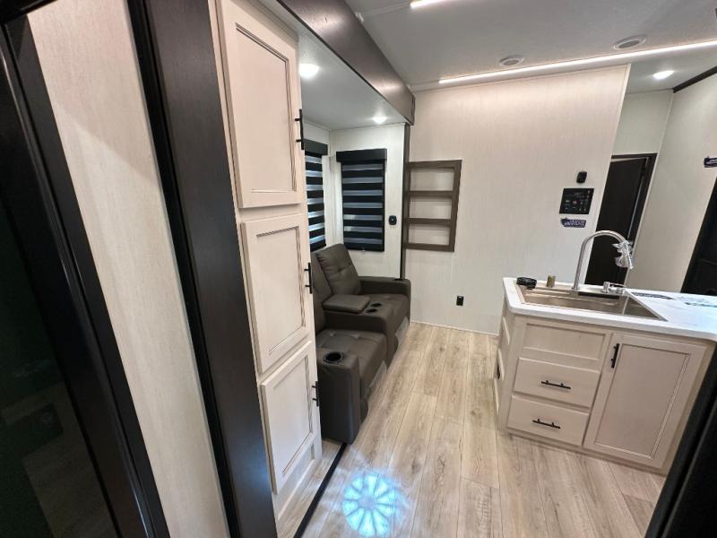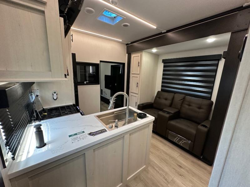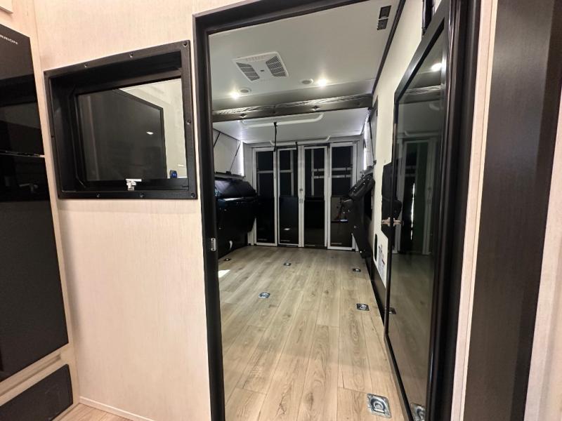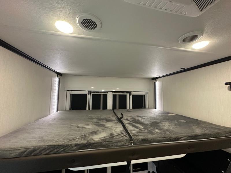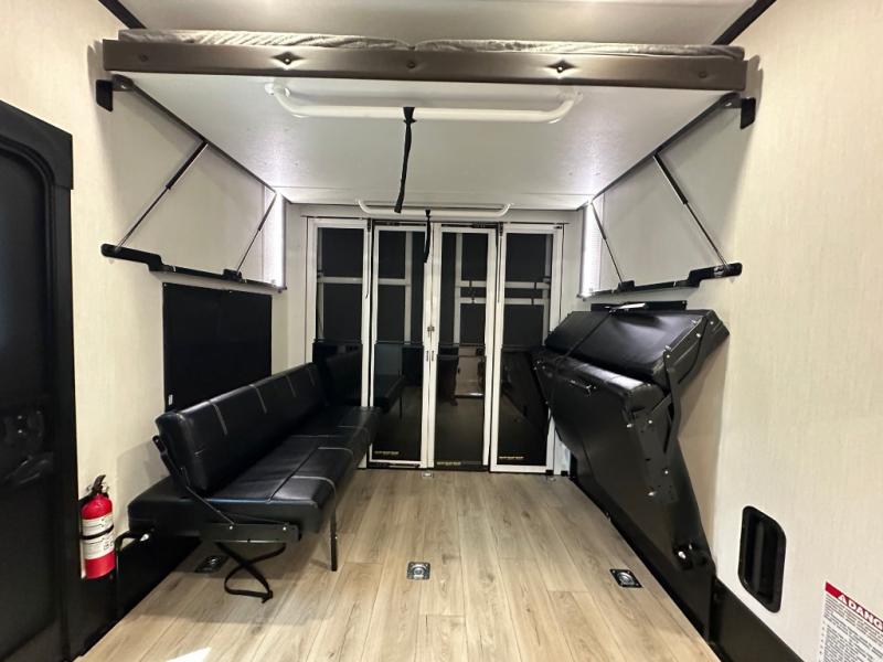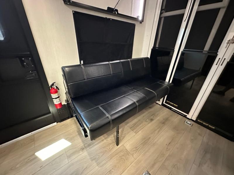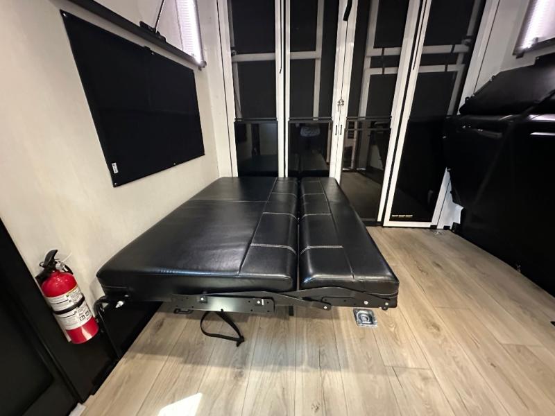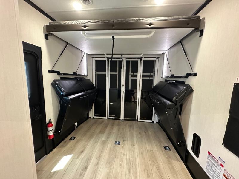 This double slide out toy hauler is ready for adventure when you are! Once your toys are unloaded from the separate garage, you can set up the flip-up sofas or set up the drop-down queen bed for guests to sleep on, and there is even a half bath here for added convenience. You'll enjoy the front private bedroom all to yourselves that includes a king bed slide and a large dresser to keep your things organized. The combined kitchen and living area includes a three burner range and 30" microwave to make meals, a sofa with recliners to relax on, plus a 12V refrigerator and pantry for food storage.