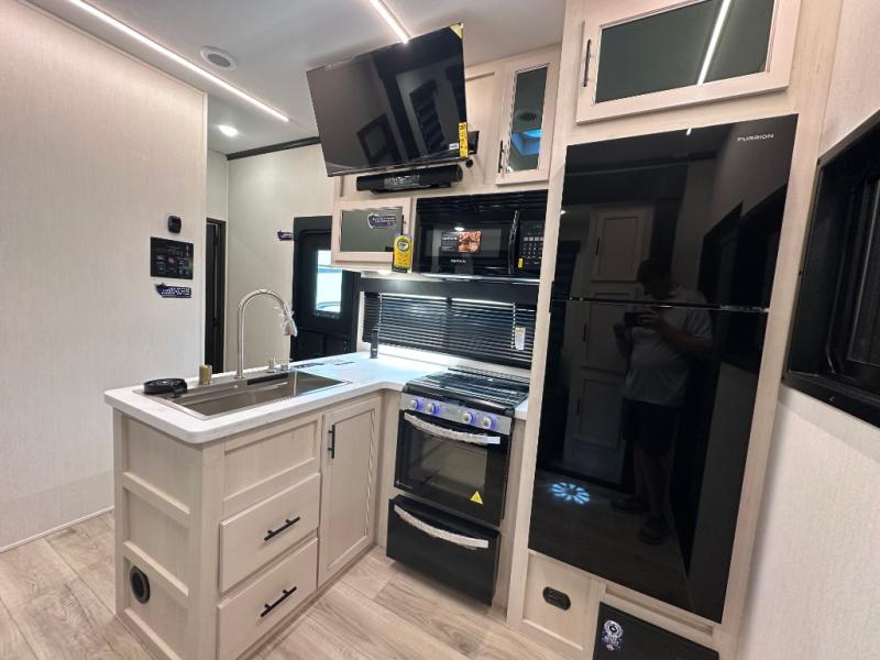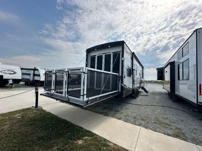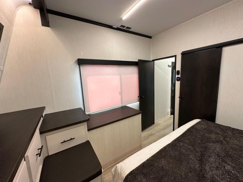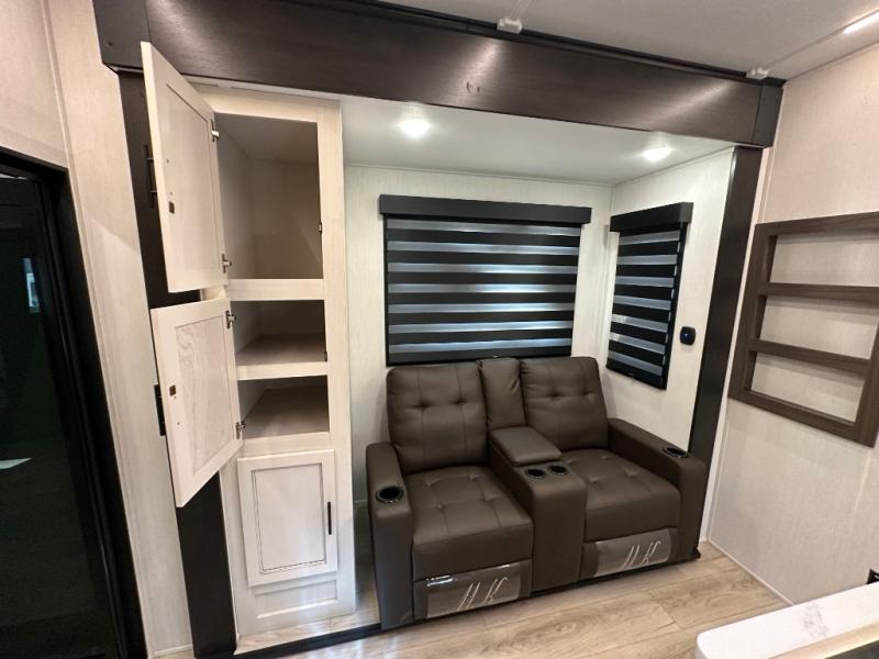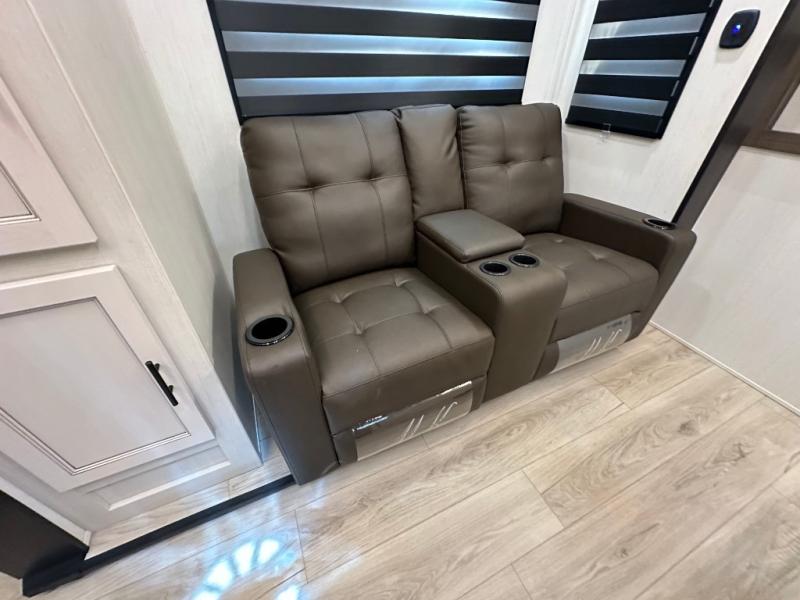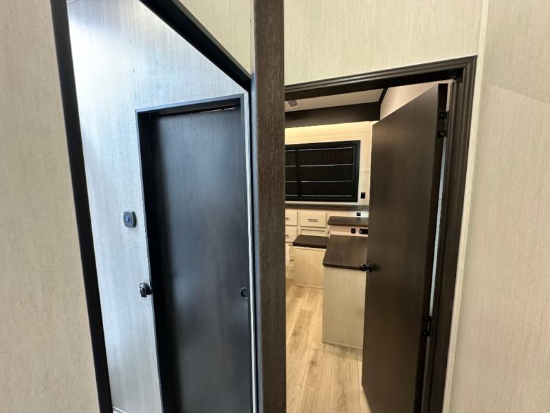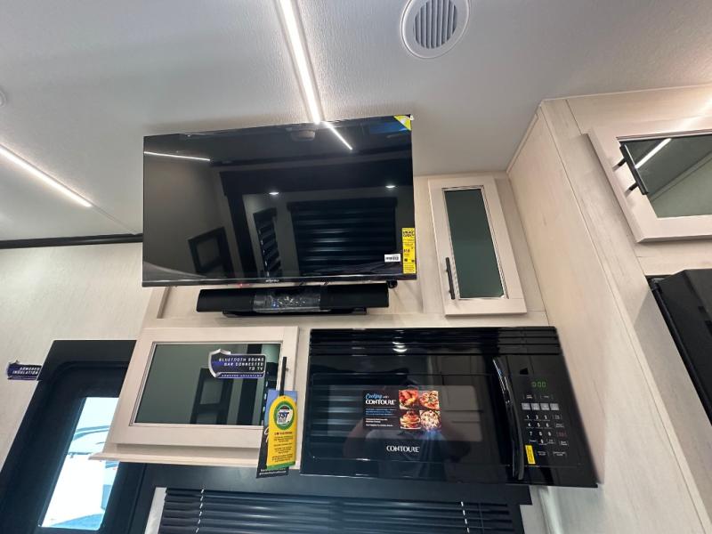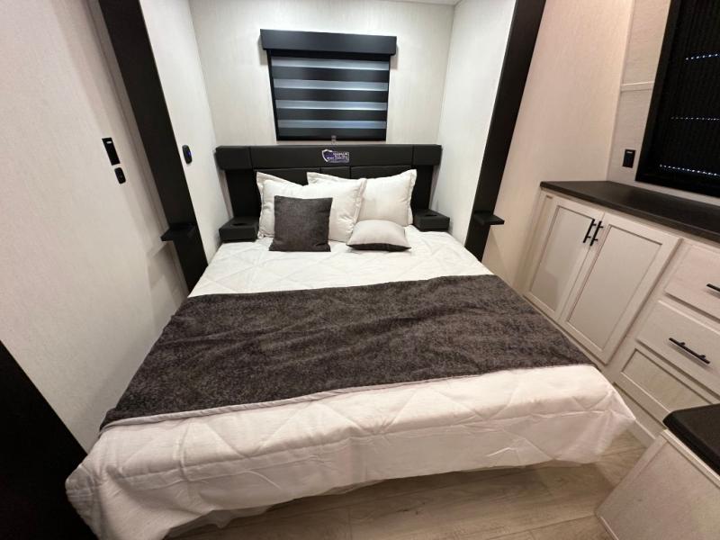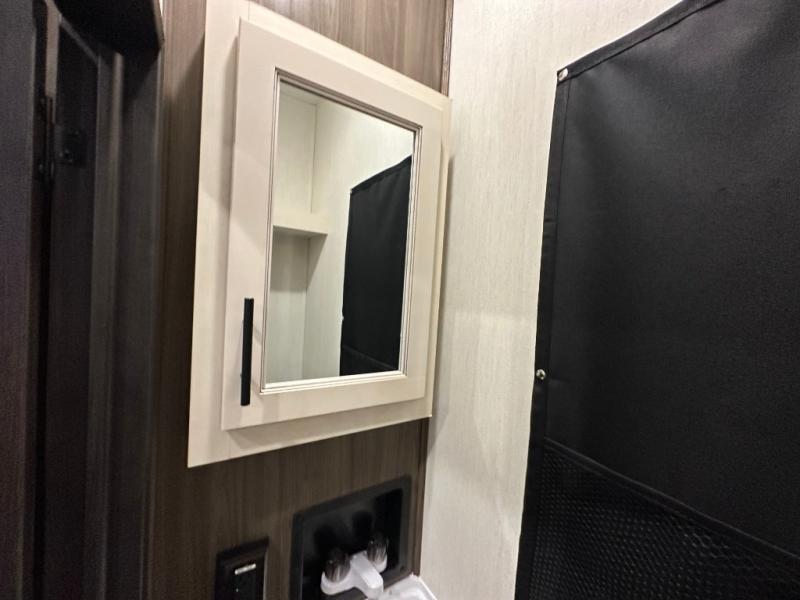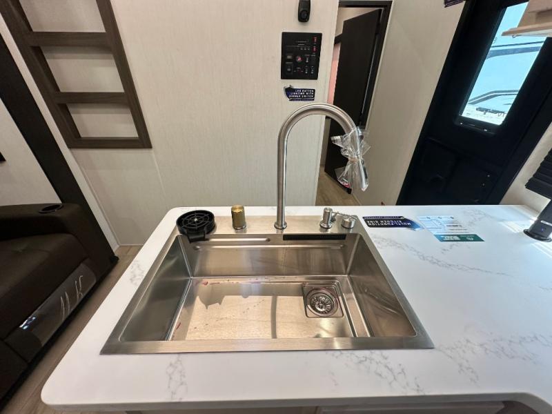 This double slide out toy hauler is ready for adventure when you are! Once your toys are unloaded from the separate garage, you can set up the flip-up sofas or set up the drop-down queen bed for guests to sleep on, and there is even a half bath here for added convenience. You'll enjoy the front private bedroom all to yourselves that includes a king bed slide and a large dresser to keep your things organized. The combined kitchen and living area includes a three burner range and 30" microwave to make meals, a sofa with recliners to relax on, plus a 12V refrigerator and pantry for food storage.