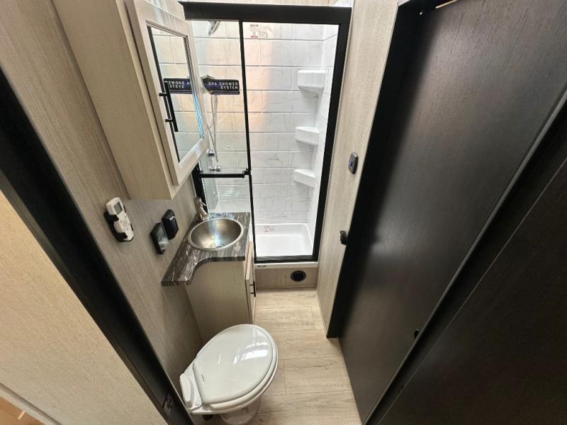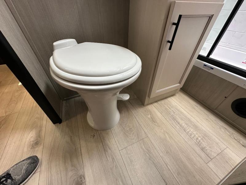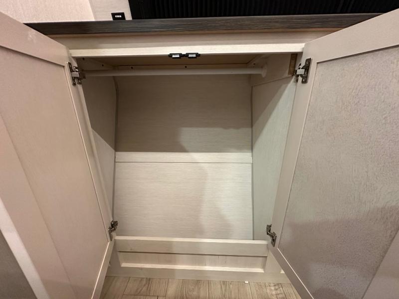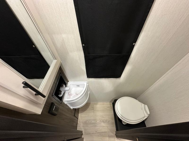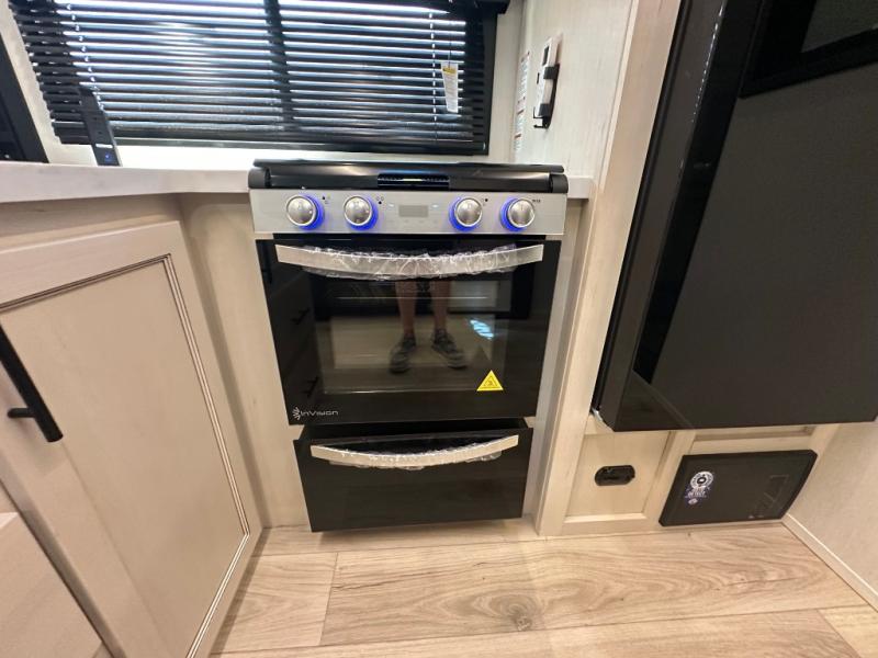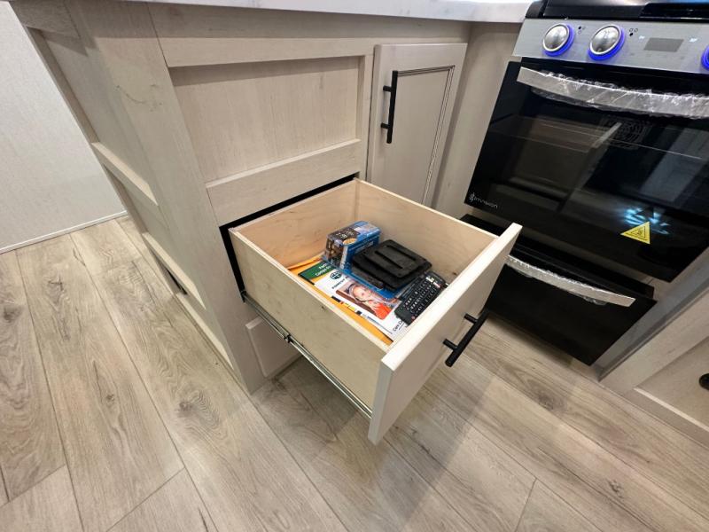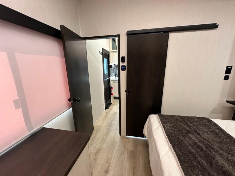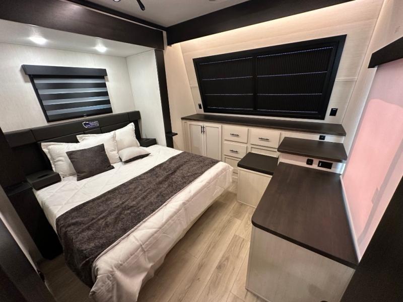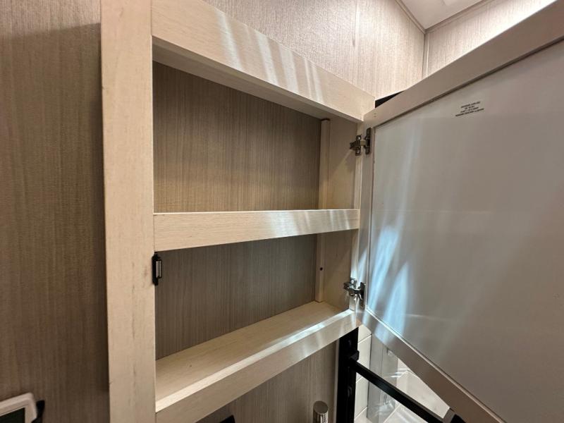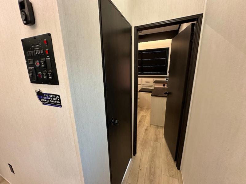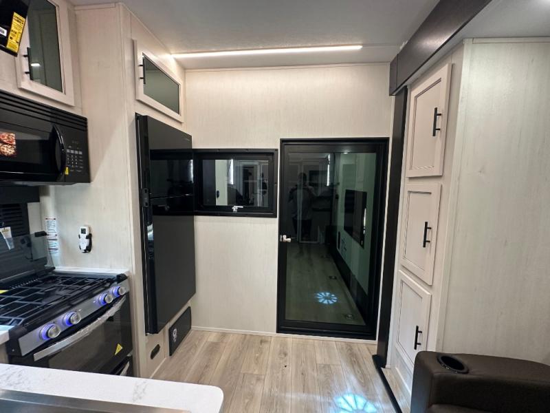 This double slide out toy hauler is ready for adventure when you are! Once your toys are unloaded from the separate garage, you can set up the flip-up sofas or set up the drop-down queen bed for guests to sleep on, and there is even a half bath here for added convenience. You'll enjoy the front private bedroom all to yourselves that includes a king bed slide and a large dresser to keep your things organized. The combined kitchen and living area includes a three burner range and 30" microwave to make meals, a sofa with recliners to relax on, plus a 12V refrigerator and pantry for food storage.