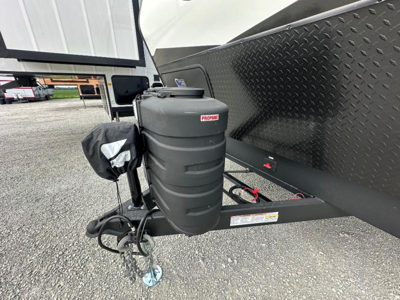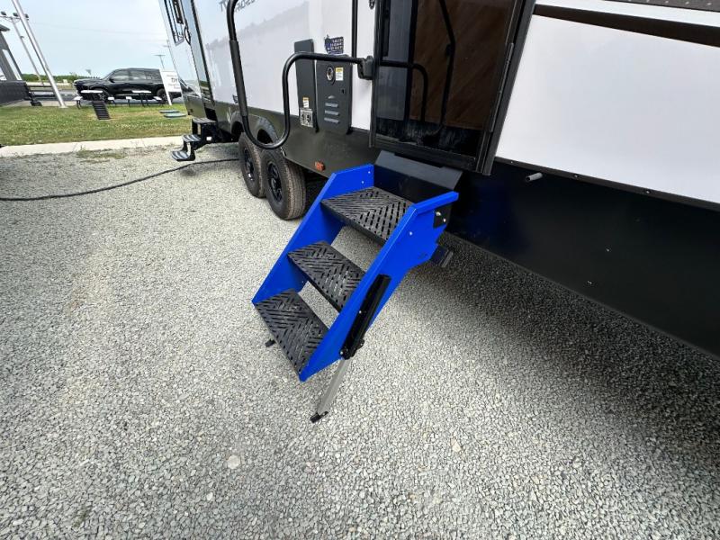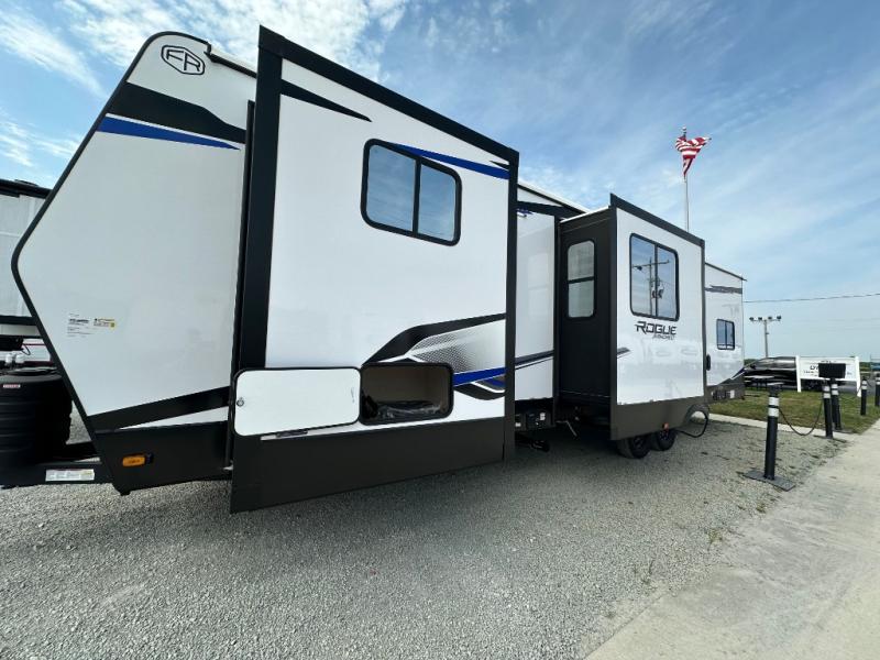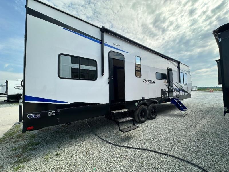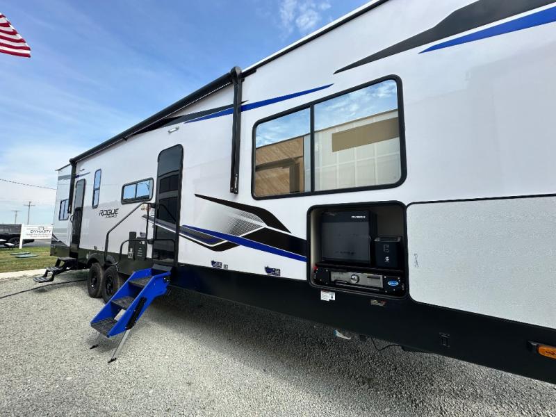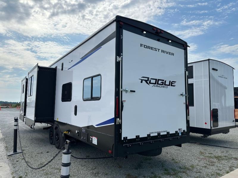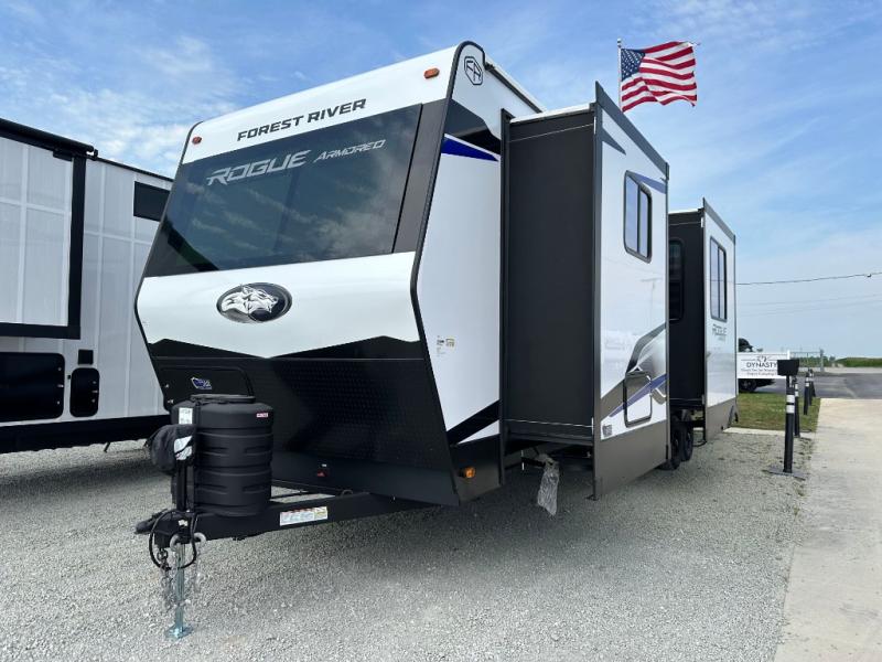 Every one of these Forest River Vengeance Rogue Armored travel trailer toy haulers come with the features you want most at an affordable price tag! The DuraPoxy gas/oil resistant floor has 5,000 lb. tie downs to ensure your toys will arrive safely without damaging the flooring, plus the 3,000 lb. rated ramp door makes it easy to load them. A 15,000 BTU A/C will keep you cool even on the hottest summer days, and an Armored underbelly helps keep your unit's vitals protected. The Rogue Ready package comes a fuel station with a pump, a ramp door patio system, a TST tire pressure monitoring system, and many more stand-out features. And don't overlook the Rogue Premium Package with an 8' weatherproof ramp door, an exterior TV hookup for the option to add a television, blue accent wheels, and solar reflective safety glass windows to name a few conveniences.