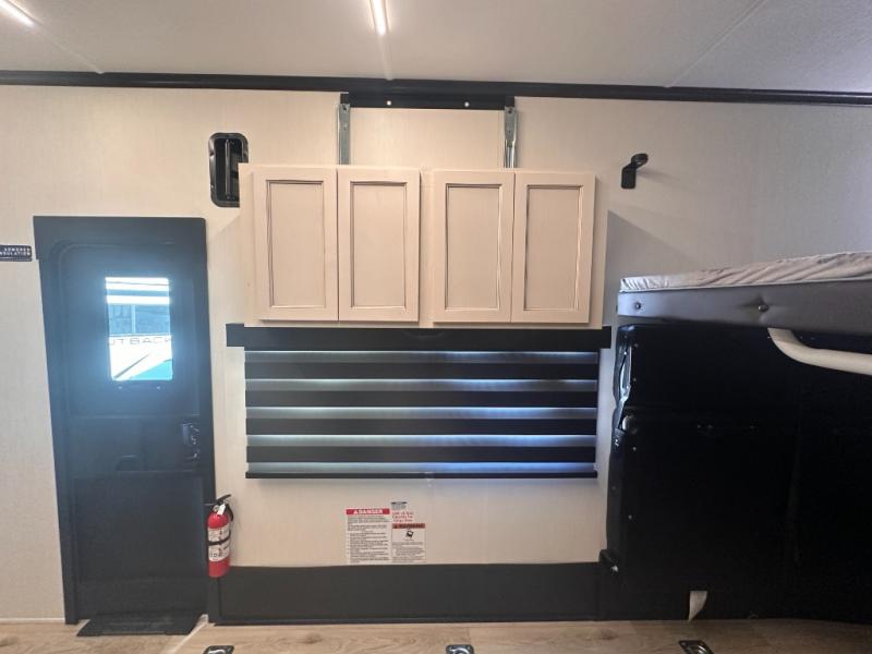 This double slide out toy hauler is ready for adventure when you are! Once your toys are unloaded from the separate garage, you can set up the flip-up sofas or set up the drop-down queen bed for guests to sleep on, and there is even a half bath here for added convenience. You'll enjoy the front private bedroom all to yourselves that includes a king bed slide and a large dresser to keep your things organized. The combined kitchen and living area includes a three-burner range and 30" microwave to make meals, a sofa with recliners to relax on, plus a 12V refrigerator and pantry for food storage.