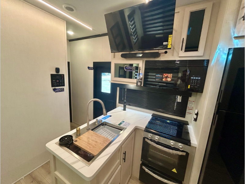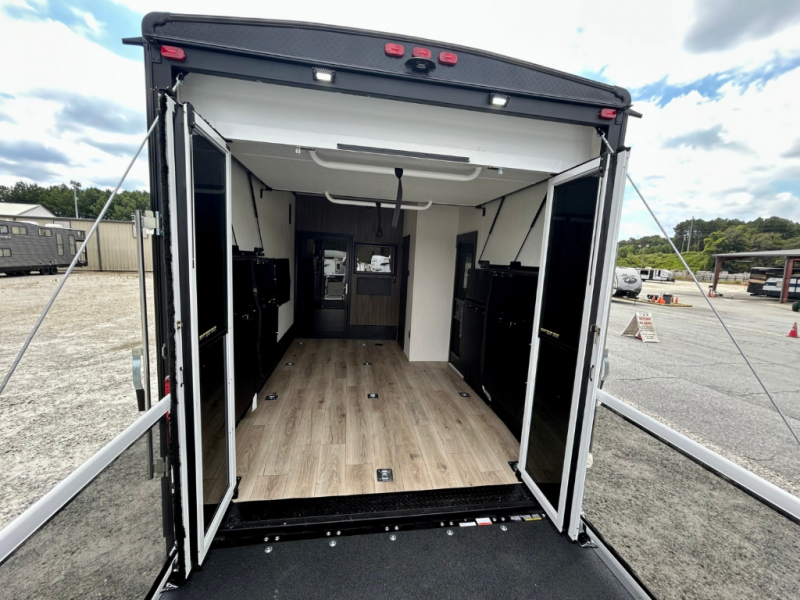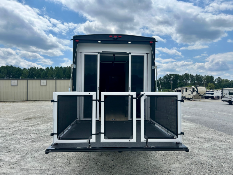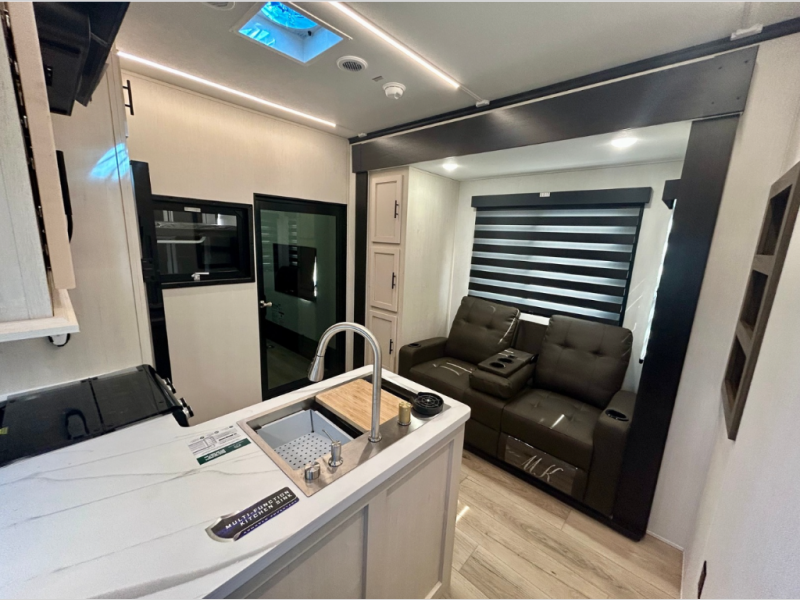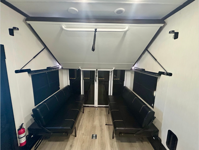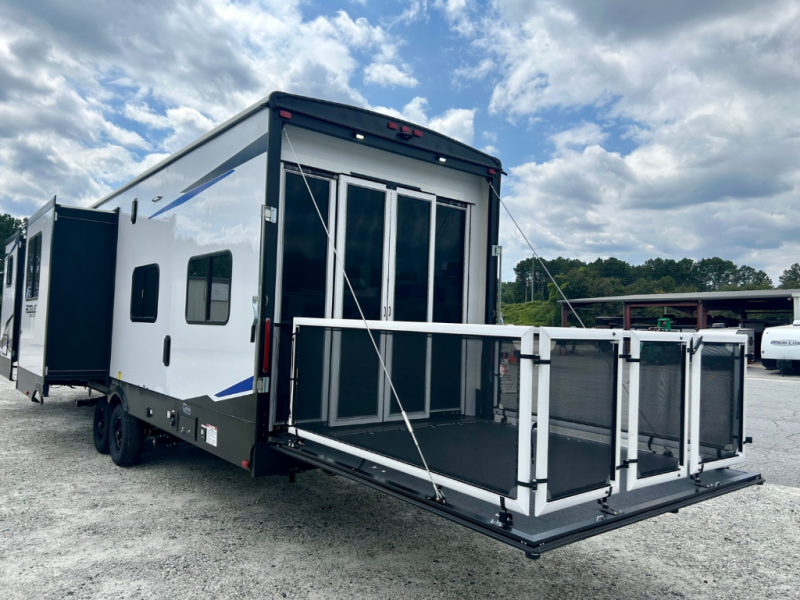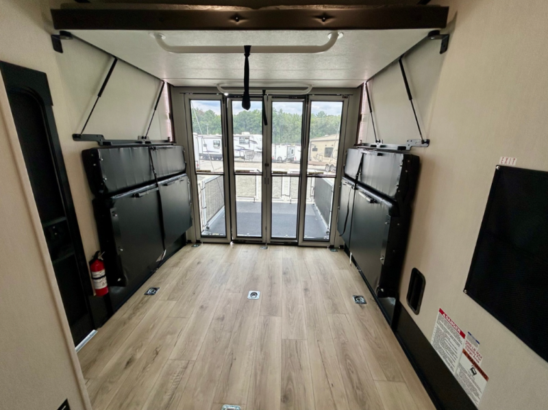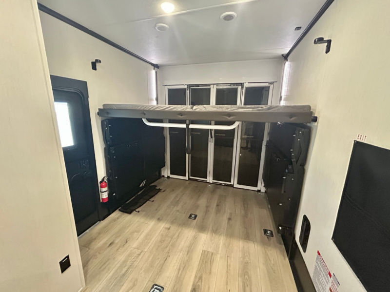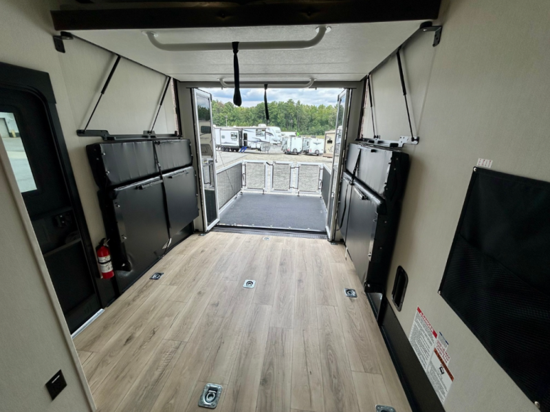 This double slide out toy hauler is ready for adventure when you are! Once your toys are unloaded from the separate garage, you can set up the flip-up sofas or set up the drop-down queen bed for guests to sleep on, and there is even a half bath here for added convenience. You'll enjoy the front private bedroom all to yourselves that includes a king bed slide and a large dresser to keep your things organized. The combined kitchen and living area includes a three burner range and 30" microwave to make meals, a sofa with recliners to relax on, plus a 12V refrigerator and pantry for food storage.