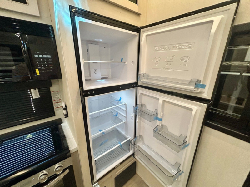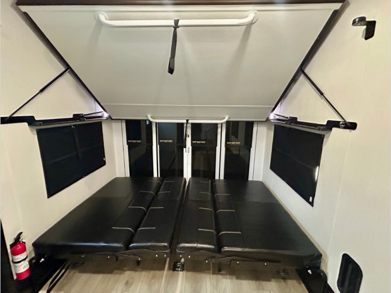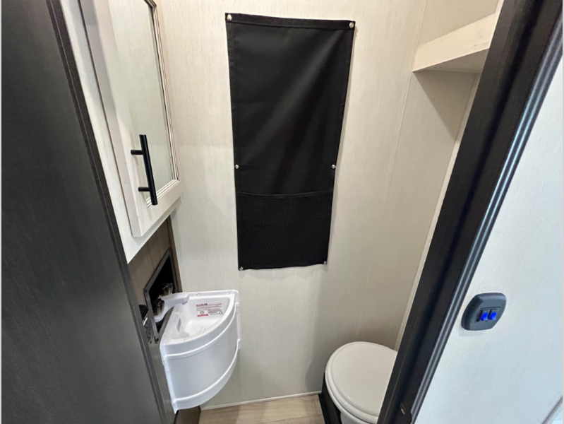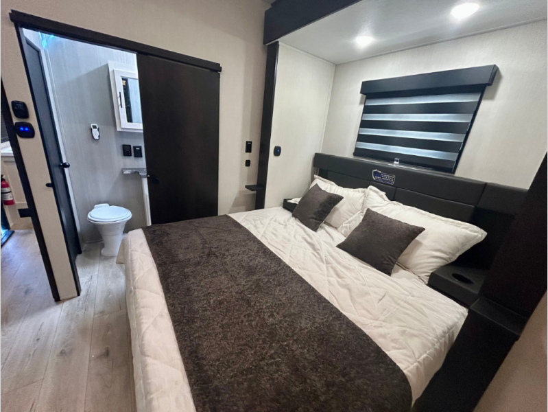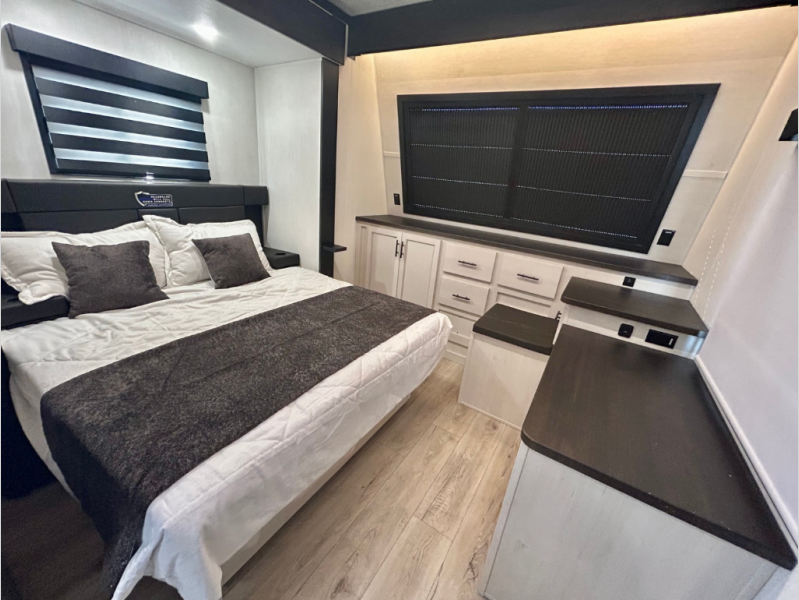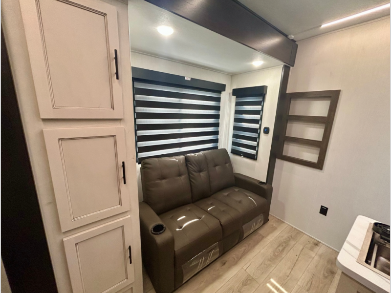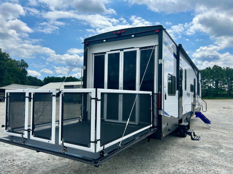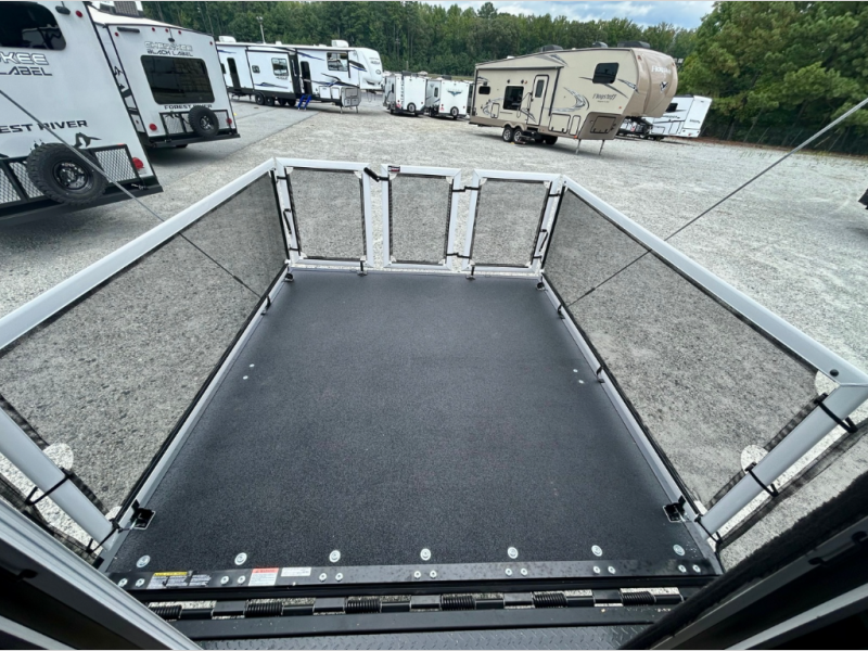 This double slide out toy hauler is ready for adventure when you are! Once your toys are unloaded from the separate garage, you can set up the flip-up sofas or set up the drop-down queen bed for guests to sleep on, and there is even a half bath here for added convenience. You'll enjoy the front private bedroom all to yourselves that includes a king bed slide and a large dresser to keep your things organized. The combined kitchen and living area includes a three burner range and 30" microwave to make meals, a sofa with recliners to relax on, plus a 12V refrigerator and pantry for food storage.