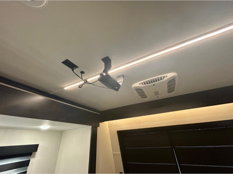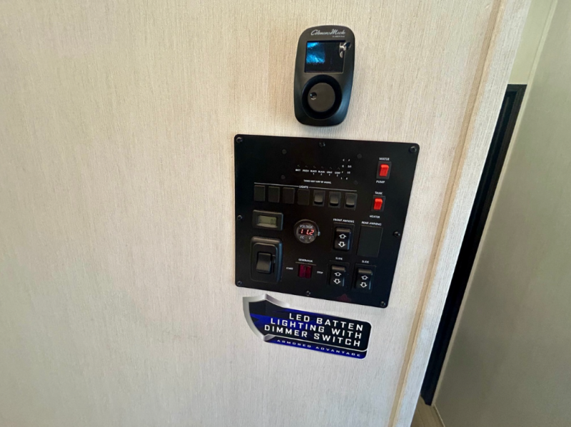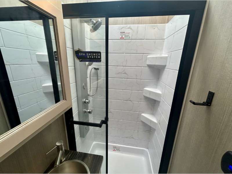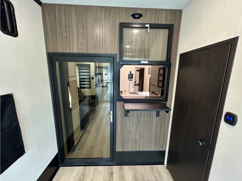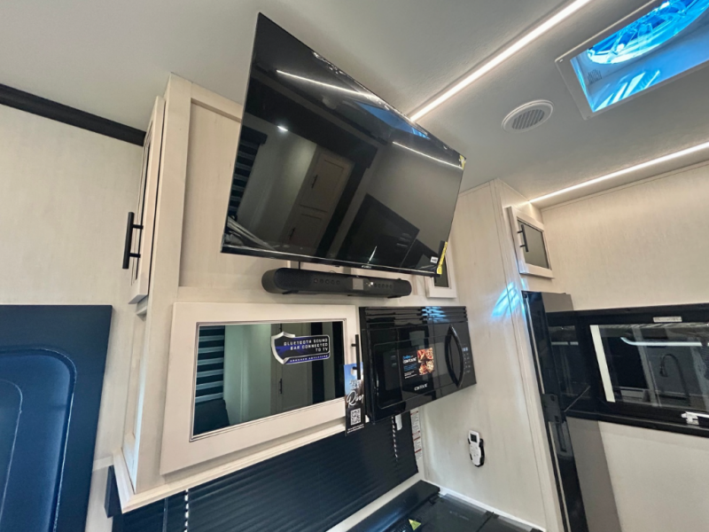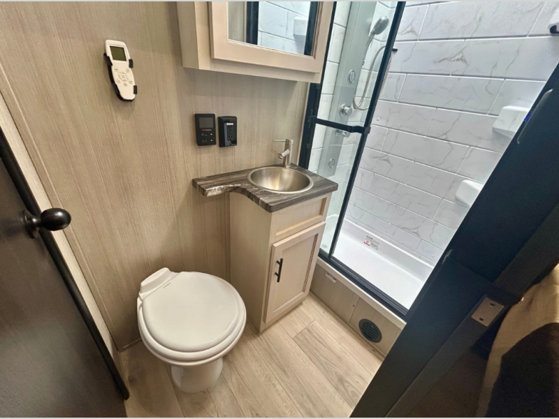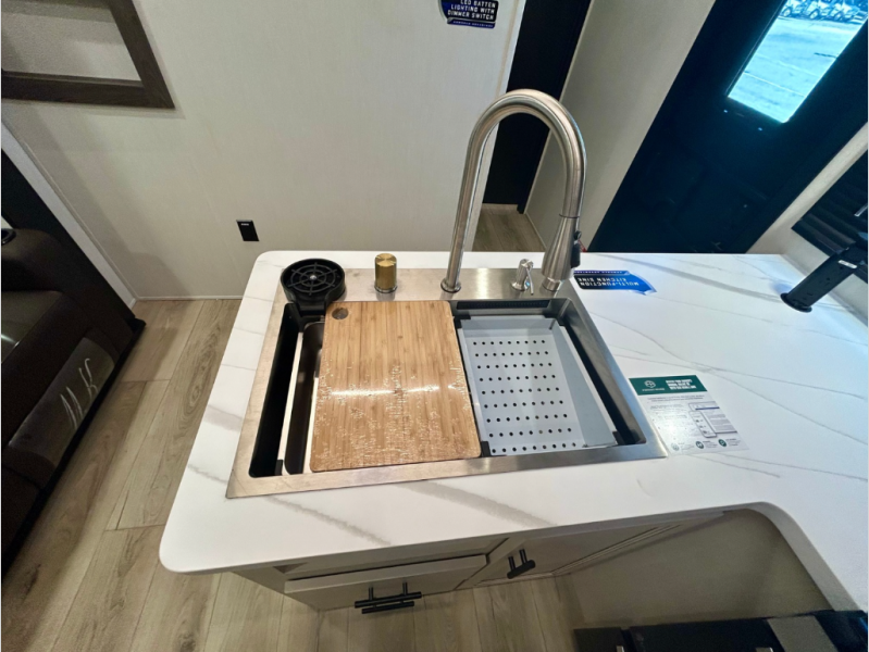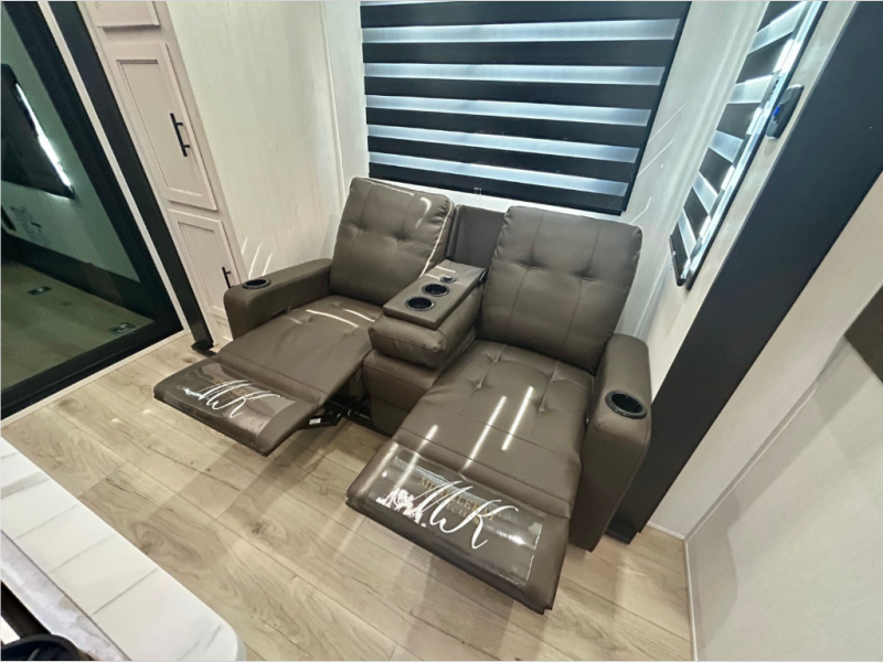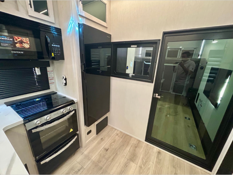 This double slide out toy hauler is ready for adventure when you are! Once your toys are unloaded from the separate garage, you can set up the flip-up sofas or set up the drop-down queen bed for guests to sleep on, and there is even a half bath here for added convenience. You'll enjoy the front private bedroom all to yourselves that includes a king bed slide and a large dresser to keep your things organized. The combined kitchen and living area includes a three burner range and 30" microwave to make meals, a sofa with recliners to relax on, plus a 12V refrigerator and pantry for food storage.