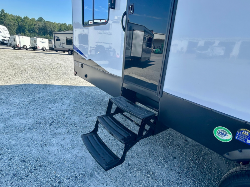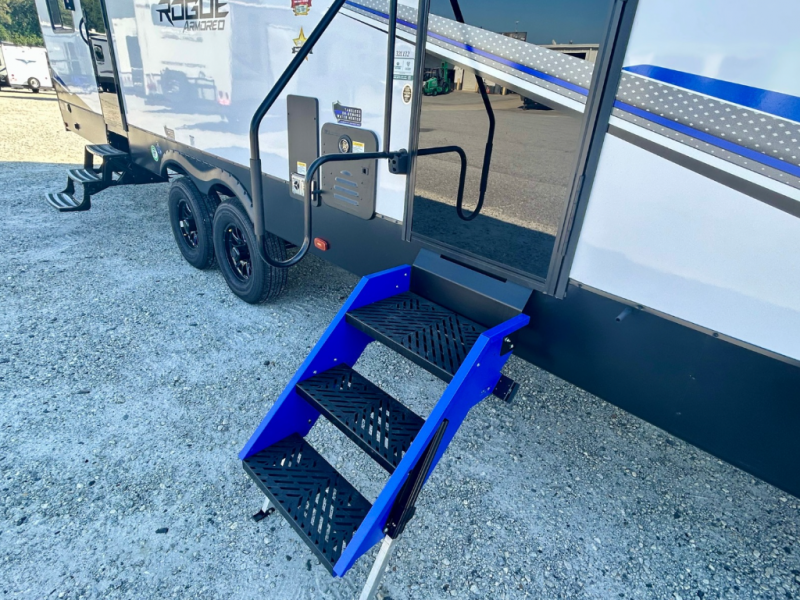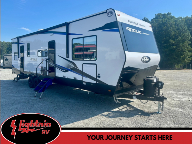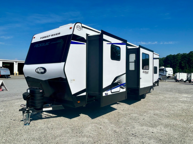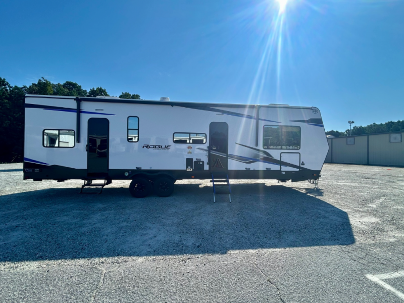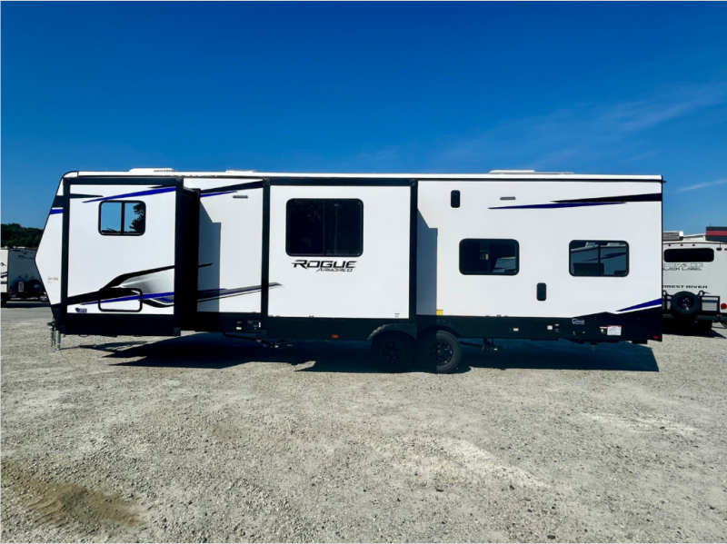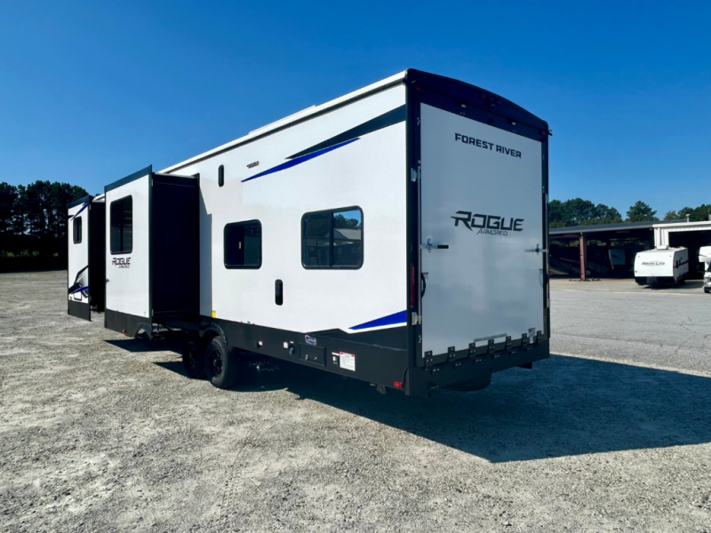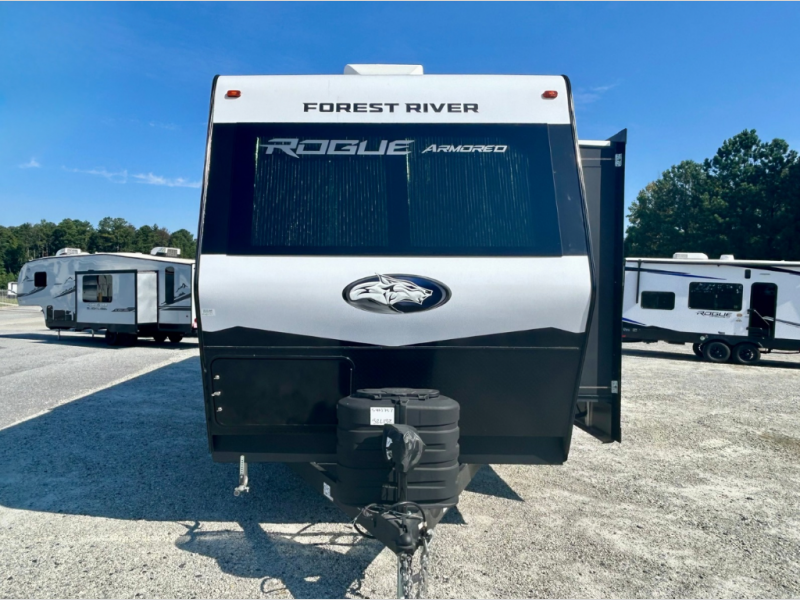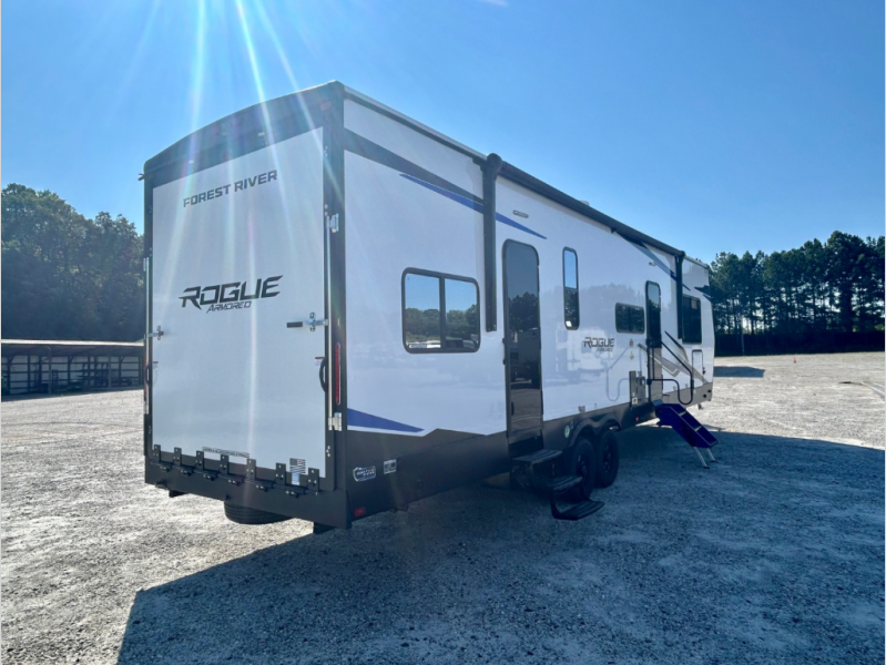 Every one of these Forest River Vengeance Rogue Armored travel trailer toy haulers come with the features you want most at an affordable price tag! The DuraPoxy gas/oil resistant floor has 5,000 lb. tie downs to ensure your toys will arrive safely without damaging the flooring, plus the 3,000 lb. rated ramp door makes it easy to load them. A 15,000 BTU A/C will keep you cool even on the hottest summer days, and an Armored underbelly helps keep your unit's vitals protected. The Rogue Ready package comes a fuel station with a pump, a ramp door patio system, a TST tire pressure monitoring system, and many more stand-out features. And don't overlook the Rogue Premium Package with an 8' weatherproof ramp door, an exterior TV hookup for the option to add a television, blue accent wheels, and solar reflective safety glass windows to name a few conveniences.
