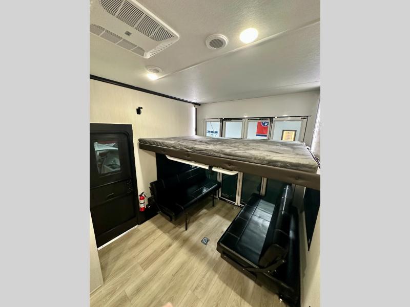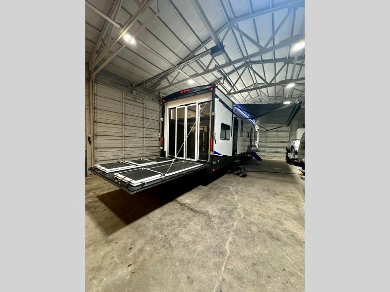 This double slide out toy hauler is ready for adventure when you are! Once your toys are unloaded from the separate garage, you can set up the flip-up sofas or set up the drop-down queen bed for guests to sleep on, and there is even a half bath here for added convenience. You'll enjoy the front private bedroom all to yourselves that includes a king bed slide and a large dresser to keep your things organized. The combined kitchen and living area includes a three-burner range and 30" microwave to make meals, a sofa with recliners to relax on, plus a 12V refrigerator and pantry for food storage.