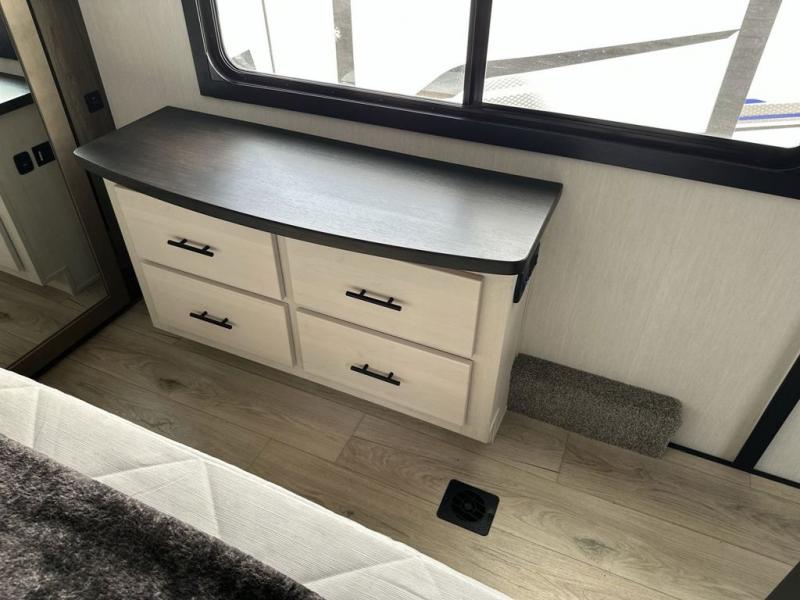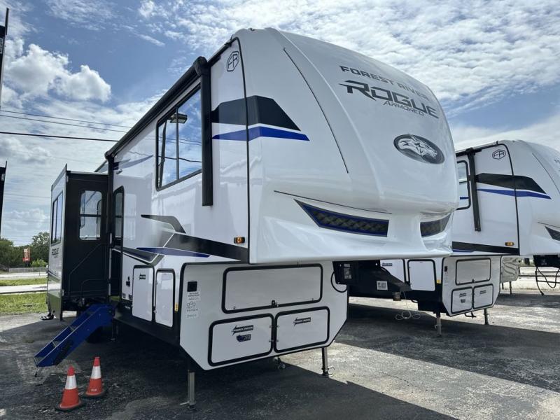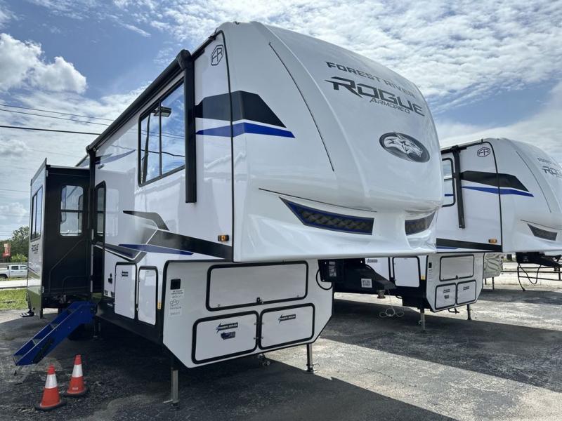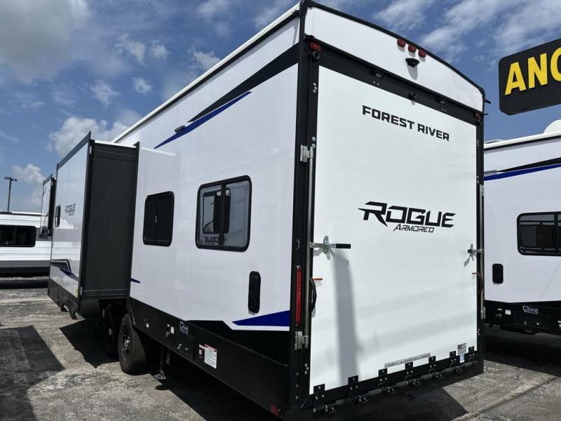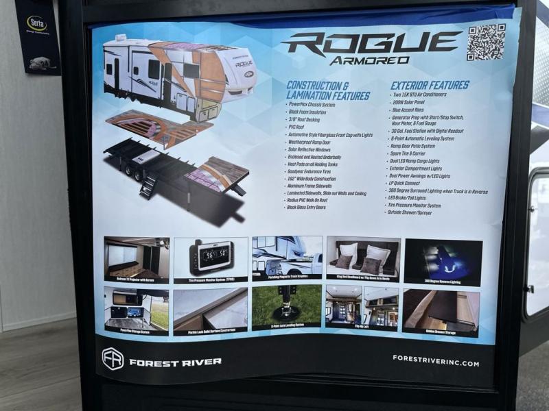 Every one of these Forest River Vengeance Rogue Armored fifth wheel toy haulers come with the features you want most at an affordable price tag! The DuraPoxy gas/oil resistant floor has 5,000 lb. tie downs to ensure your toys will arrive safely without damaging the flooring, plus the 3,000 lb. rated ramp door makes it easy to load them. Two 15,000 BTU A/Cs are "Super H Ducted" to keep you cool even on the hottest summer days, and an Armored underbelly helps keep your unit's vitals protected. The Rogue Ready package comes with a six point leveling system, a power MAXX storage system, a TST tire pressure monitoring system, and many more stand-out features. And don't overlook the Rogue Premium Package with an 8' weatherproof ramp door, an exterior TV hookup for the option to add a television, blue accent wheels, and solar reflective safety glass windows to name a few conveniences.